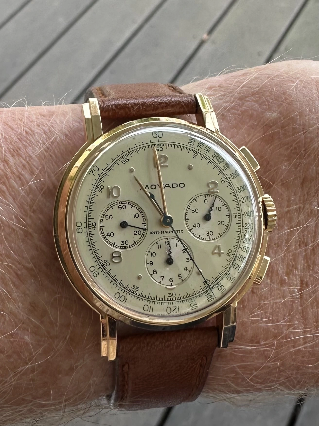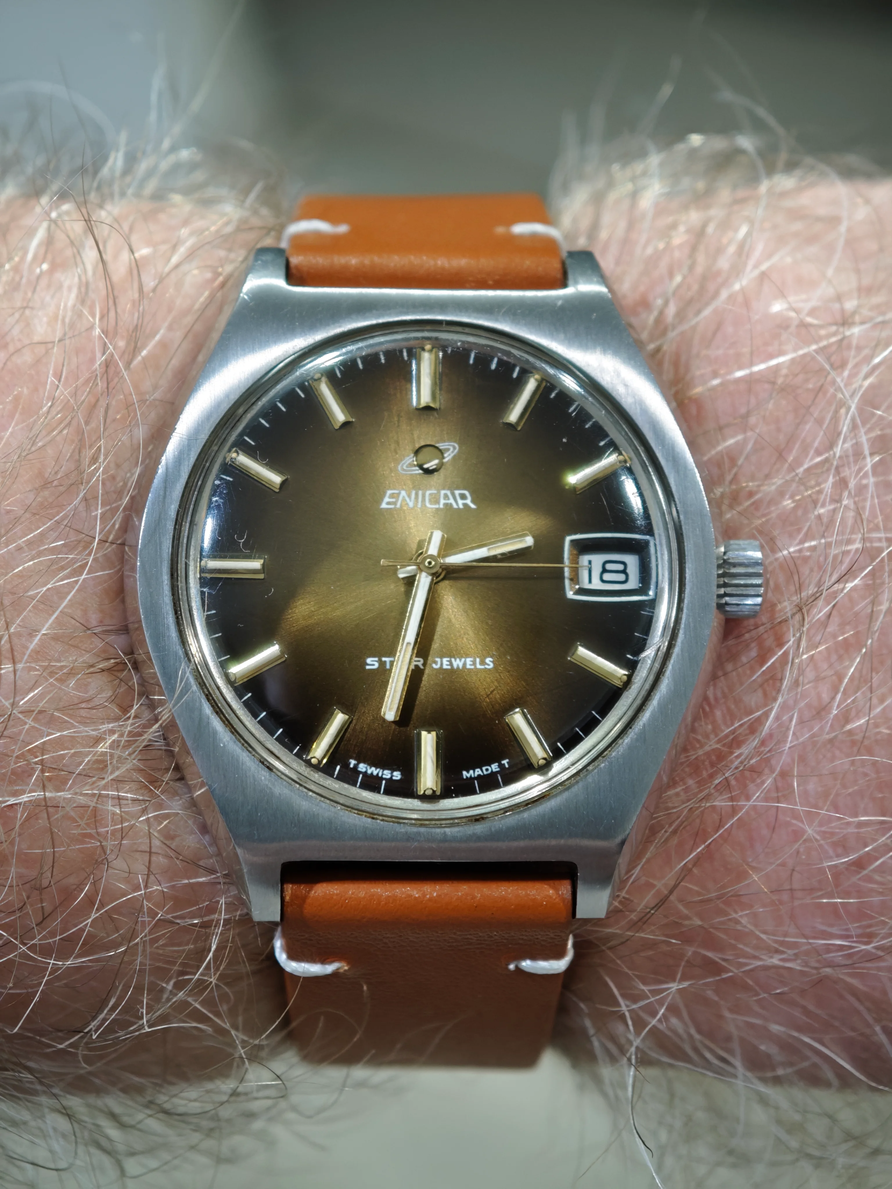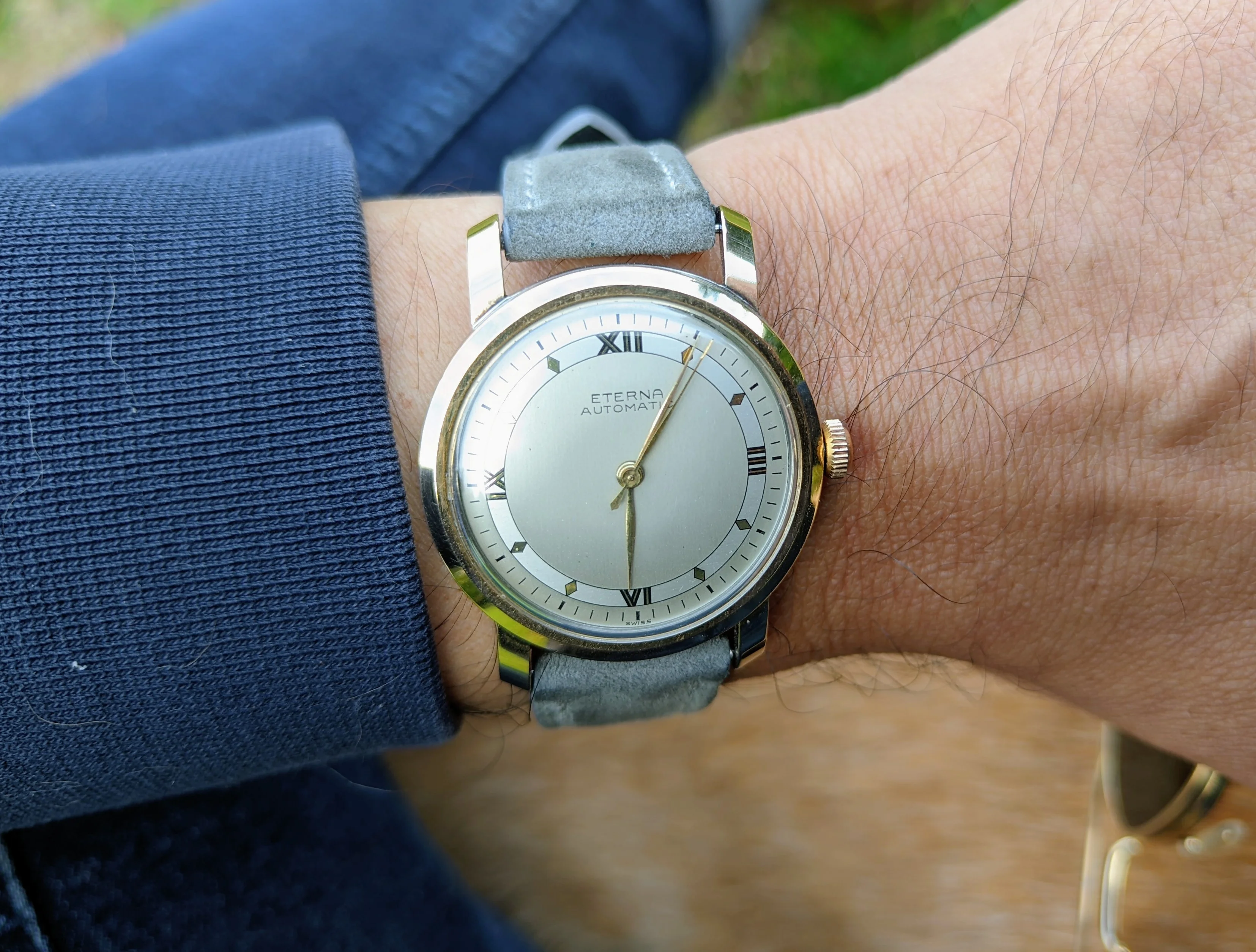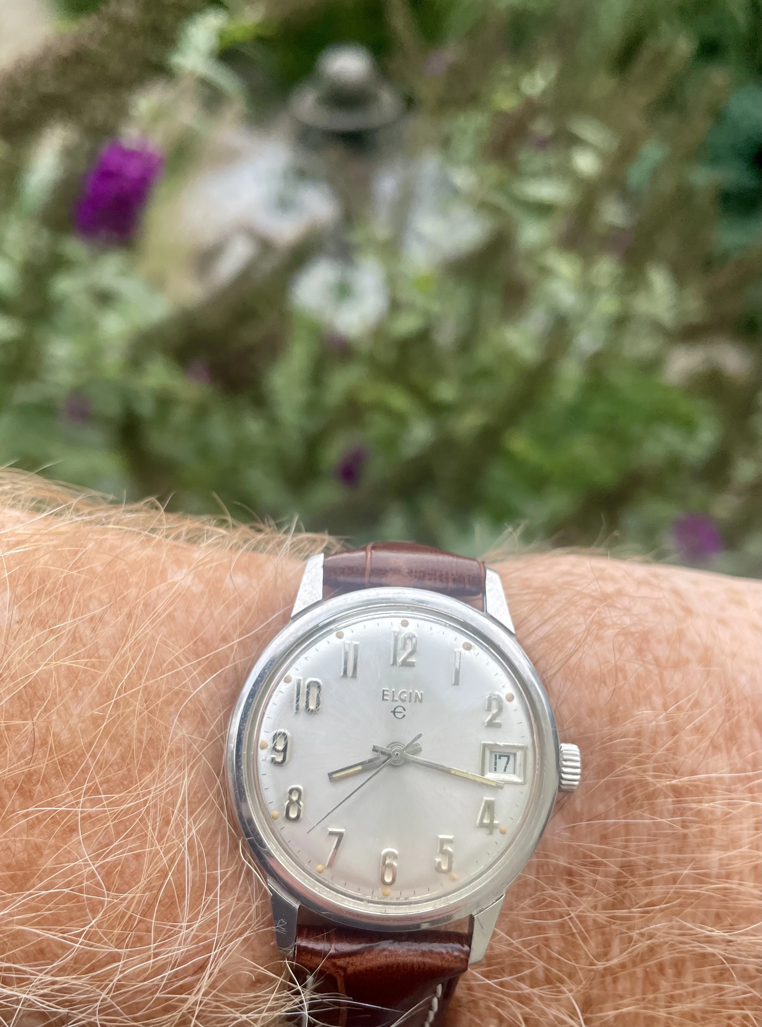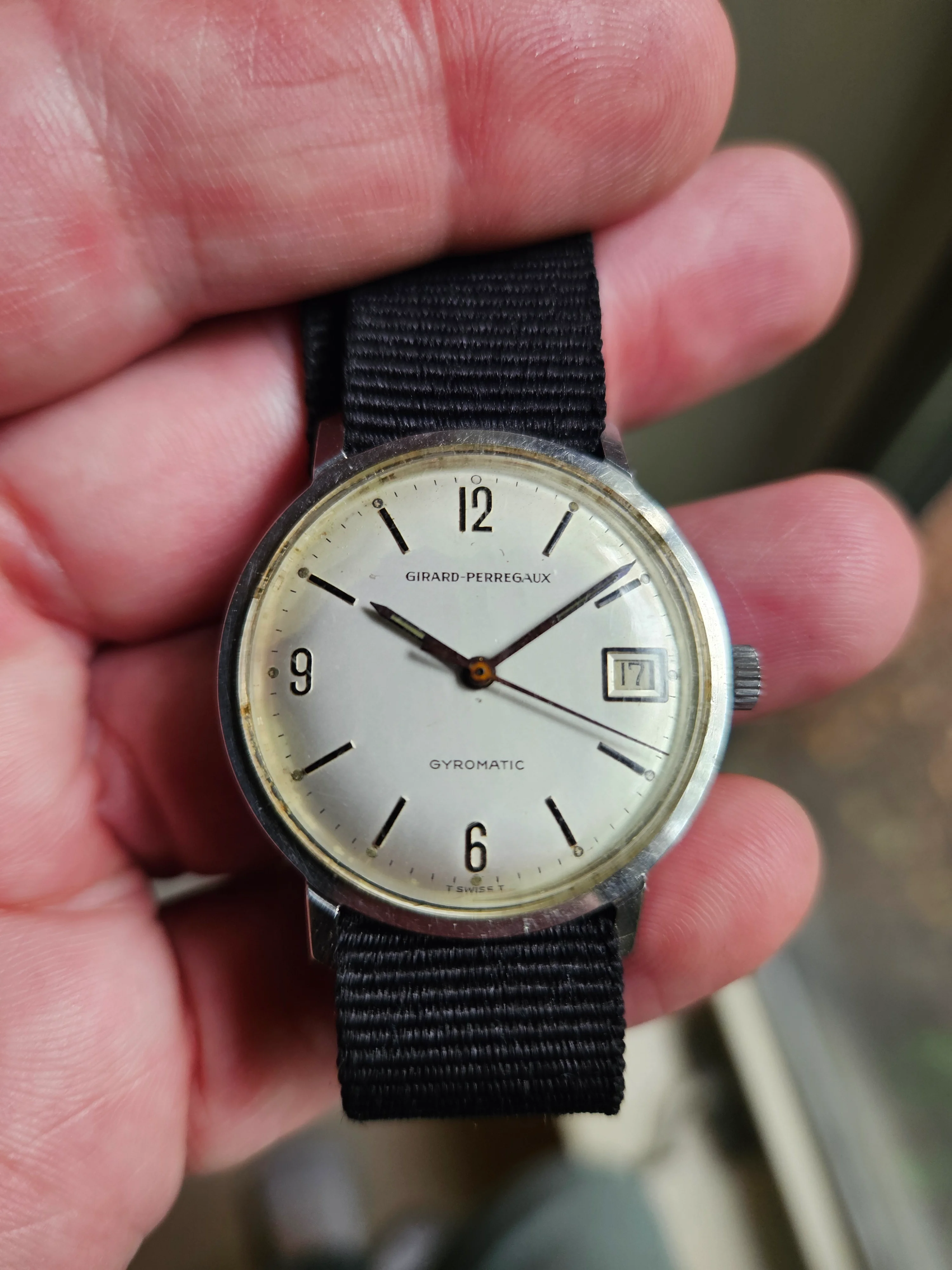 The 6th of my summer watch finds, what I believe to be a early 60's Girard Perregaux with a gyromatic movement. I bought it at the thrift shop for $5 because when I shook it the second hand started moving and I know this movement is highly respected and I didn't have one. Full disclosure: the minute hand doesn't consistently sweep as it has a loose cannon pinion. It will go to my semi retired and very reasonable watchmaker tomorrow. He still charges me $65 for automatic movement services. So, eventually I will have $70 in this watch, but I think it will be worth 3 times as much and still a good buy. I also think this dial and hands are very legible and the watch will be a keeper. Sorry about the long write up.