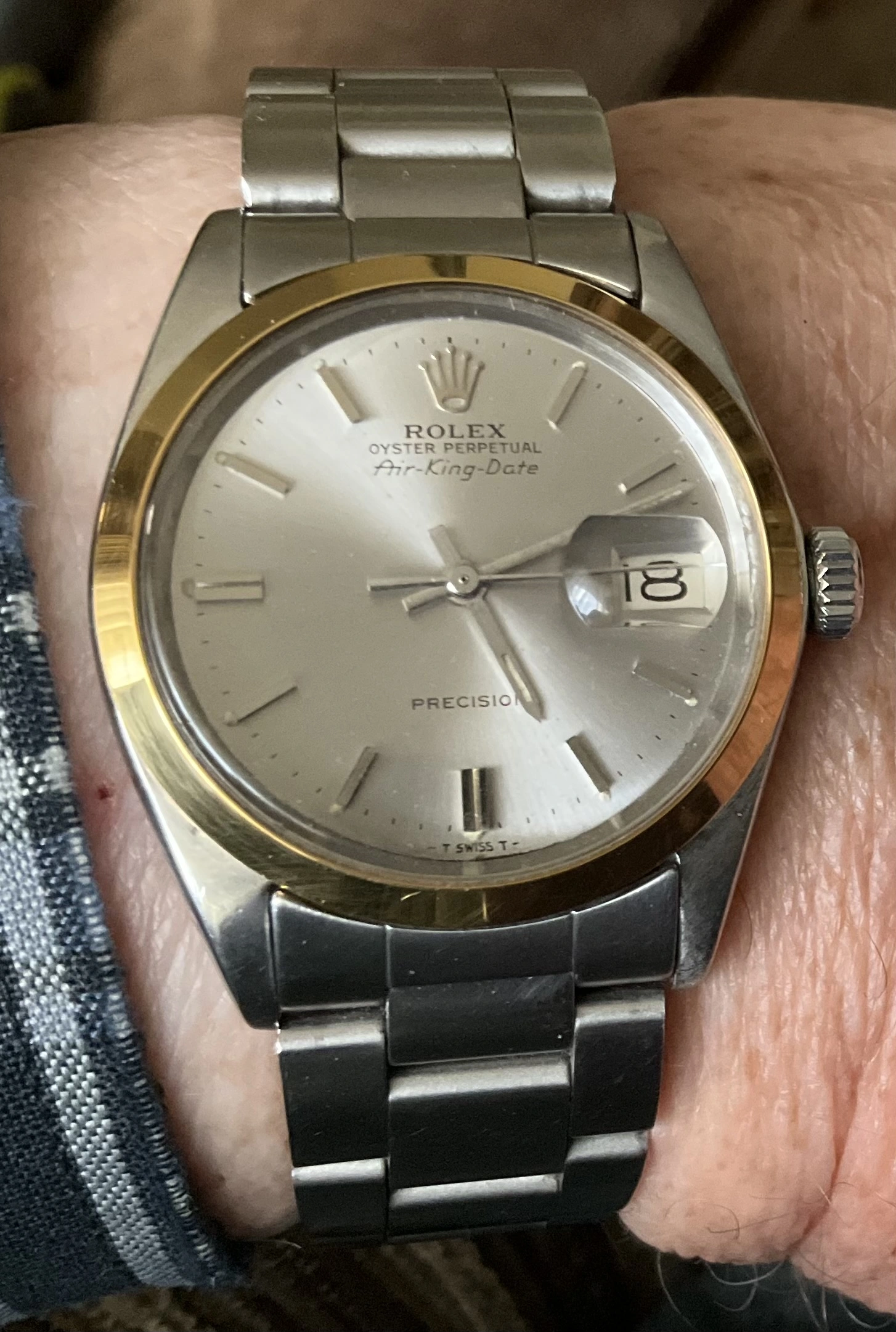 Posts 15,319 Likes 45,066 Canuck ·Sep 18, 2025 My one owner, (me), mildly modded Air King Date Perpetual (replaced the steel bezel with a NOS genuine 14-karat Rolex bezel). 55 years old, this year. Still performs like new. After market bracelet, since the original one gave up the ghost.