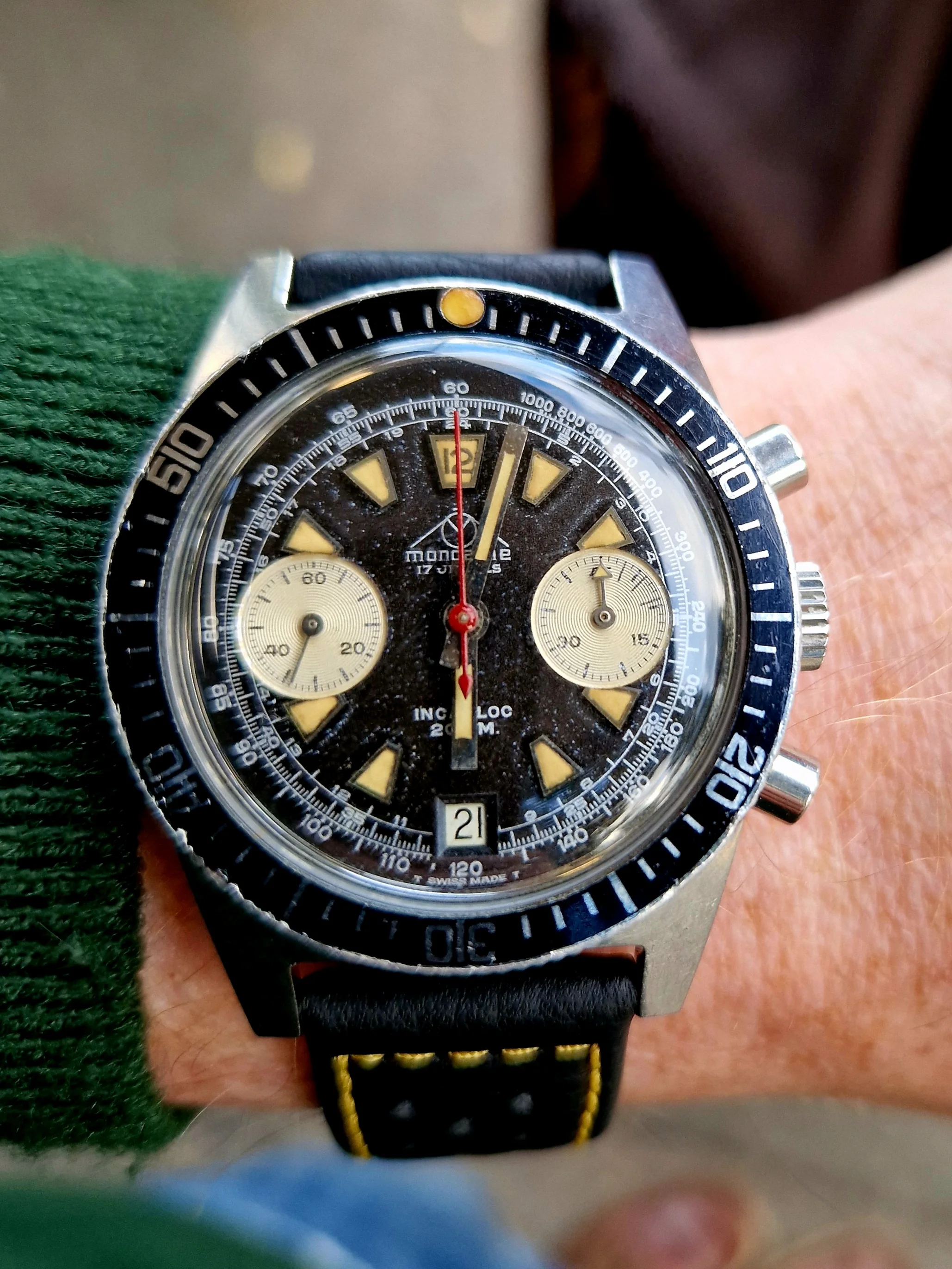 Posts 1,090 Likes 7,033 Dr.Sascha ·Sep 21, 2025 New acquisition. Slightly tropicalized Mondaine w/trapezoidal indices in the classic ref. 2004 dive-chrono case.