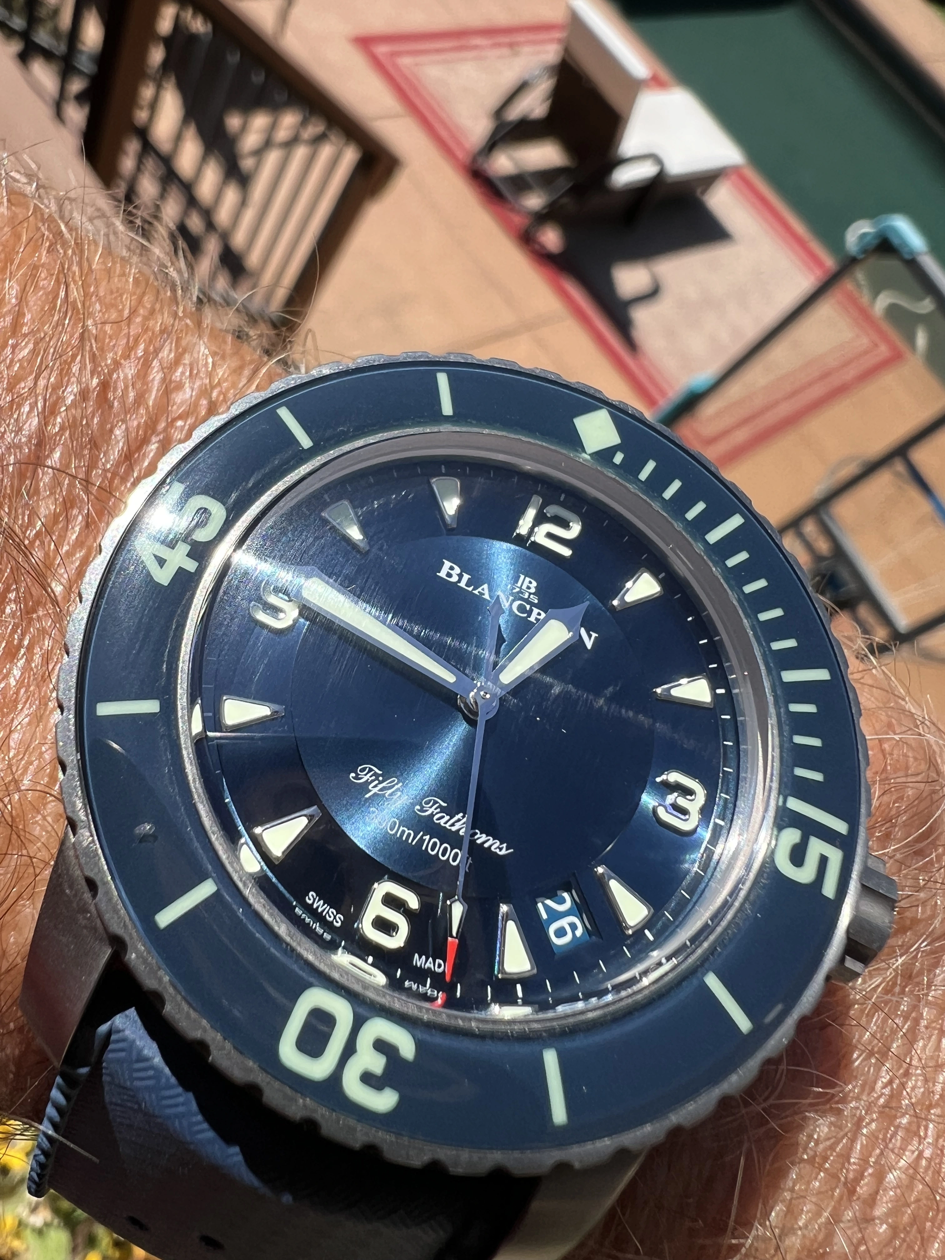 I really like those. I got approval from my accountant (wife) to get one when I found them availible on the grey market significantly under MSRP. Unfortunately for me it was only the 43mm in stock. I can do 42mm but just prefer a little smaller watch. I know that model is in 3 sizes I think. Anyway it just looks great to me. I really appreciate Blancpain. Enjoy. Great looker.