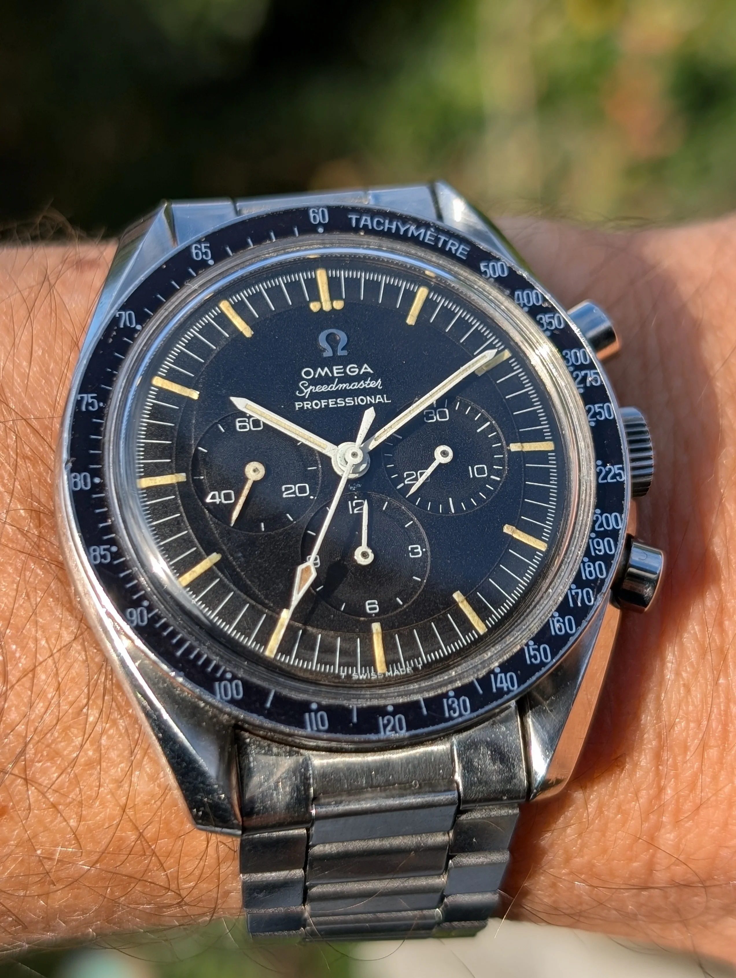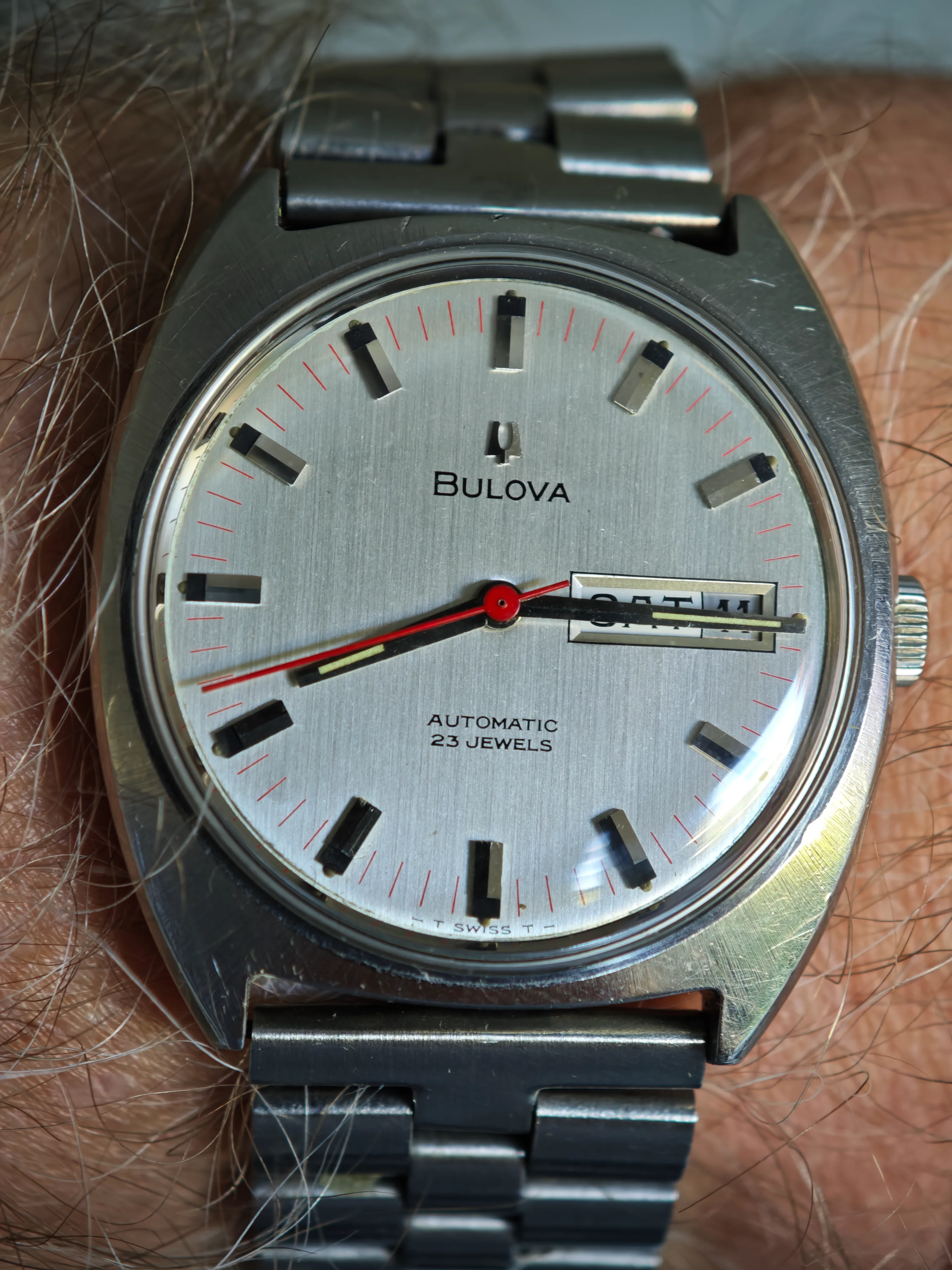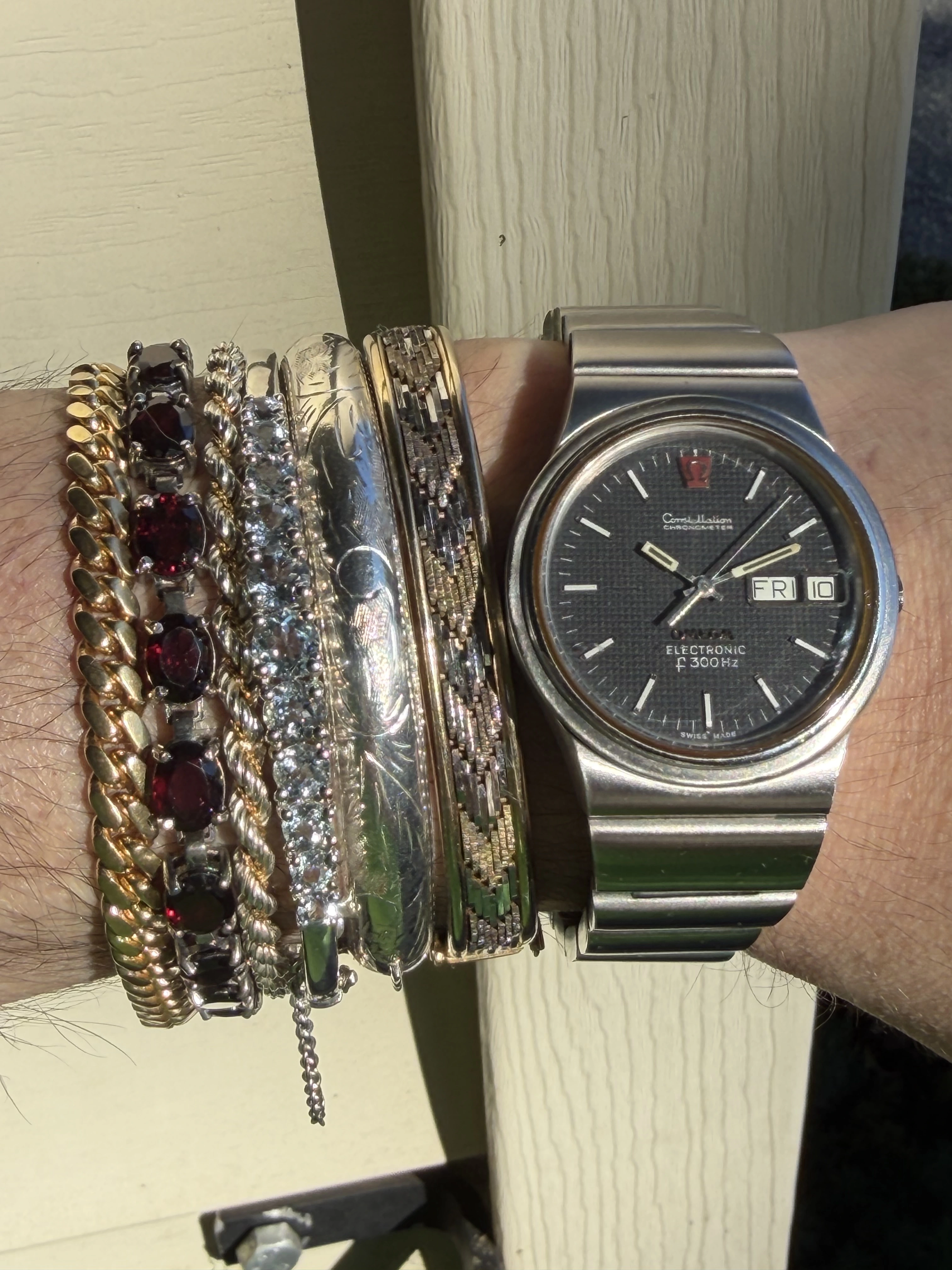 Someone mentioned “hummers” earlier. I thought “why not”. I’d worn my 54-year old Rolex Oyster Perpetual Air-King Date for several weeks, since I serviced it. I settled on my 61 year old Bulova Accutron. This one came to me from @Laneside in Scotland who’d worn it some, but had the misfortune of getting it wet! When it arrived, it was rusty. I serviced the original movement, but I didn’t succeed in returning it to health. I went to my movement bank and selected a replacement movement which I returned to health. This Accutron is unlike any I recall having seen before. The case is gold shell over stainless, and appears to have had little wear. ❤️ it!