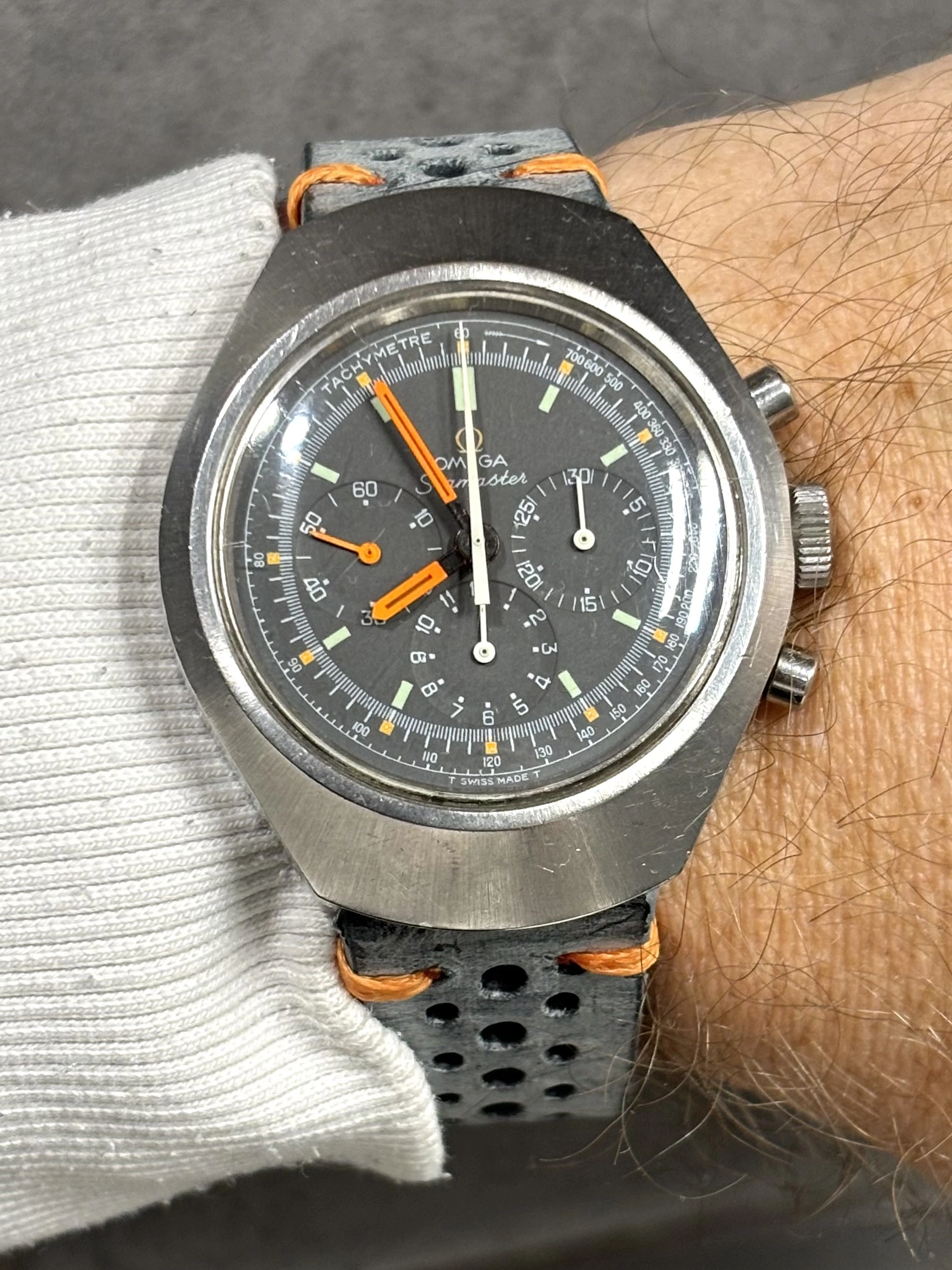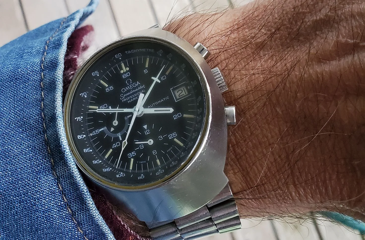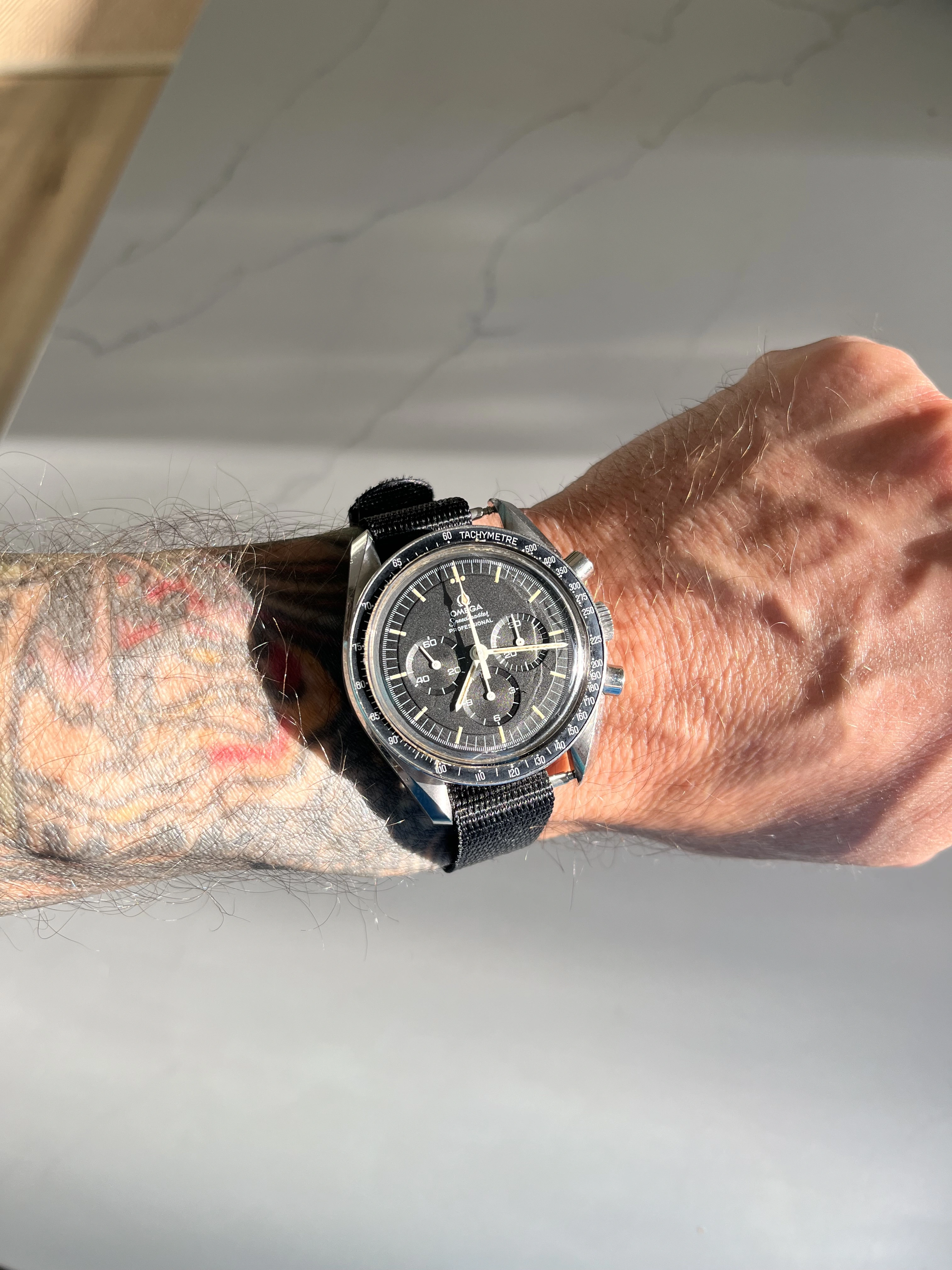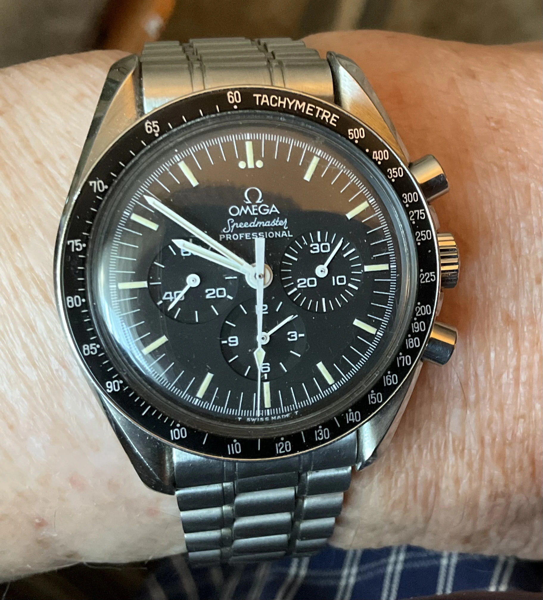 Time for a change from the two wrist watches I’d worn for a week or so (two Omegas as it happens). While rummaging through my collection, my eyes landed on my one owner (me) Speedmaster 345.0808. Why not, thought I? After all, it is Tuesday. I’ve owned this watch for 35 years, and only today, I spied an irregularity about it that would cause hand wringing among some collectors! Cudos to those who spot the irregularity!