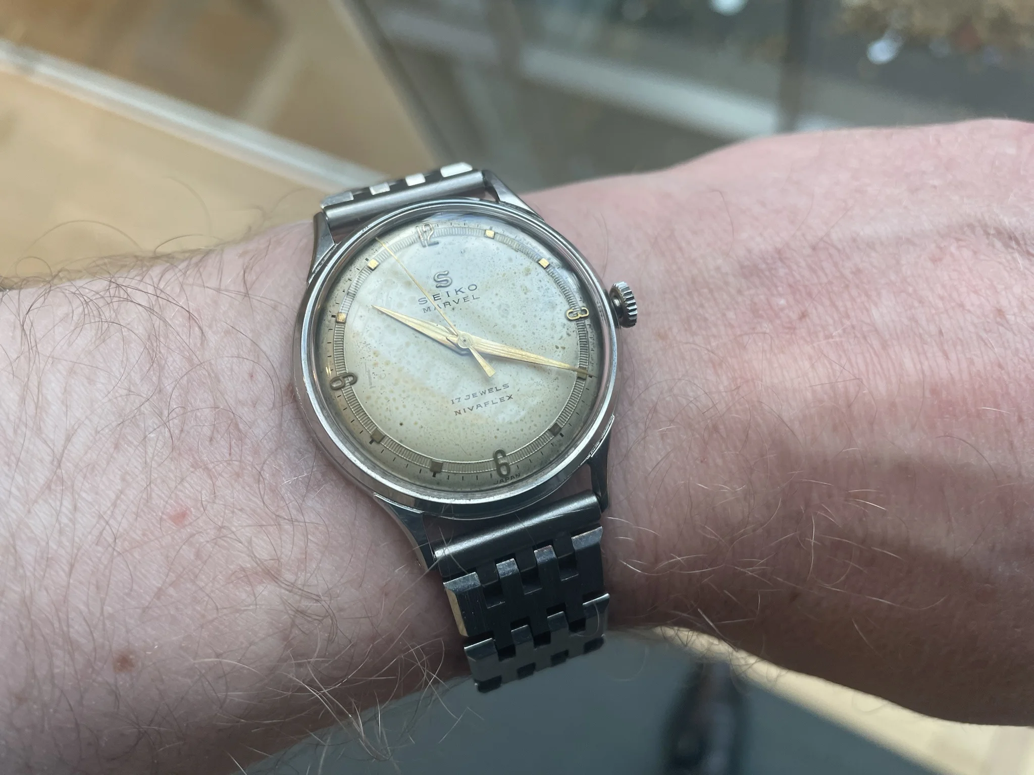 Not the cleanest looking dial perhaps, but one of my favourites. A Marvel from the first month of production with a very low serial number. I like to tell myself it's one of the first completely in house watches Seiko ever made, but that could be my imagination.