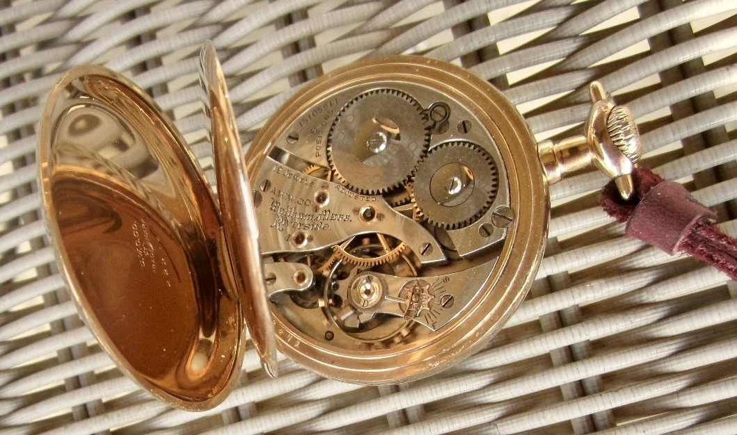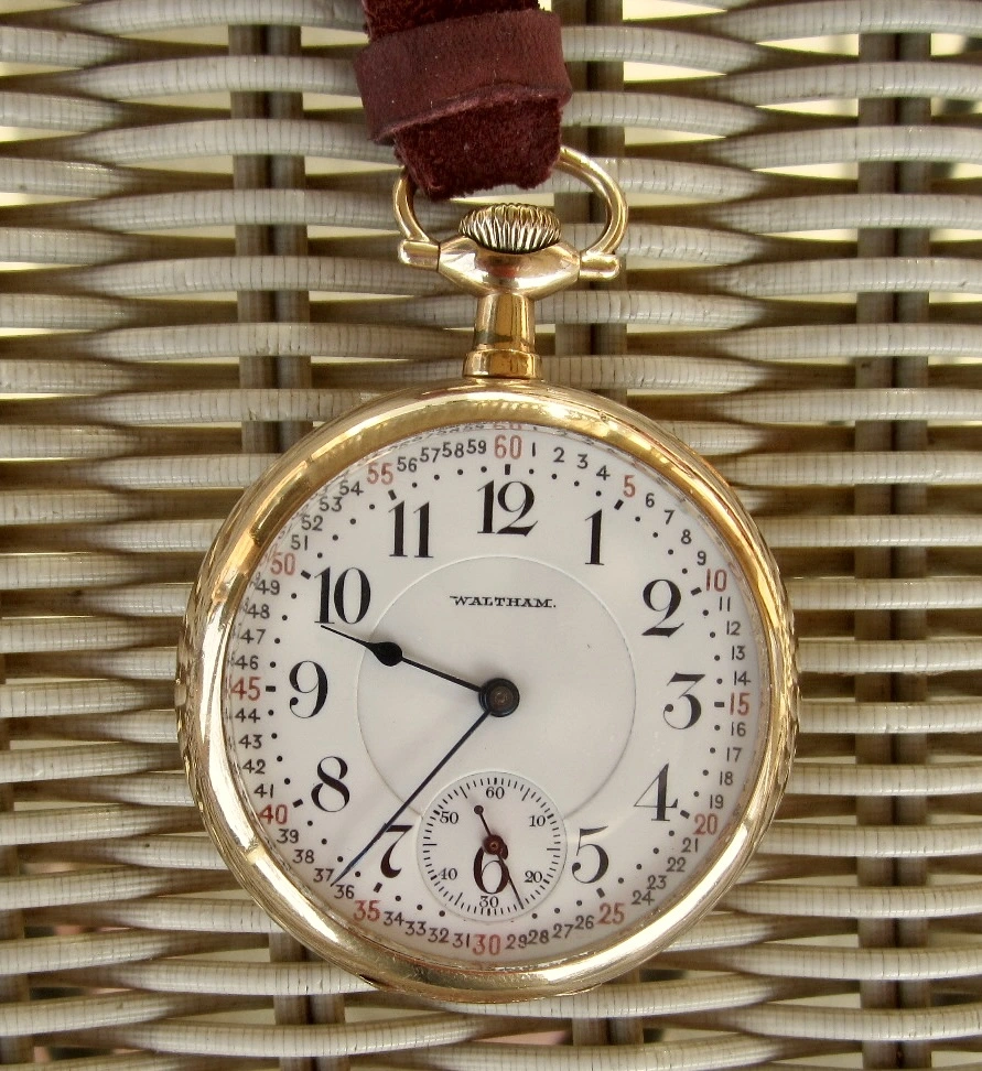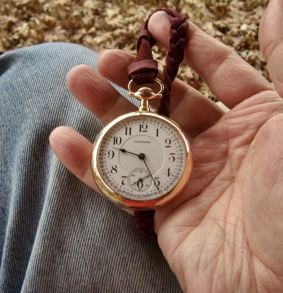 Today a 1906 19-jewel Waltham Riverside riding in the jeans' watch pocket while getting the house ready. An oxblood DaveK Mystery Braid lanyard nicely complements the rose gold filled case.