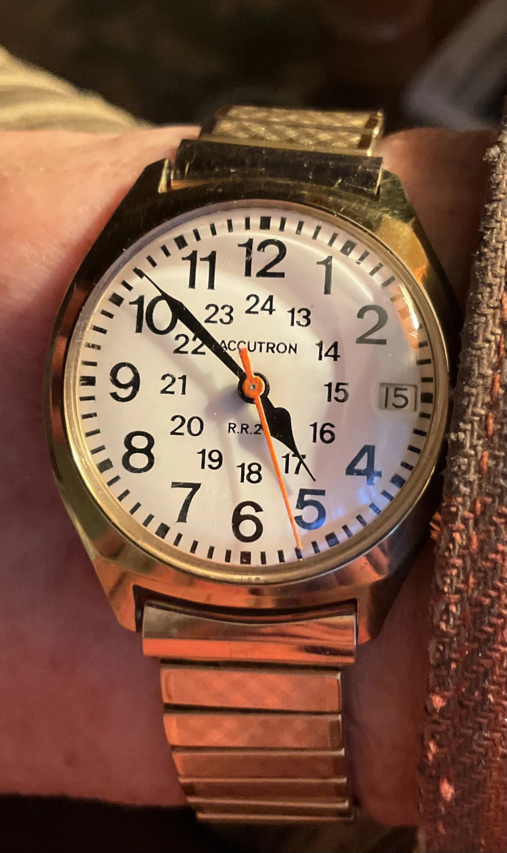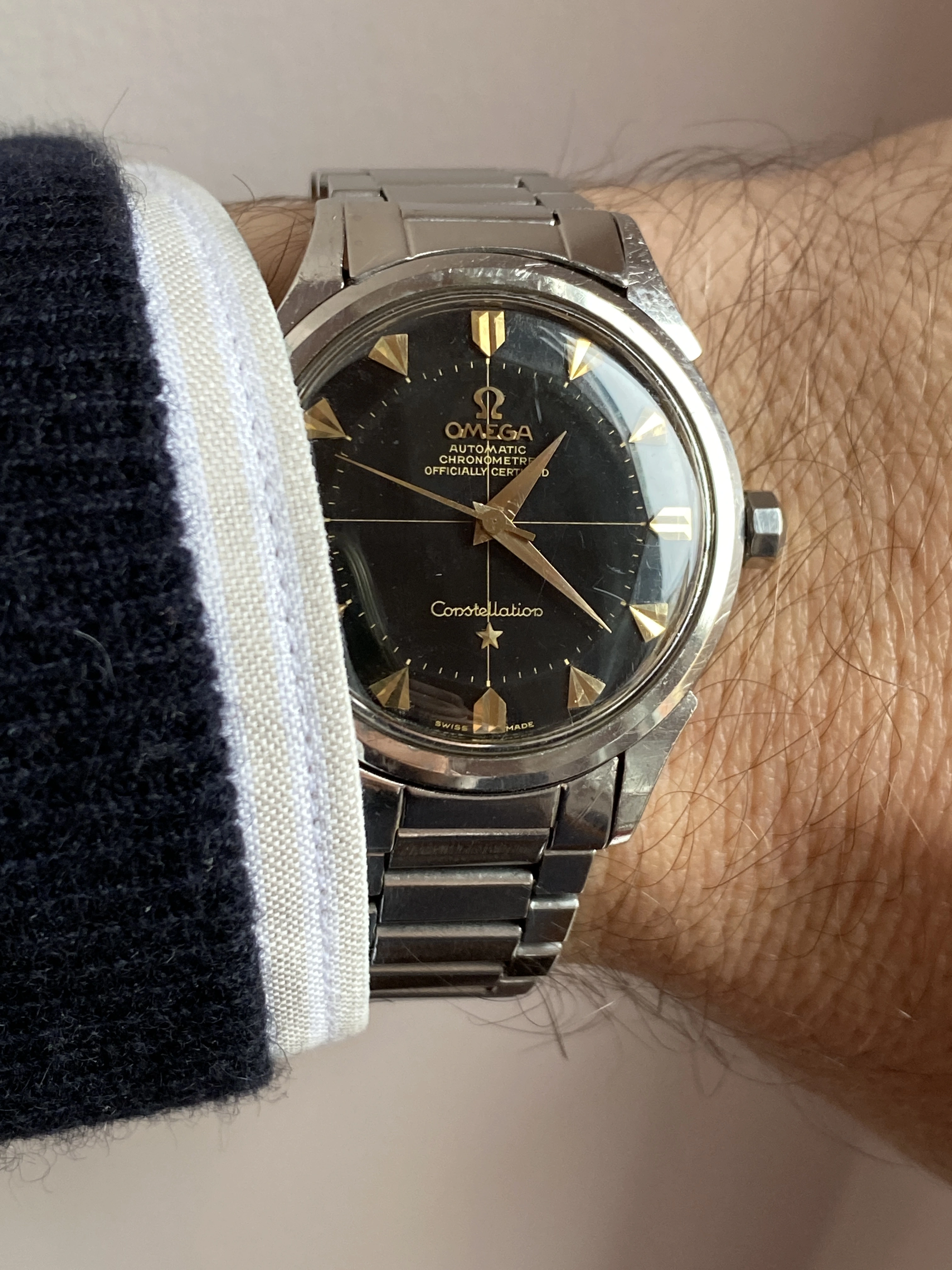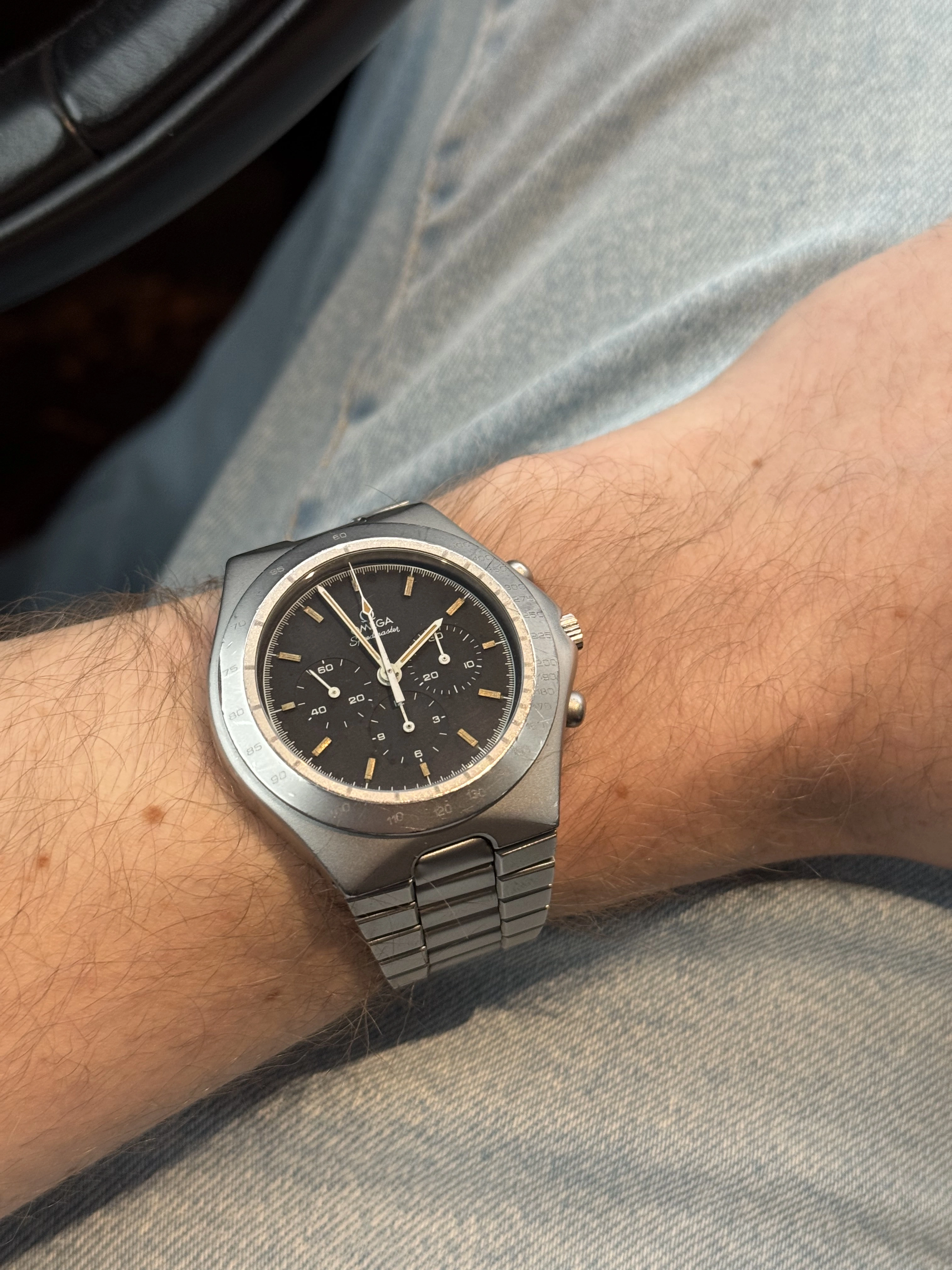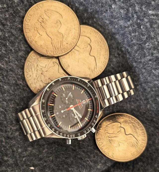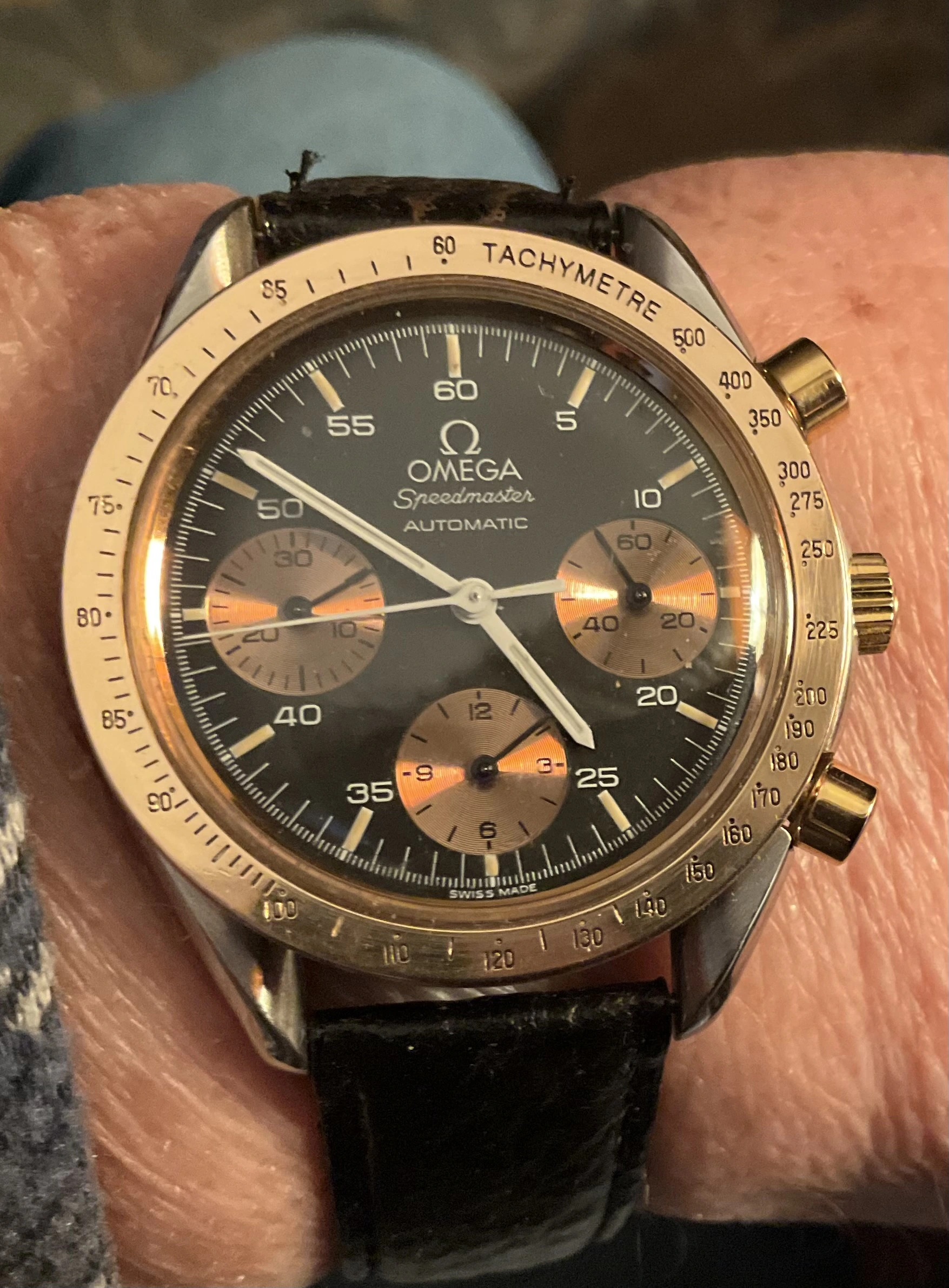 Two today (and tomorrow). My 18-Karat rose gold and steel Speedmaster reduced, acquired 2nd hand, 35 years ago. And because it has a calendar, one of my Accutron 218s from 1964.