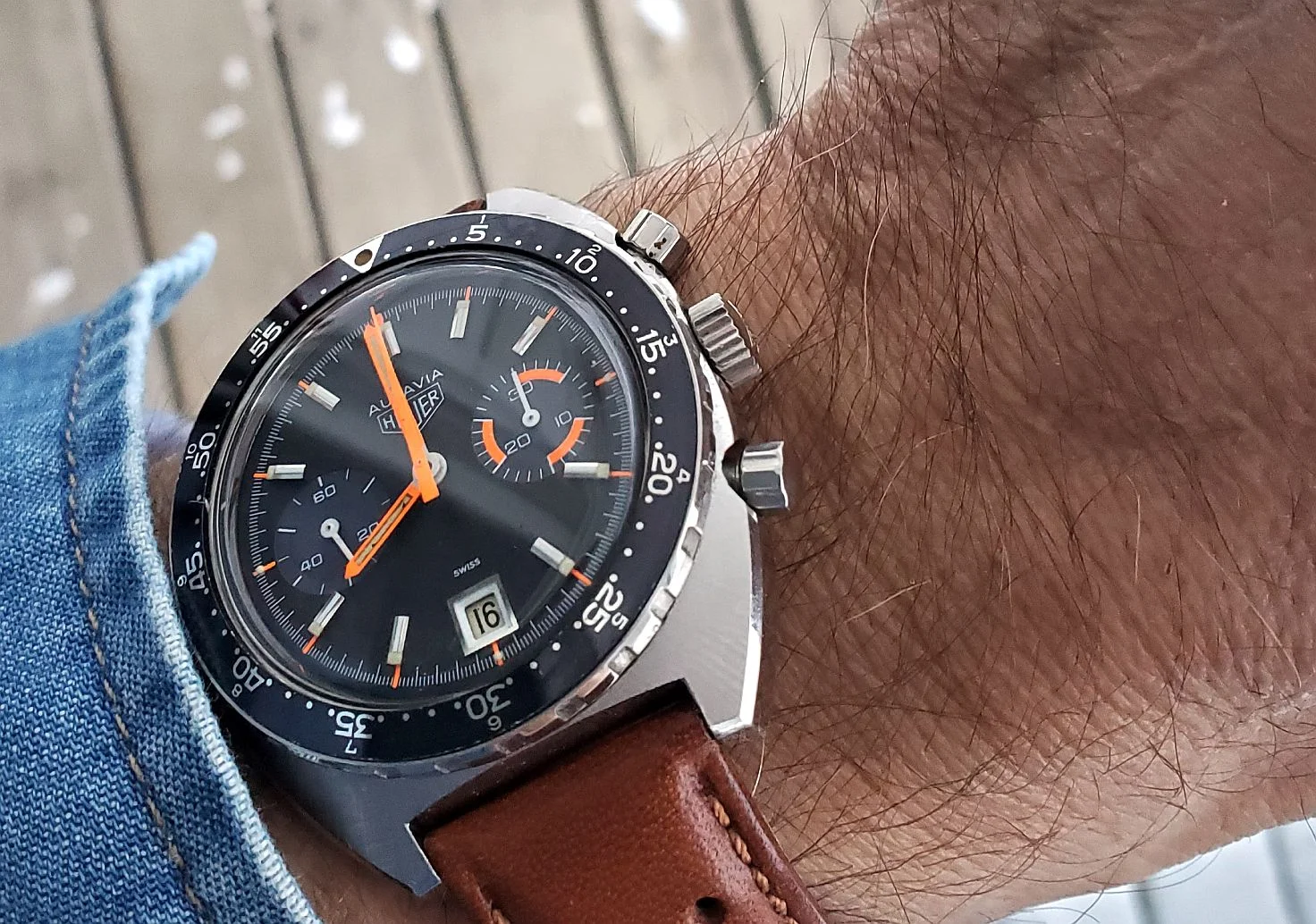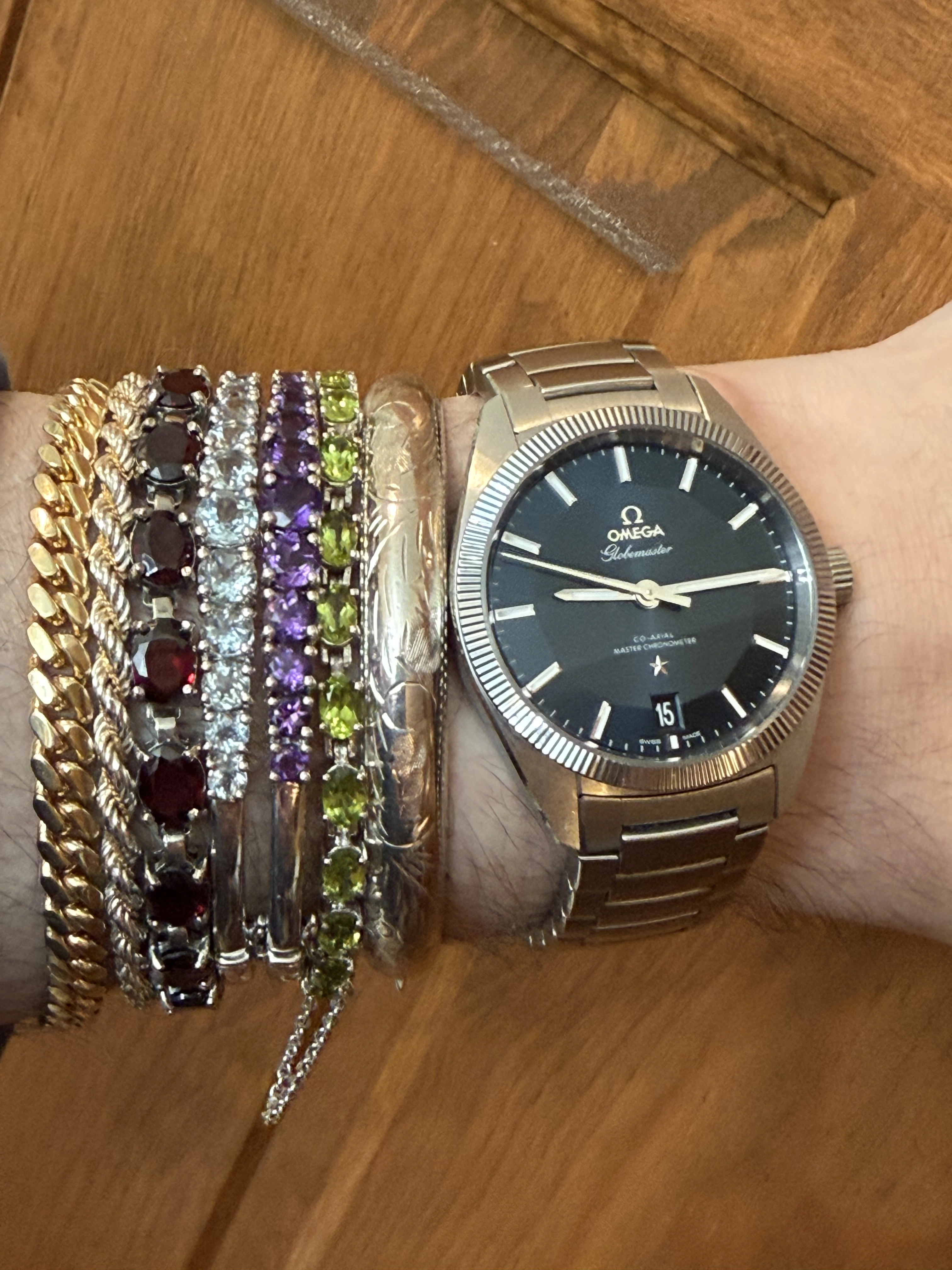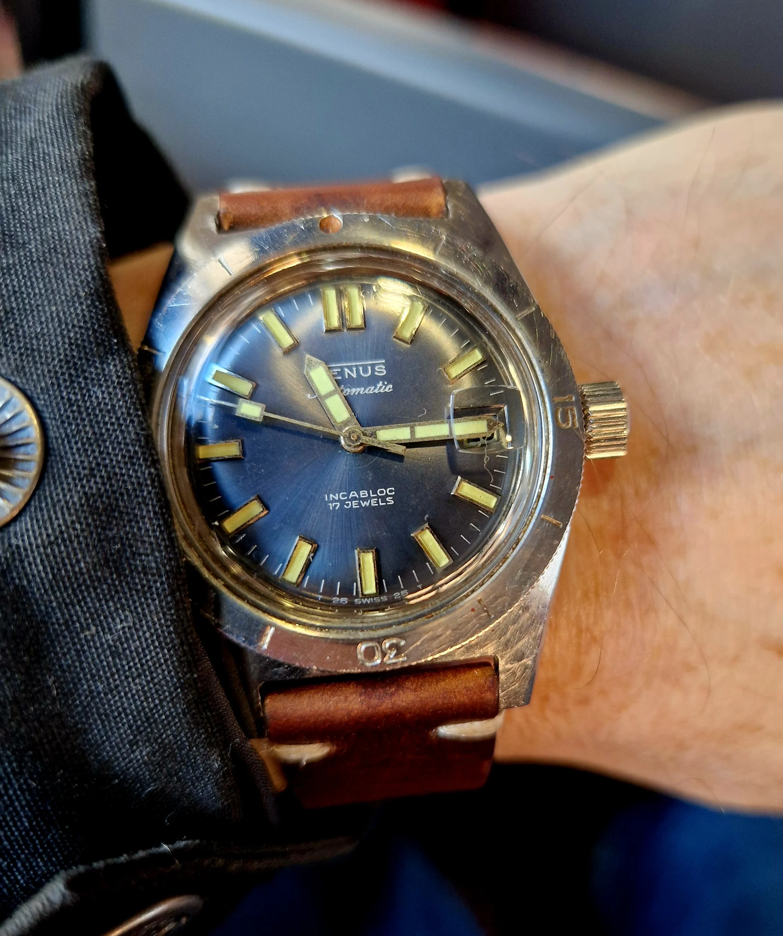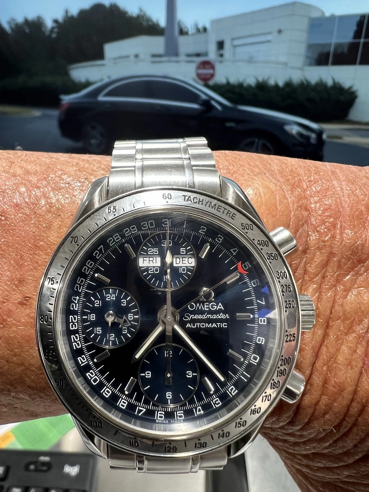 Two today (and tomorrow). My 18-Karat rose gold and steel Speedmaster reduced, acquired 2nd hand, 35 years ago. And because it has a calendar, one of my Accutron 218s from 1964.