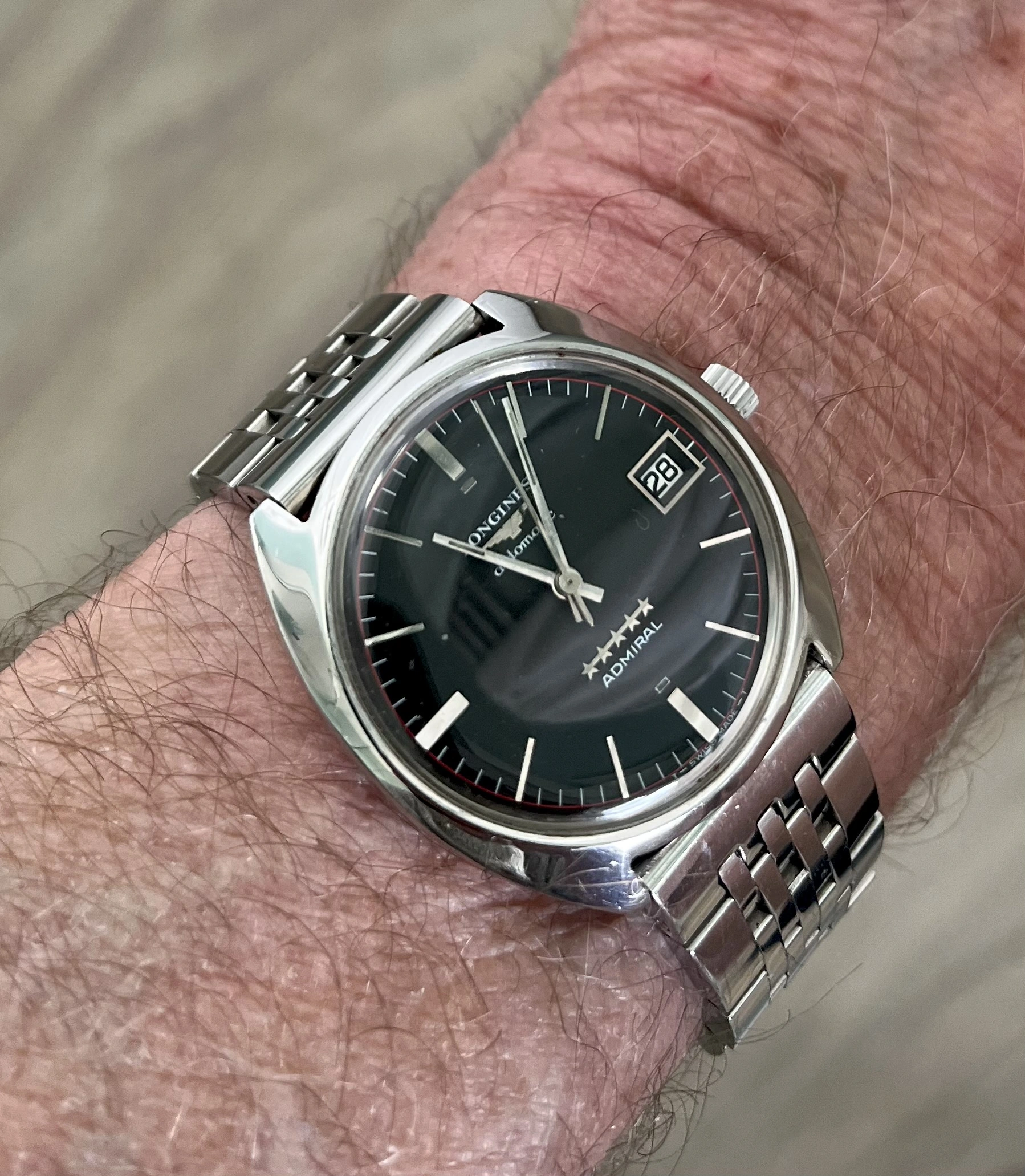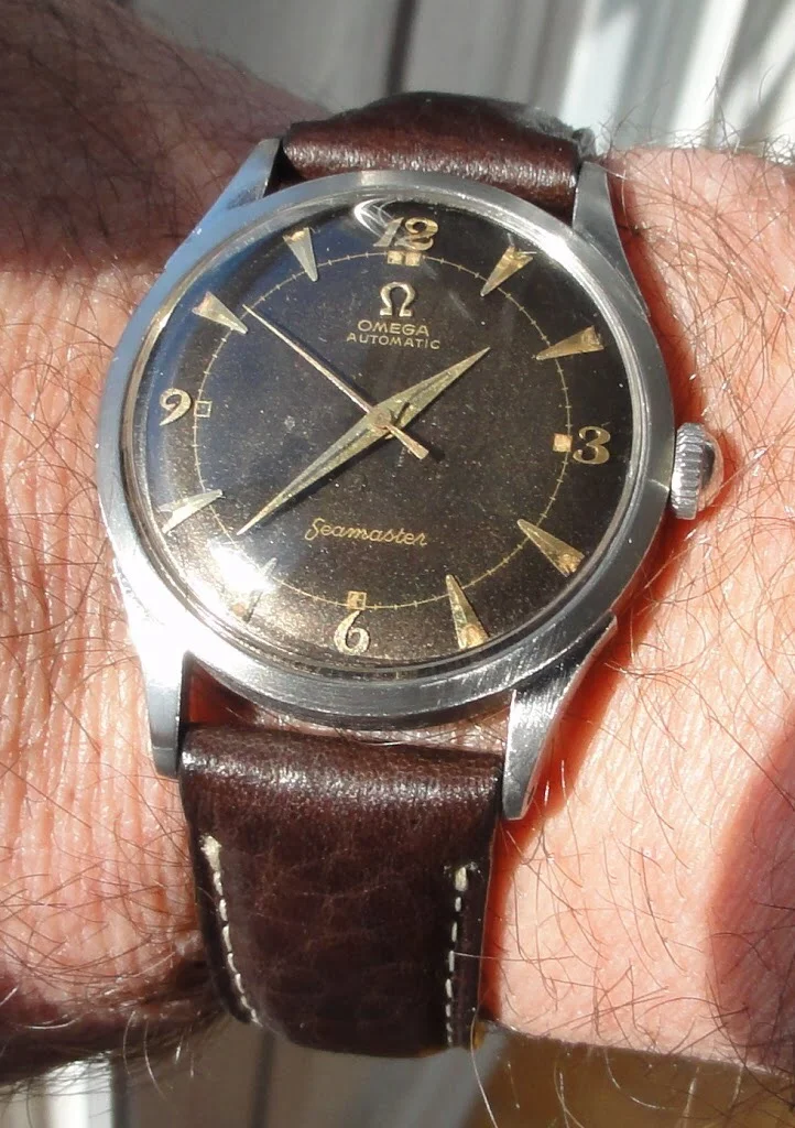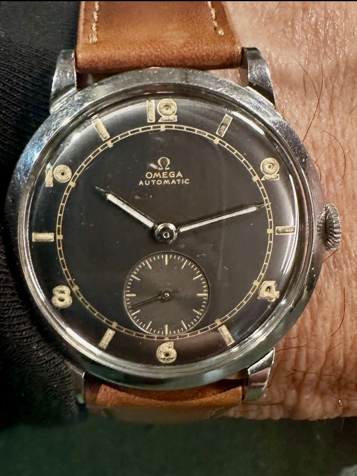 Photos don't do this Gilt dial justice! Along with the gold Breguet applied numerals and arrow hour markers this black gilt dial shows much better in person. The cal. 354 serial number dates this to ~ 1951.