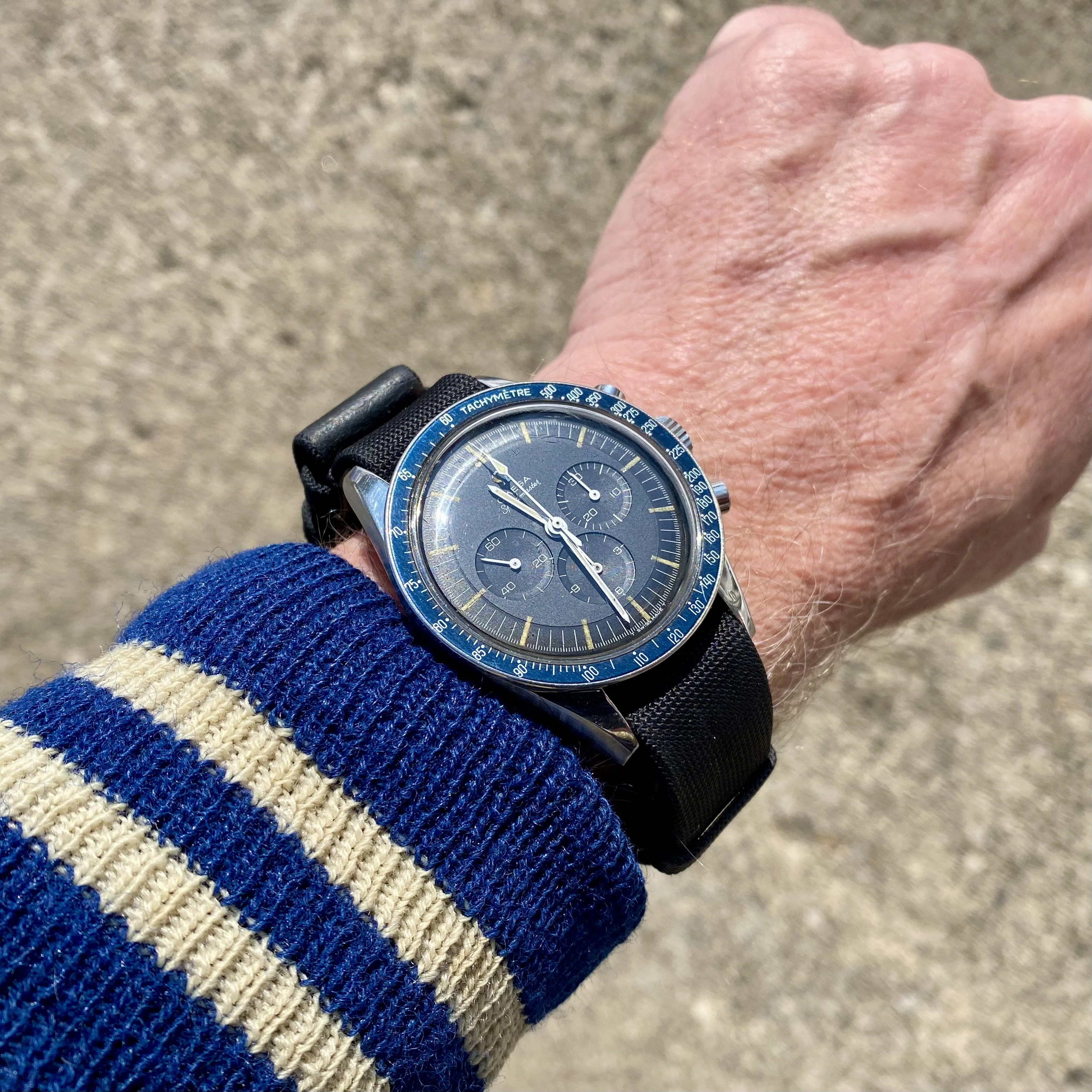 Posts 6,584 Likes 78,277 Mad Dog ·Feb 10, 2026 Speedy Tuesday…birth year -64 Ed White on a modern Omega NATO…high school letterman’s jacket from -79…