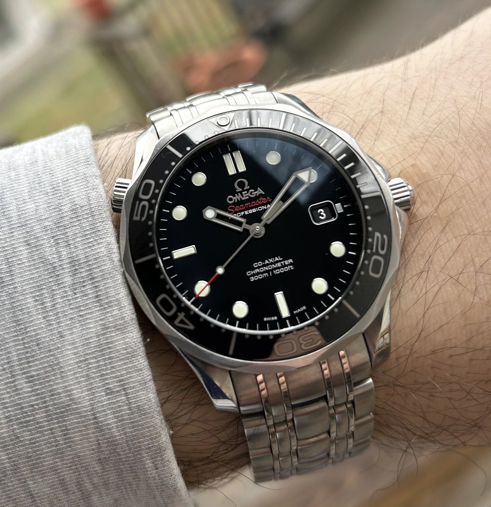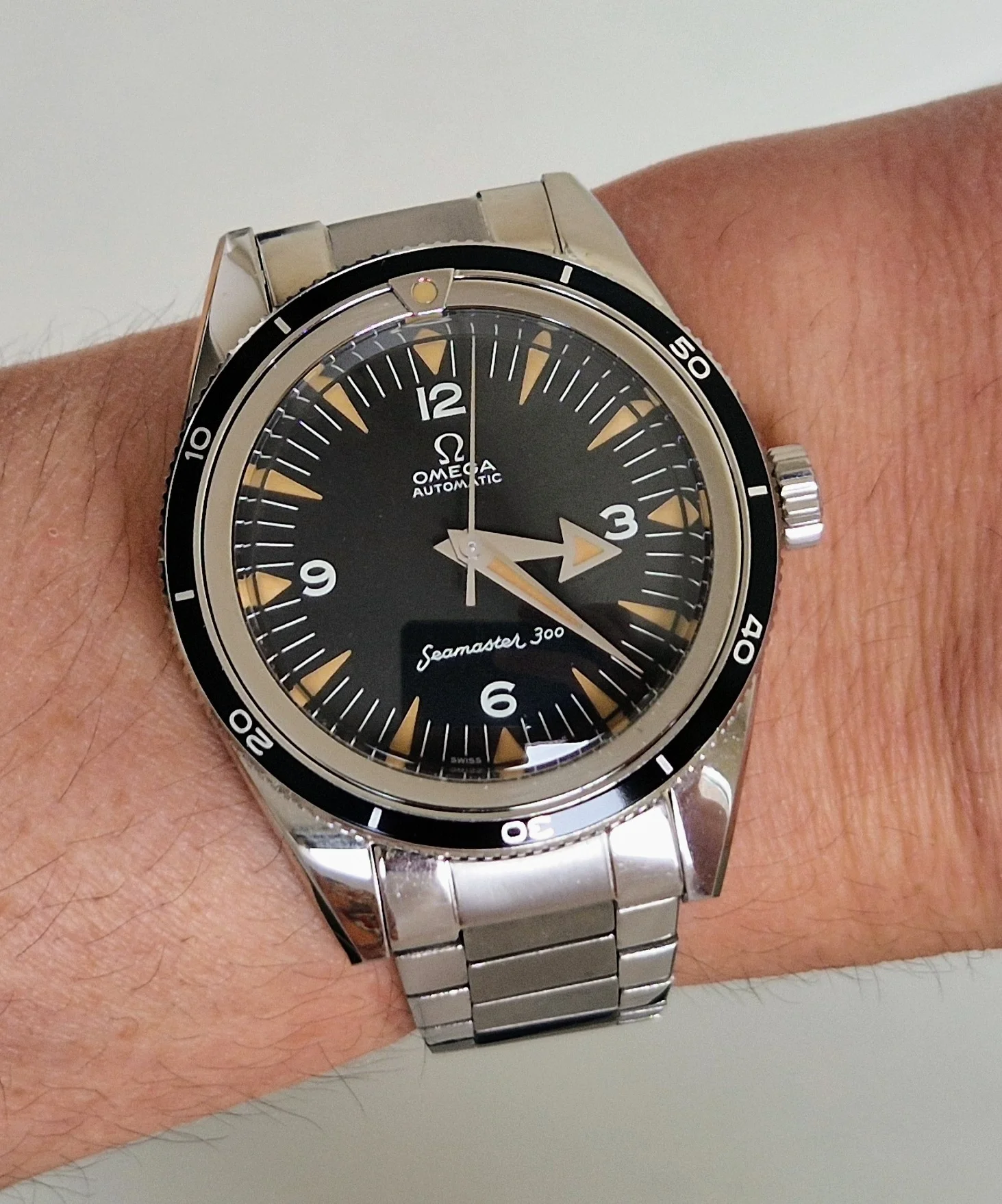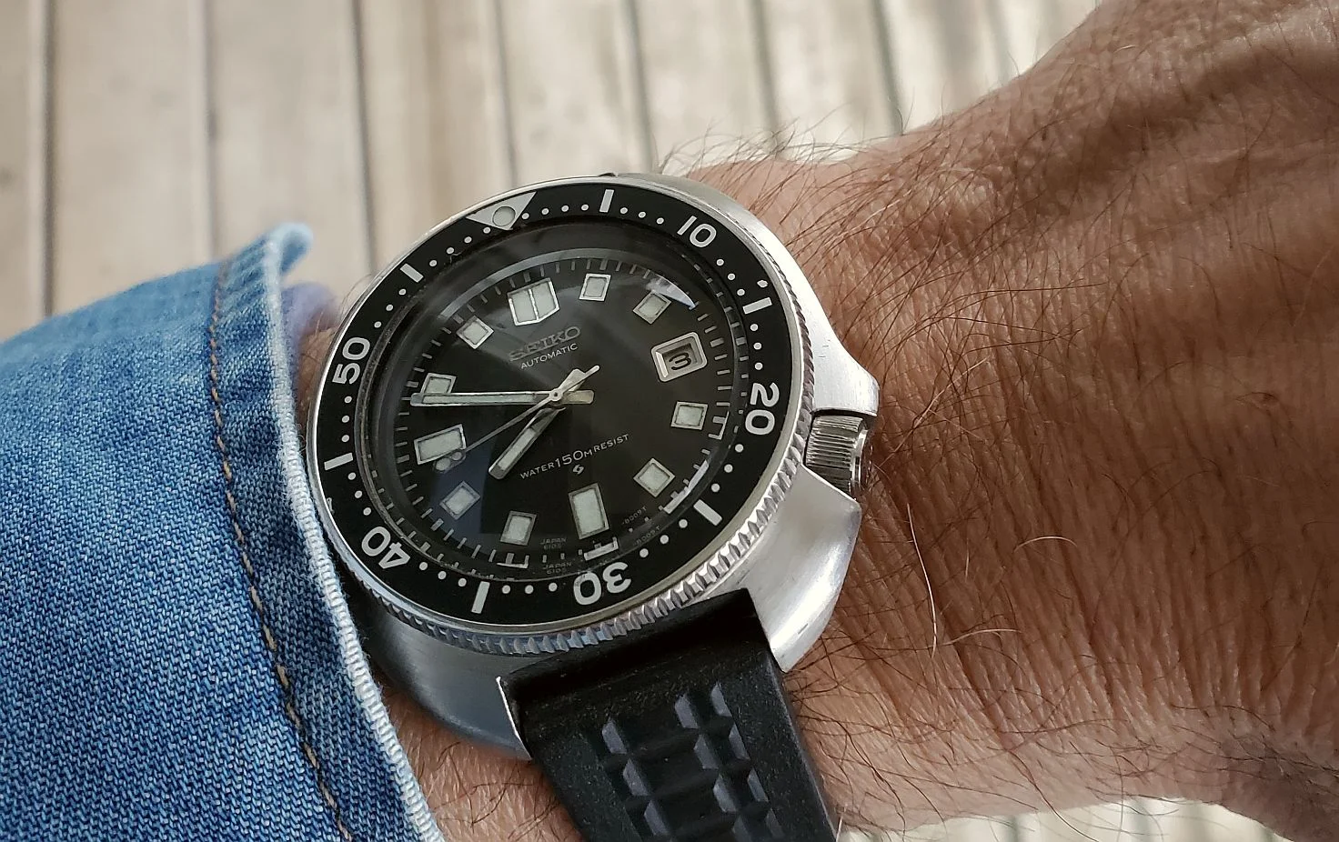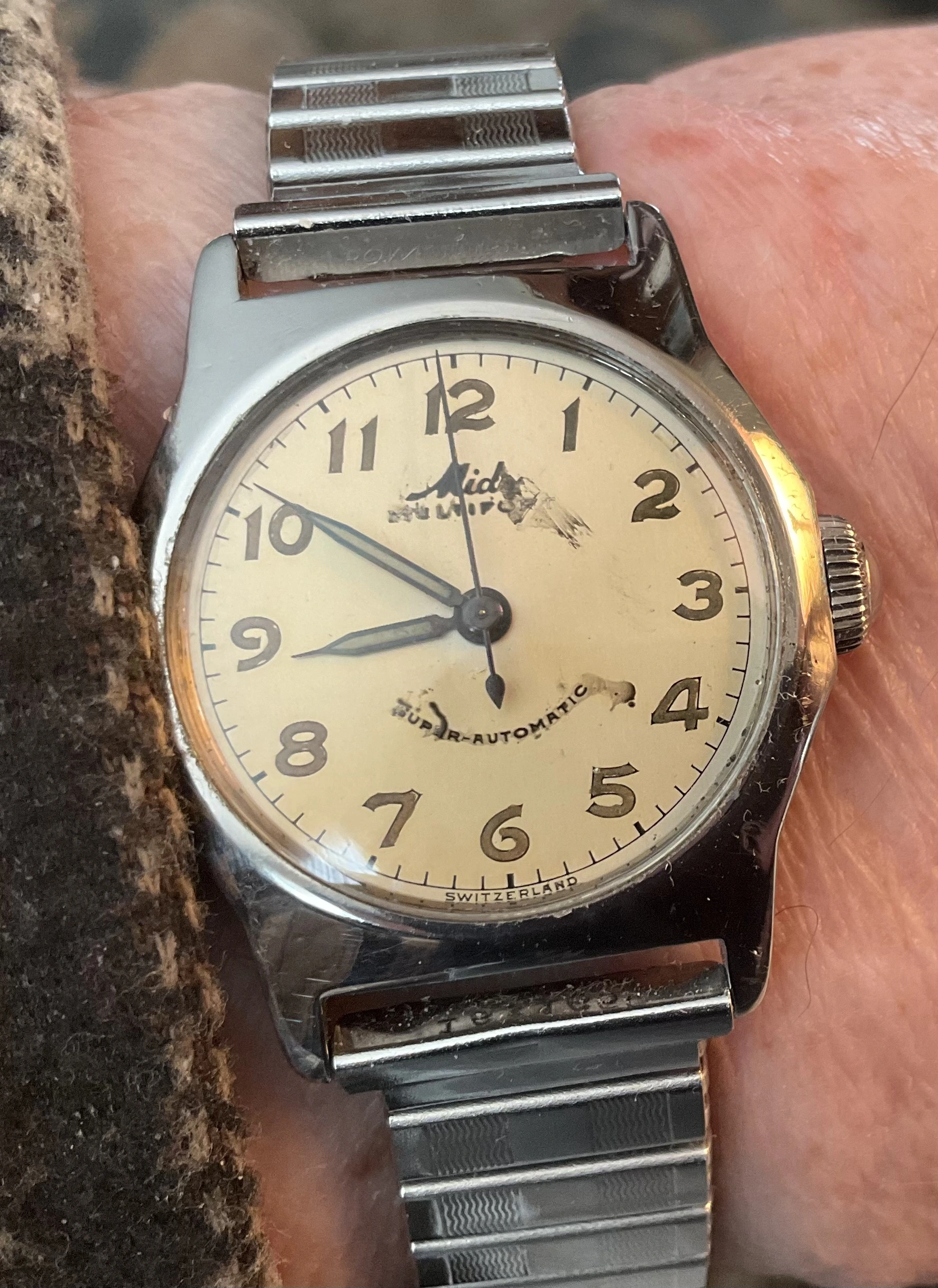 I felt the need for a bumper automatic that wasn’t an Omega, today. So my Mido Multifort came to the fore. It’s a small watch on my 7.5 inch wrist. This watch was bought at an estate sale. A guy in front of me fondled it, then put it down and moved on. I jumped on it like a duck on a June bug, and bought it. The dial is a bit smeared because that is what happens when the dial is printed with India ink (believe it!), and you set out to clean it! I’d guess it is about 70 to 75 years old.