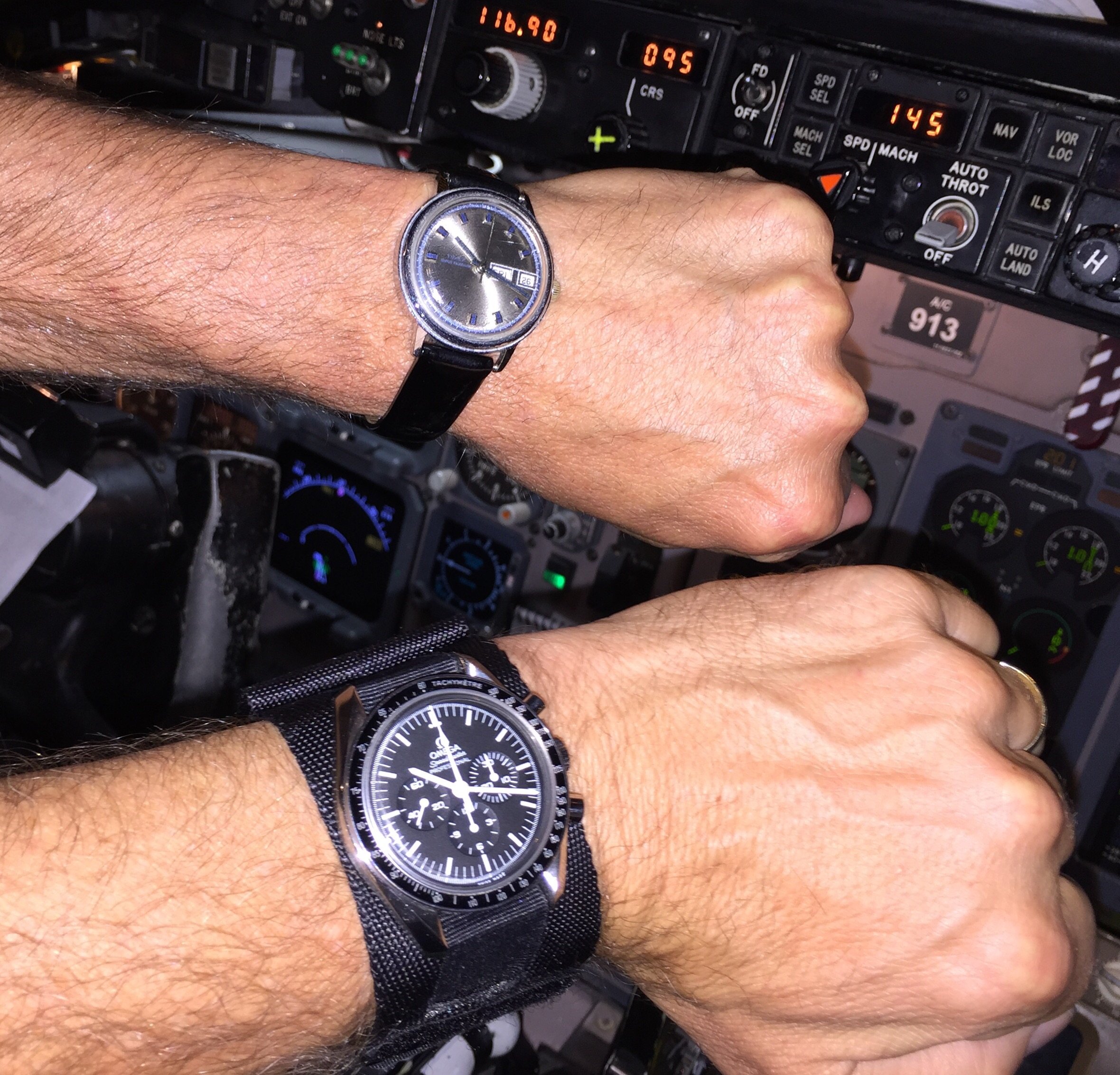 I'm wearing the usual Speedy Gonzales (bottom of pic) at the office...BUT the other dude (pilot) is wearing his Timex mechanical hand wind (top of pic) which his parents purchased for him at Sears in 1969 when he was 10. His Timex has never been serviced in 46 years of use and it keeps excellent time!