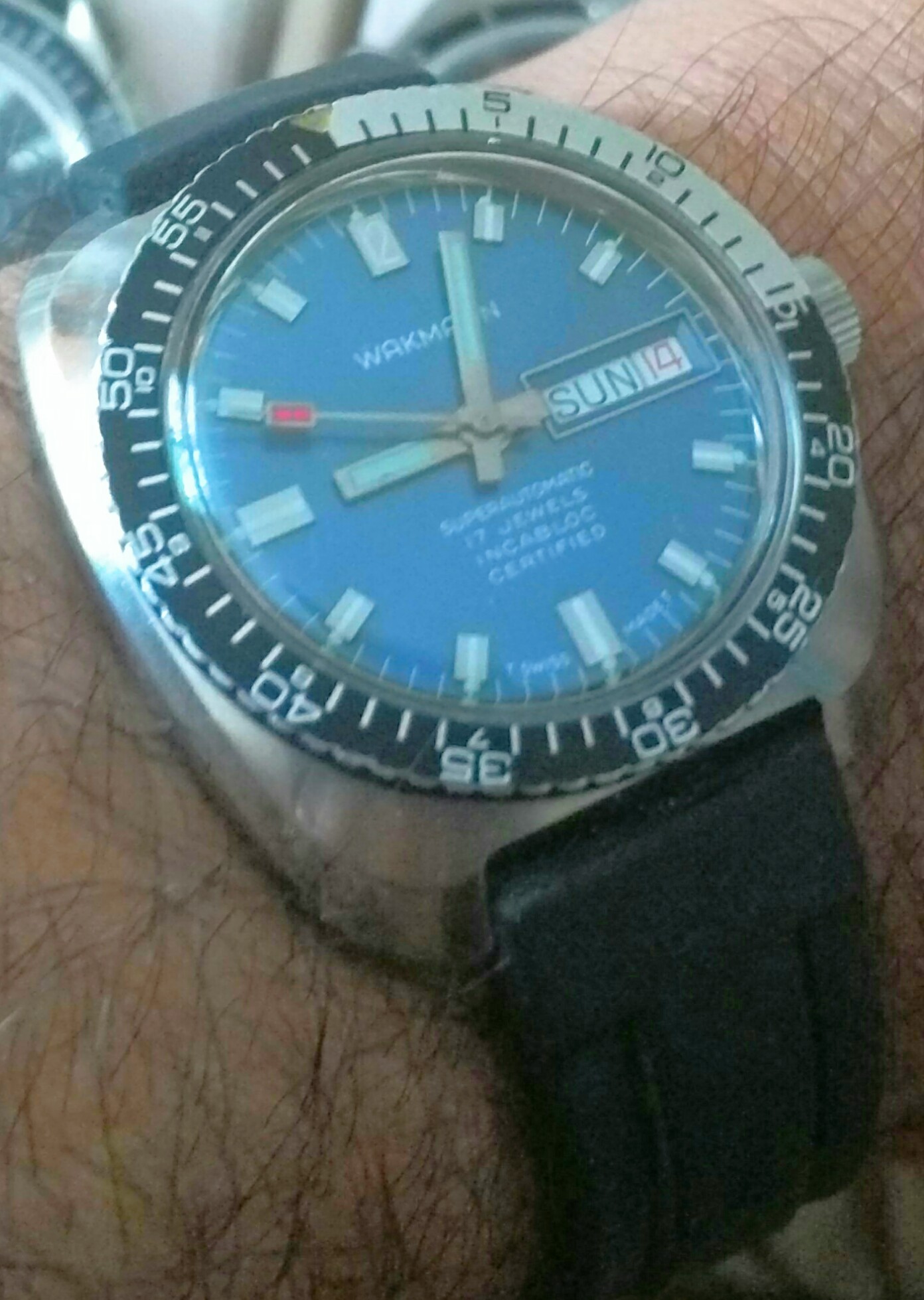 Posts 4,851 Likes 31,736 Taddyangle ·Jun 14, 2015 A honest Wakmann from the 1970s. Very small by any standards, but has a great vintage look. And I love the second hand. Oh, and of course the blue dial.