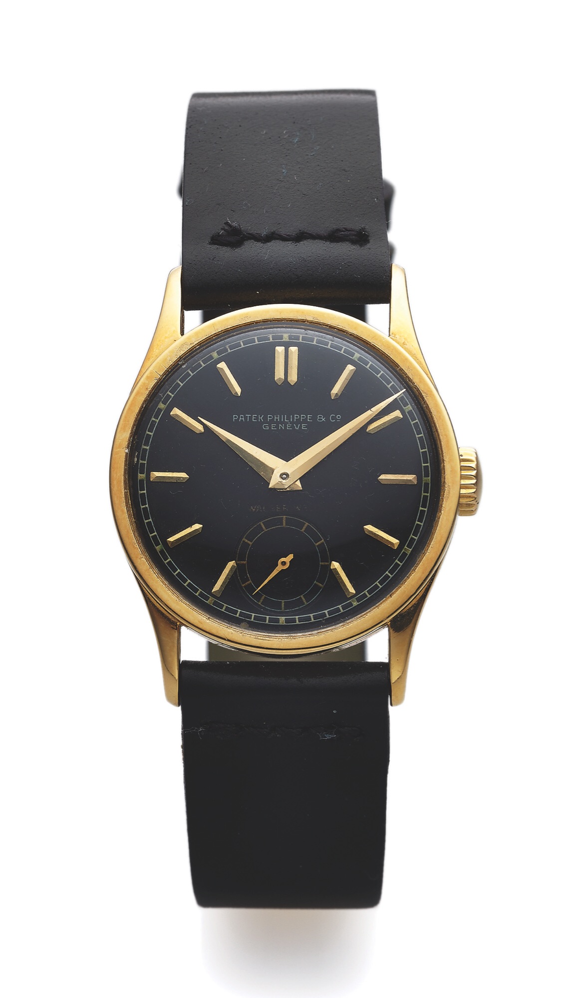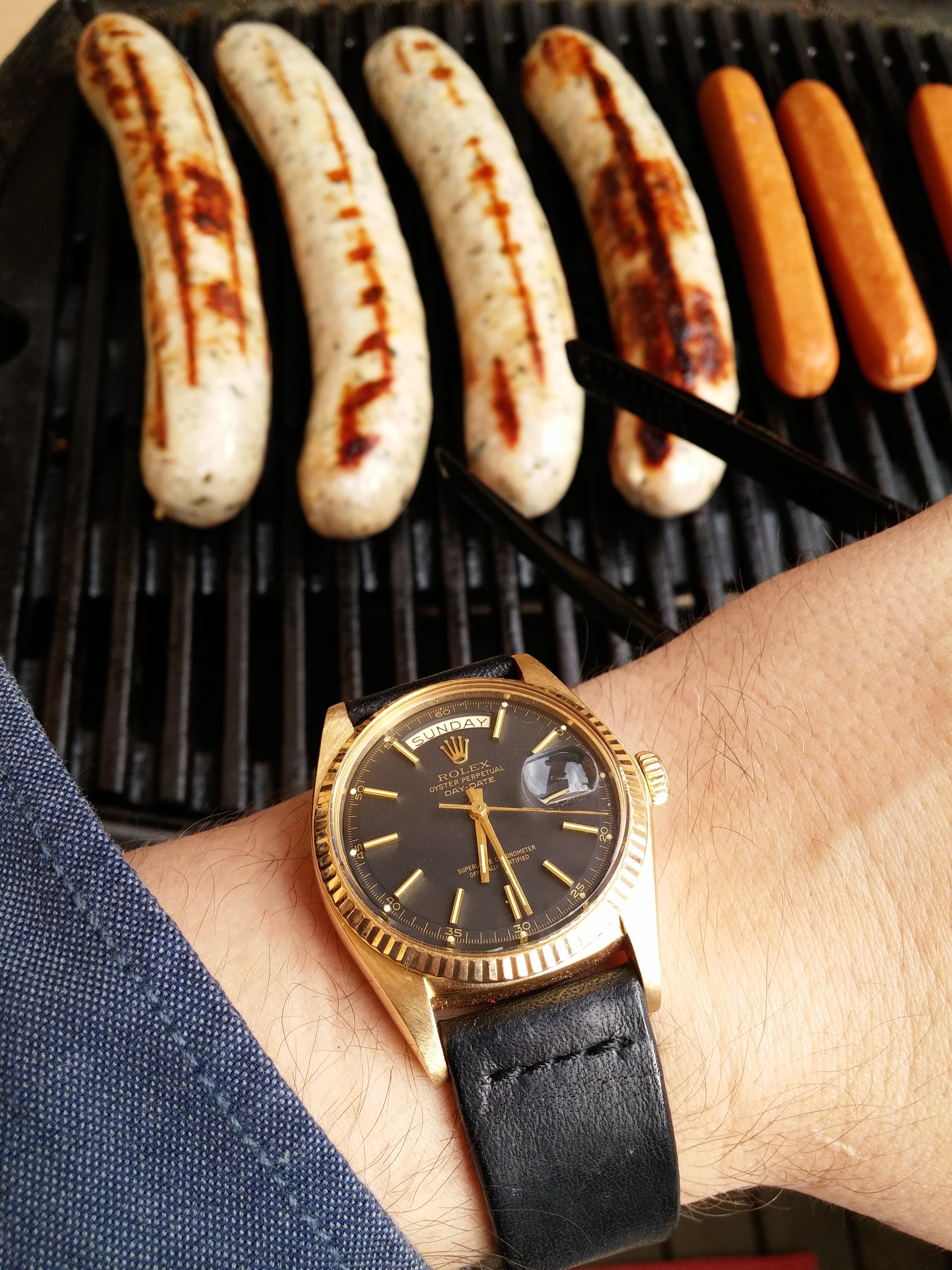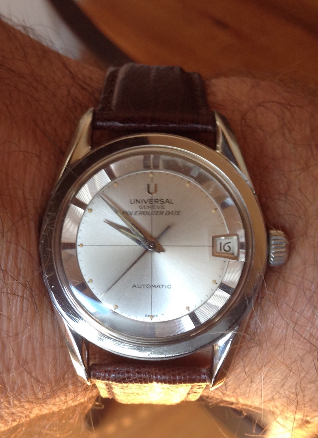 Inspired by @Darlinboy black memovox. I dug up an old pic of a watch I would have been wearing had I managed to find a swan neck regulator for it (cal 12-120). This has been sitting with my watch guy for exactly 2 years waiting for the part (he is actually skilled enough to make it too but just too busy), ref. 96 black dial sold by Walser Wald during WW II. I pray for the part to appear once a week....