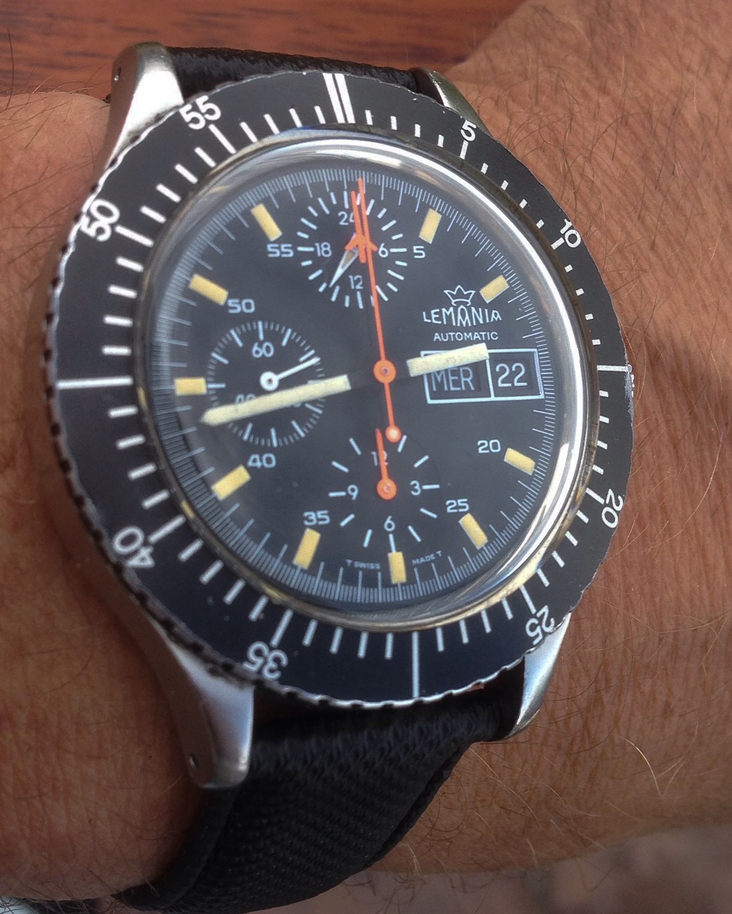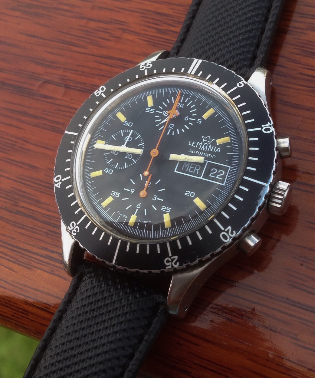 DIY chronograph mod. Lemania made it, but never like this. Hamilton "Sinn 156 case" watch with Lemania dial. Caliber 5100. Speedy style 24h hand.
