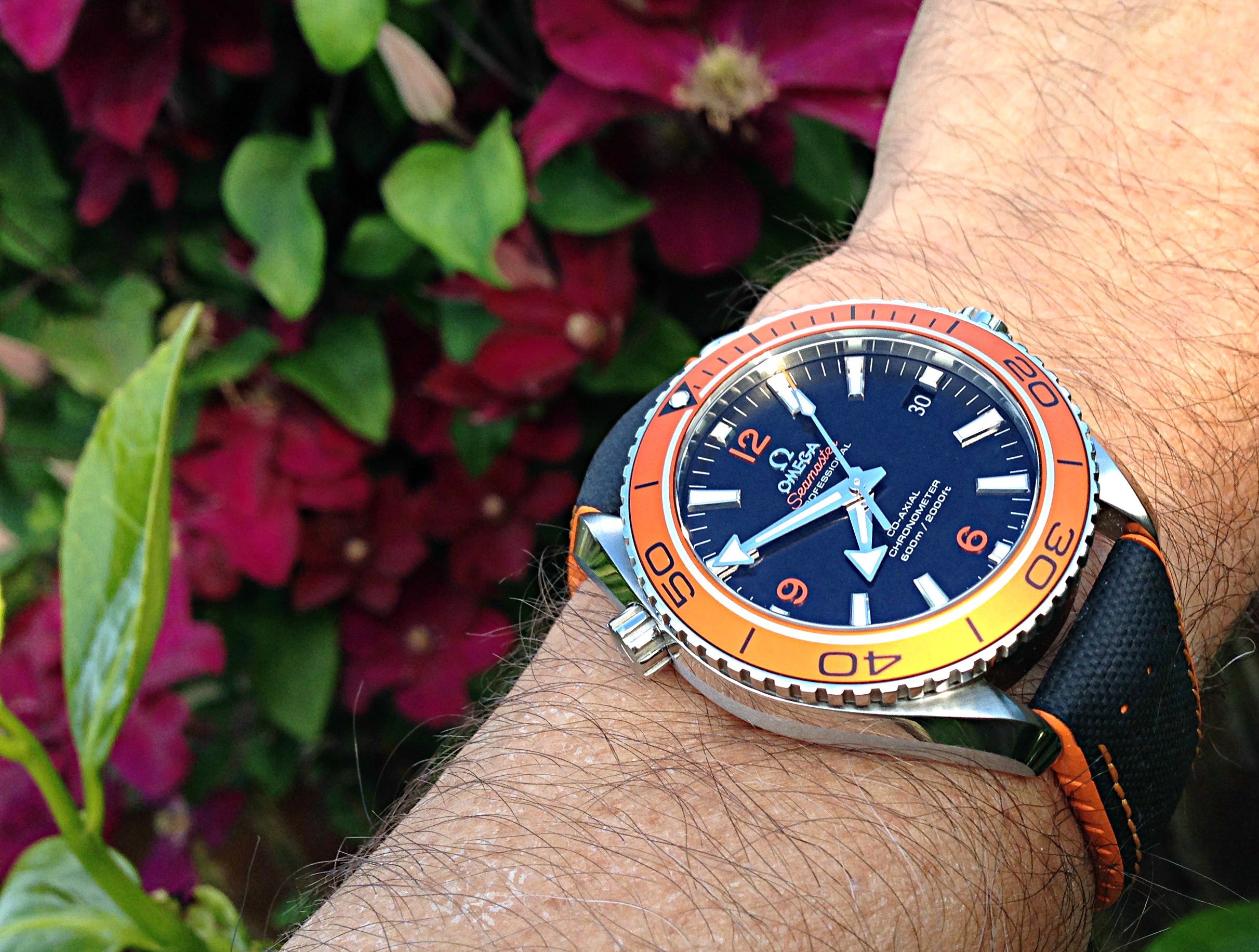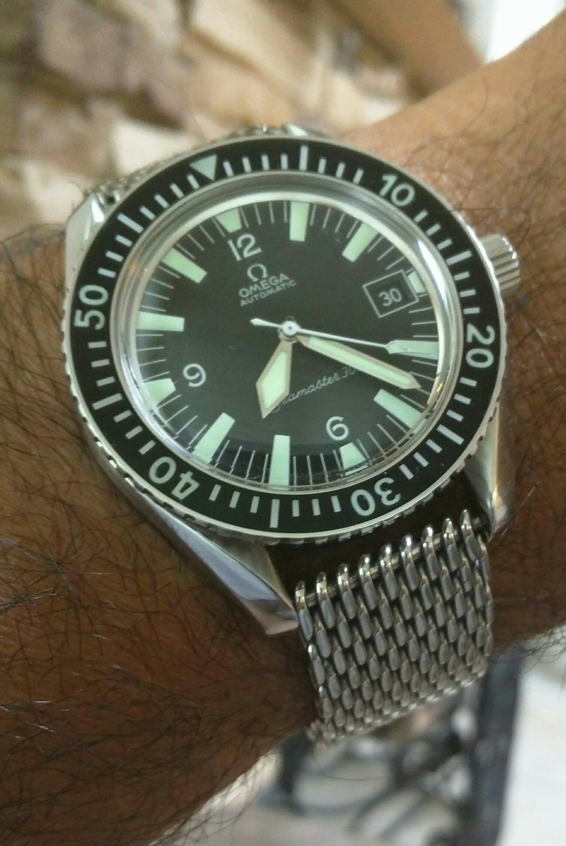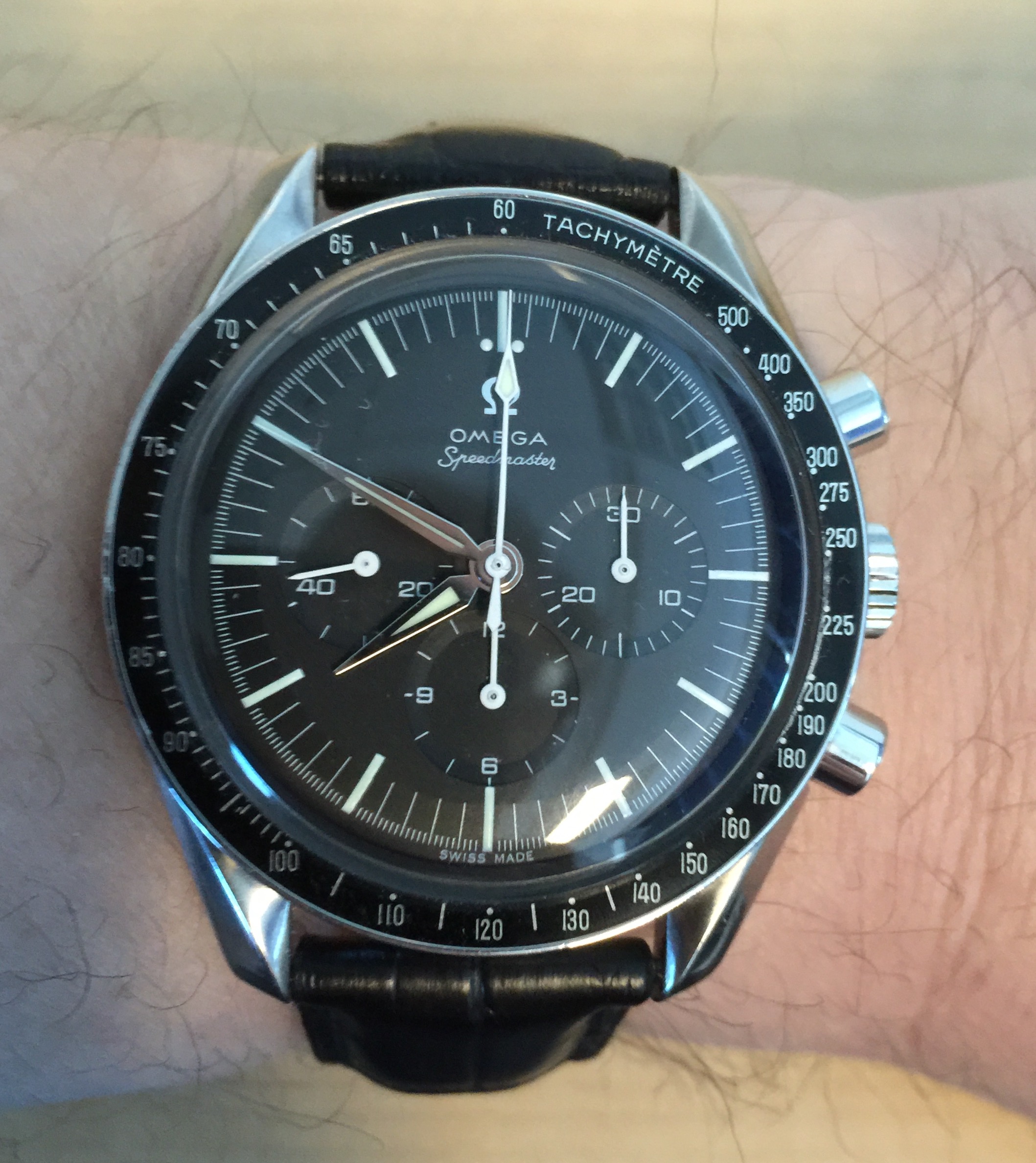 Speedmaster '57 Replica with replacement hands and bezel on Omega crocodile deployant strap and Omega clasp.