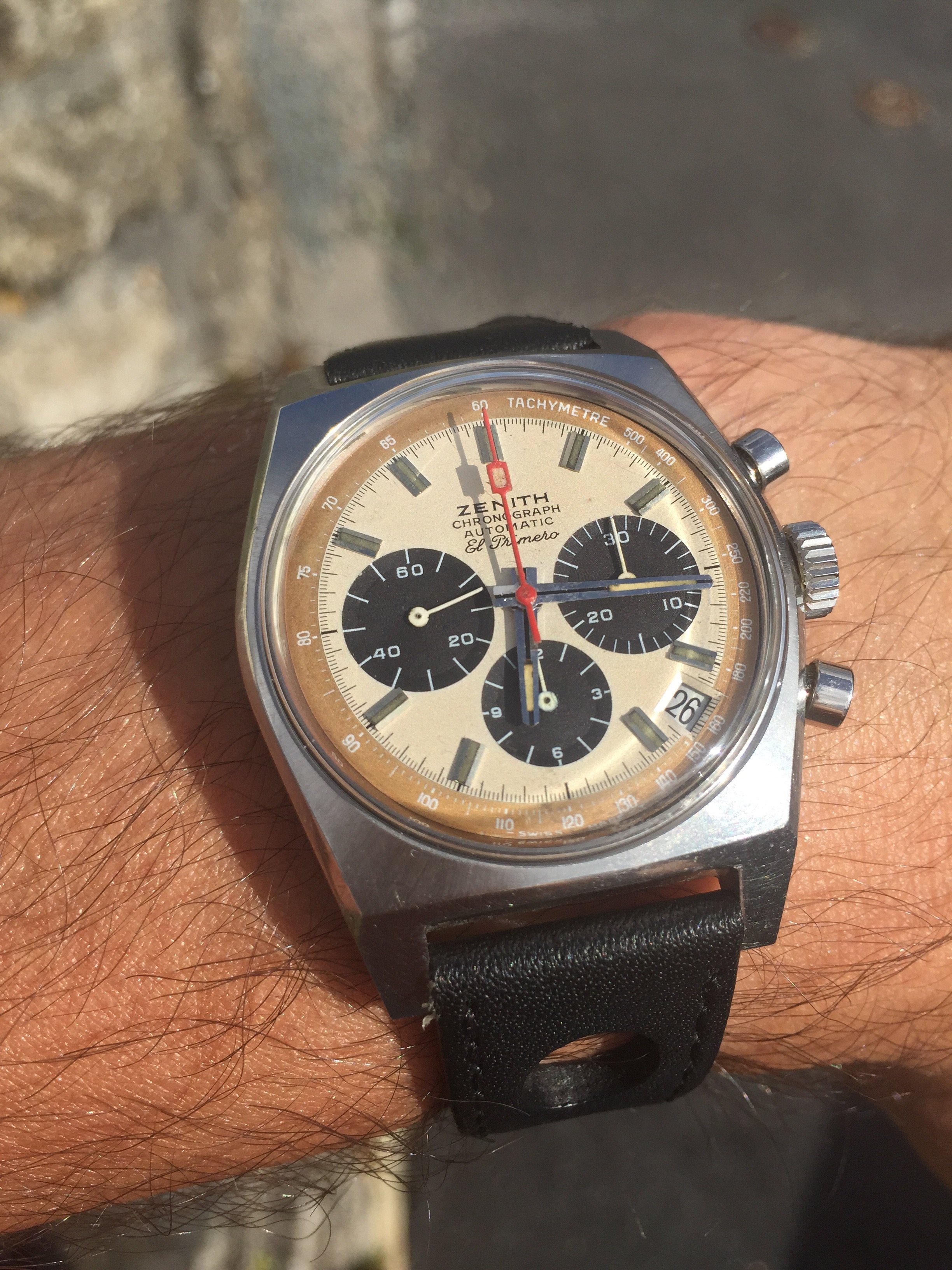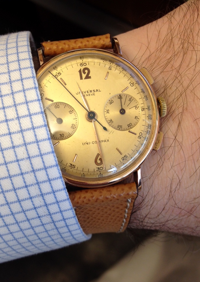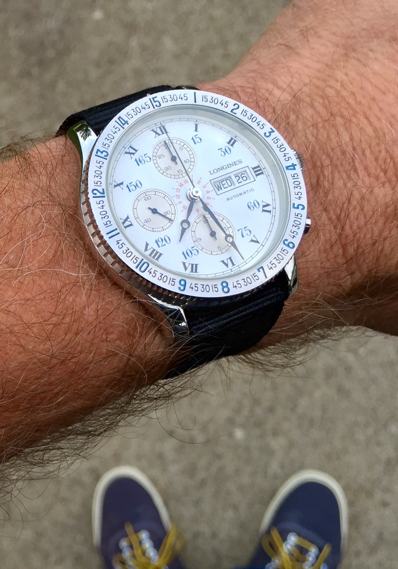My recently serviced Longines Hour Angle chronograph with a $7 unbranded nylon strap purchased from Dakota Watch Company...