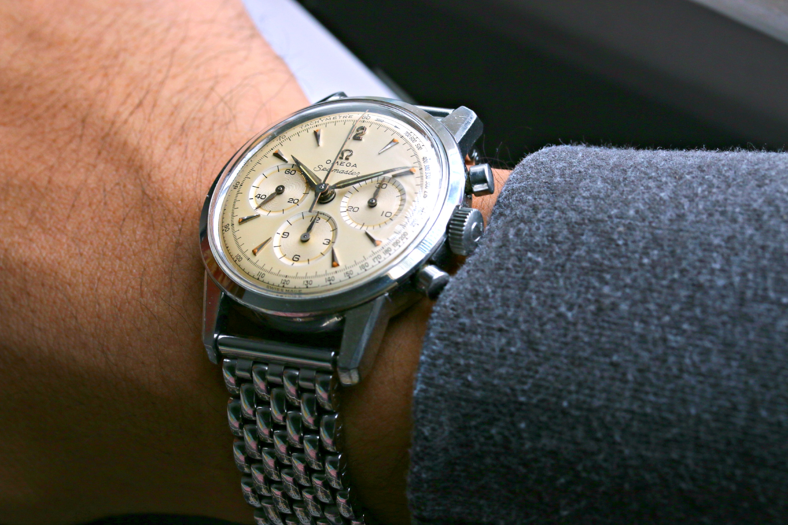 A very rare and early waterproof design chronograph ref 7066. Serial puts it to 1937-39.