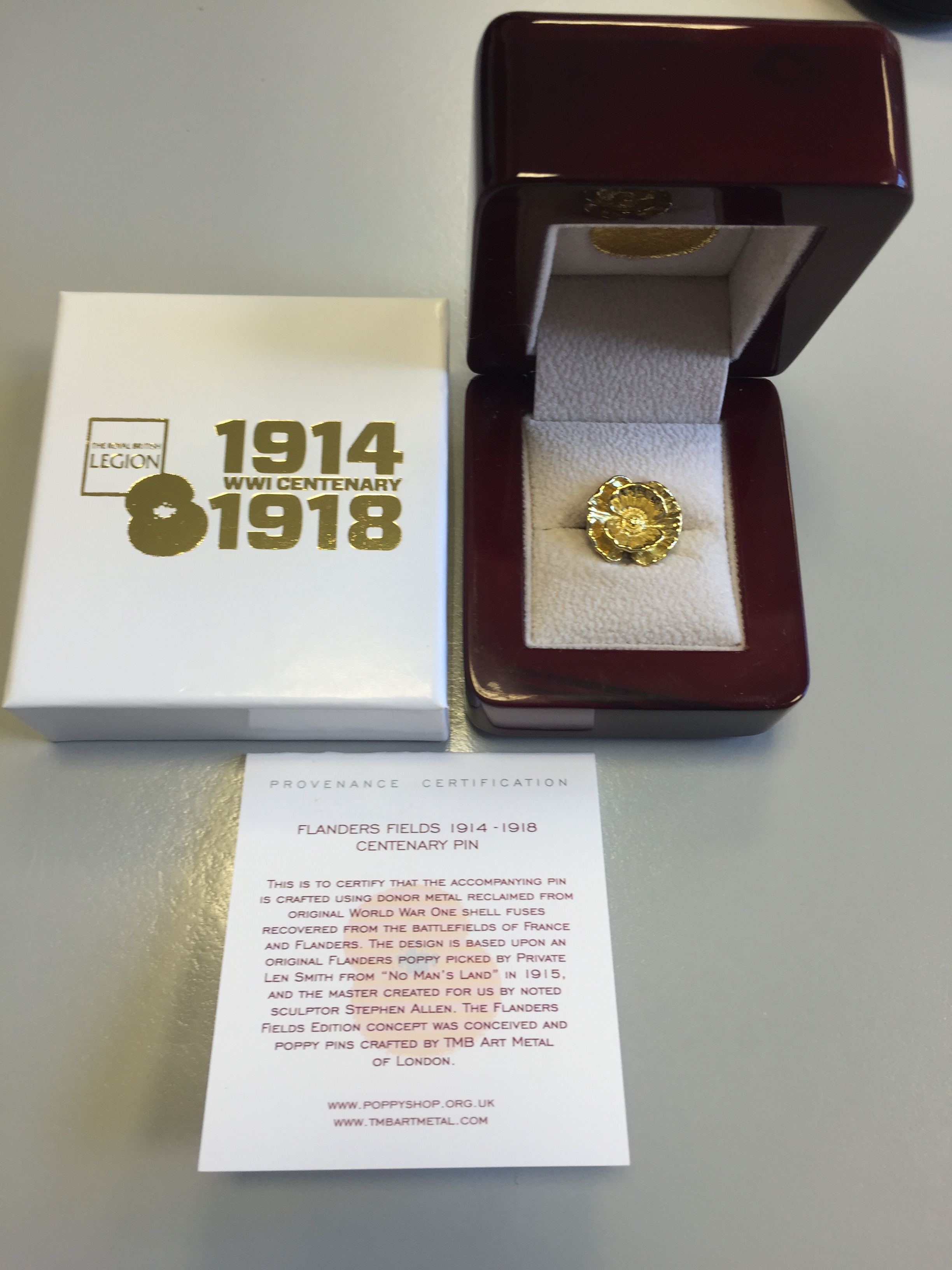 This pin is made from brass shells collected from the battlefields of France. If anybody wants to pick one up or make a donation here's the link http://www.poppyshop.org.uk/flanders-fields-1914-1918-centenary-lapel-pin.html