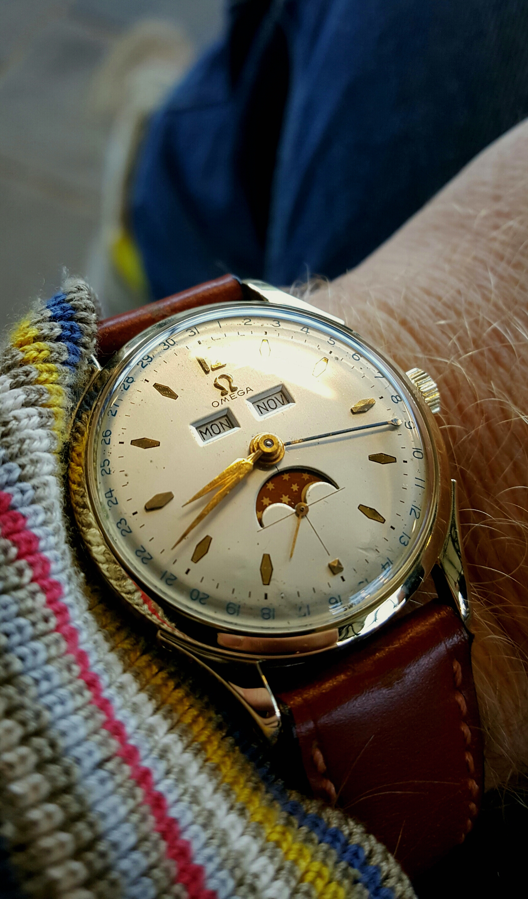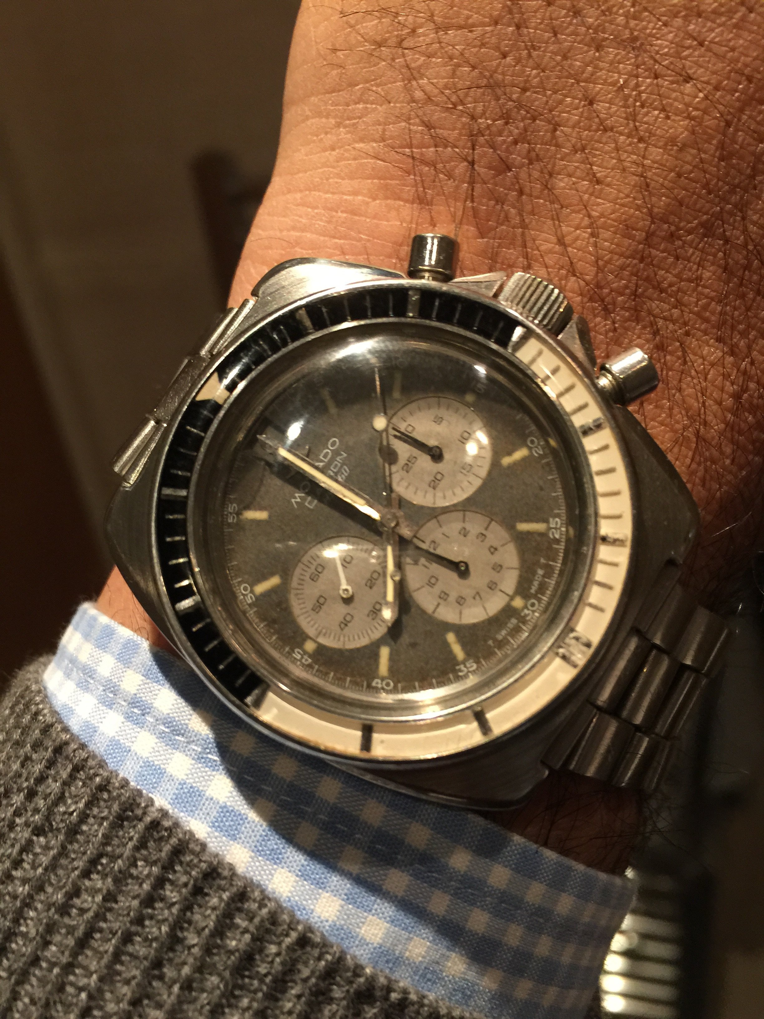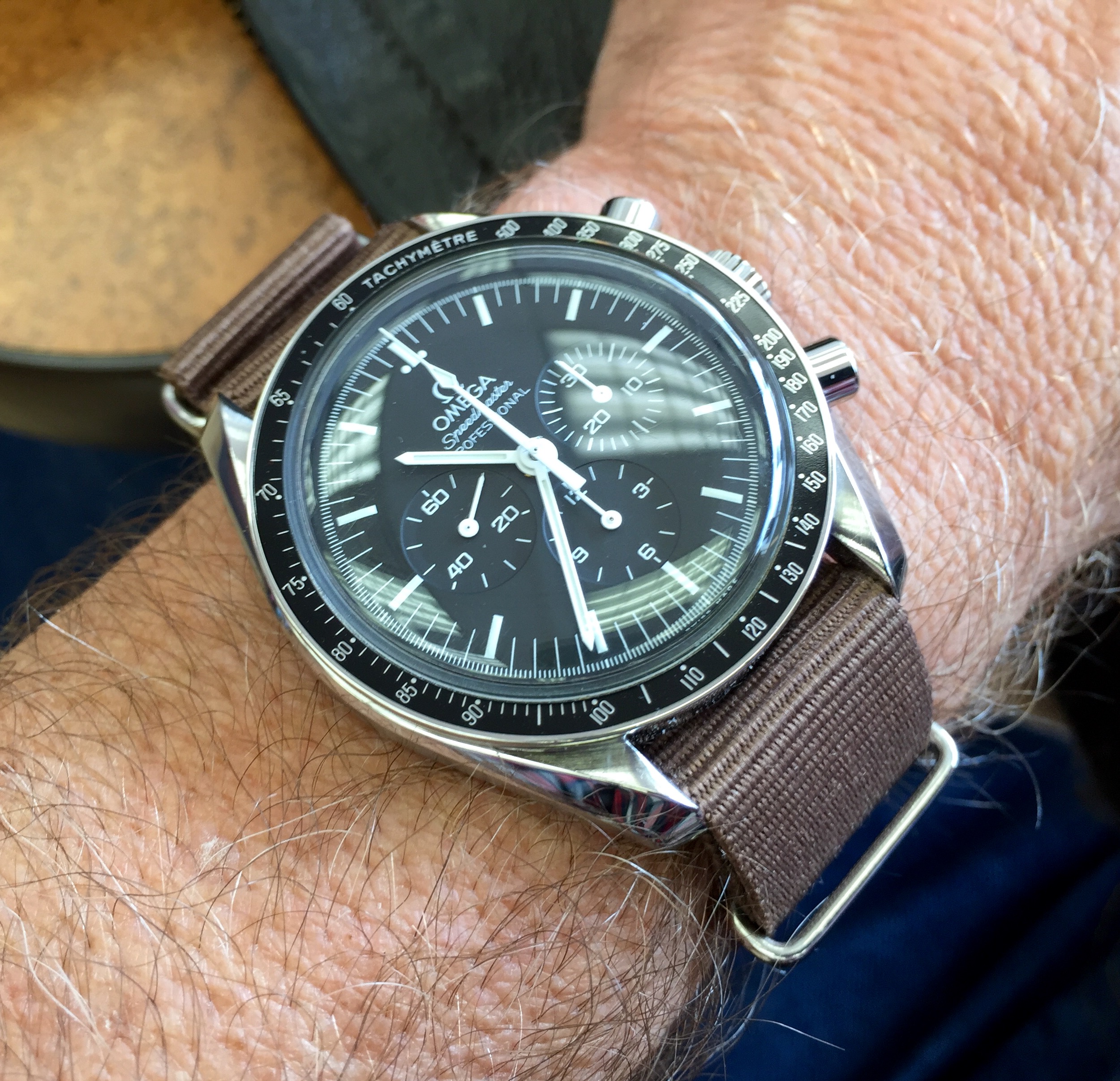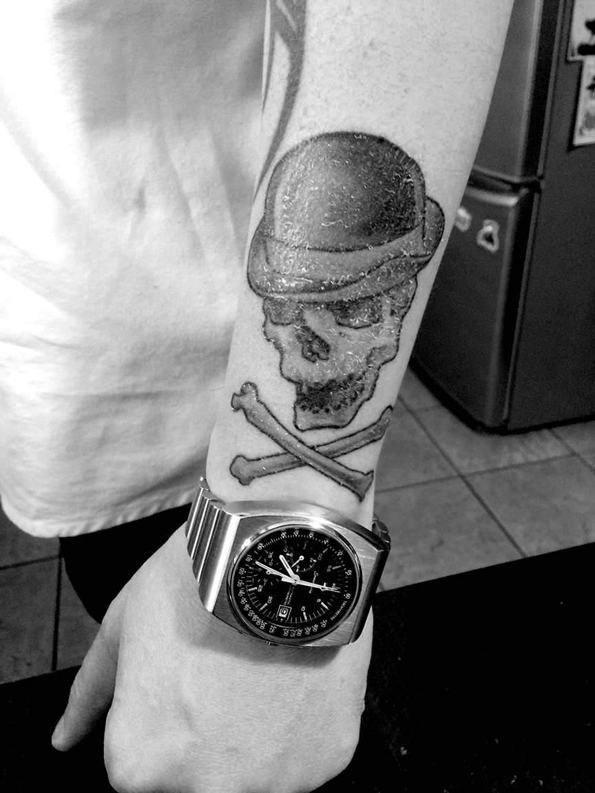Not mine, but my business partner & friend's Speedy 125 sitting below his new tattoo (you can see that it's still "healing", thus the cracks). He made sure that the bones "framed his watch: