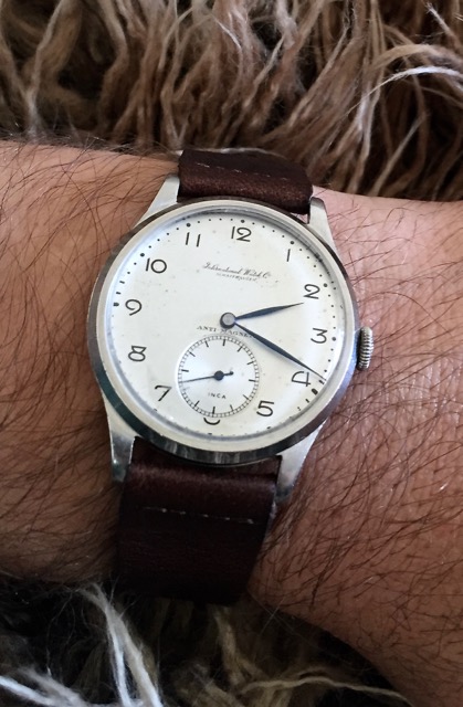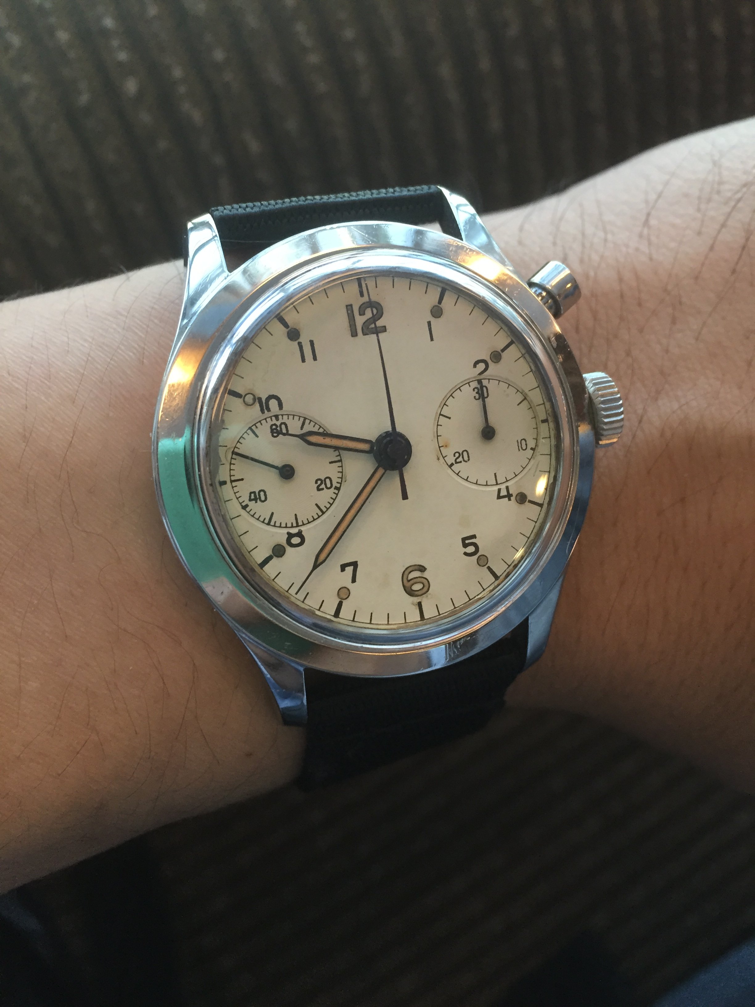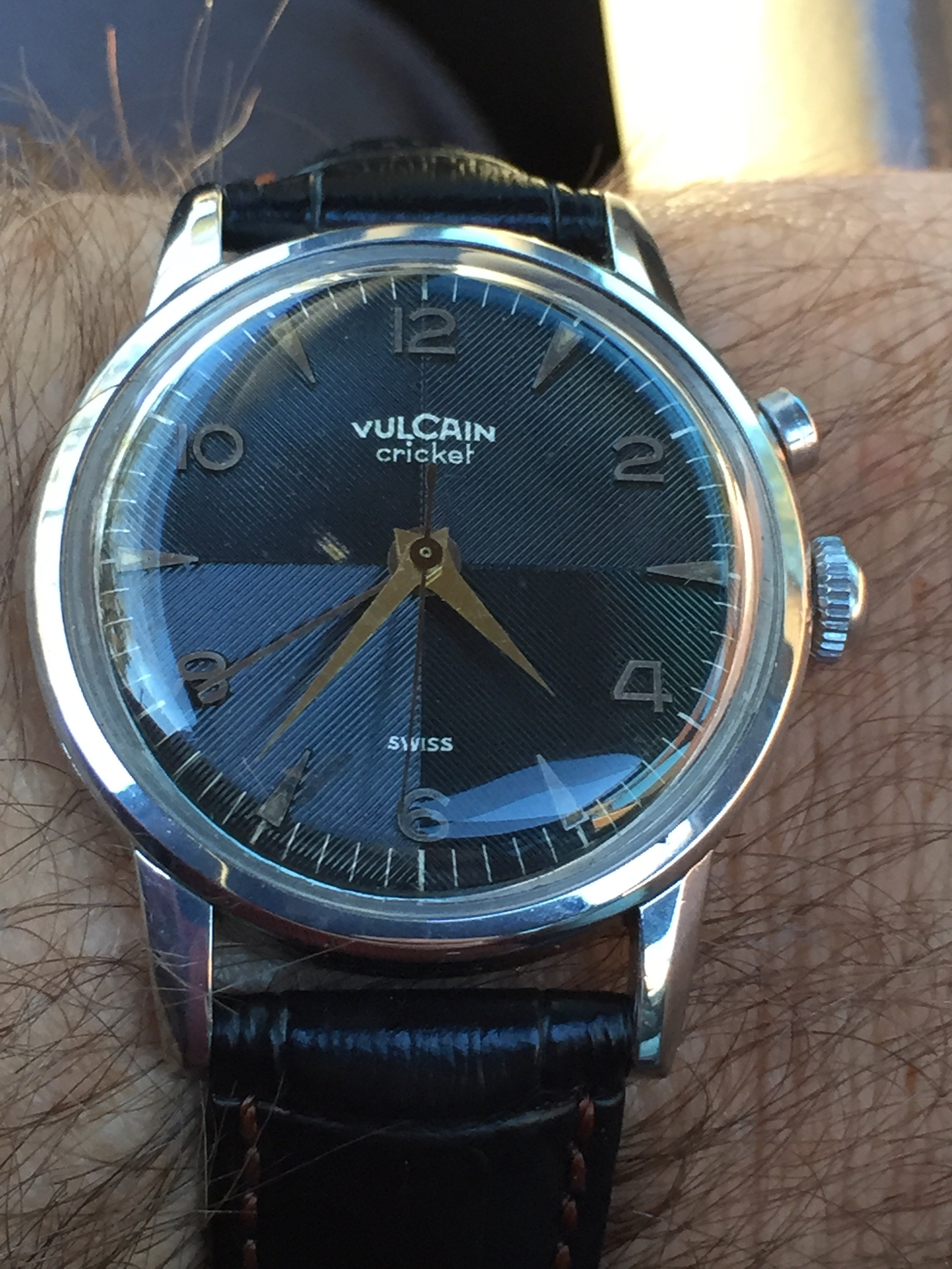 This pic鈥檚 angle distorts their relative sizes a bit, but even when placed evenly side-by-side, the auto regularly fools me into thinking it is wider. Yet both are 42mm. I think the 1045鈥檚 father spaced apart sub-dials is a contributor to this illusion