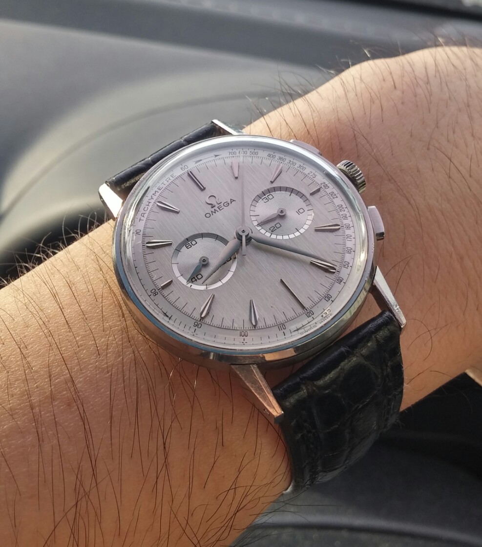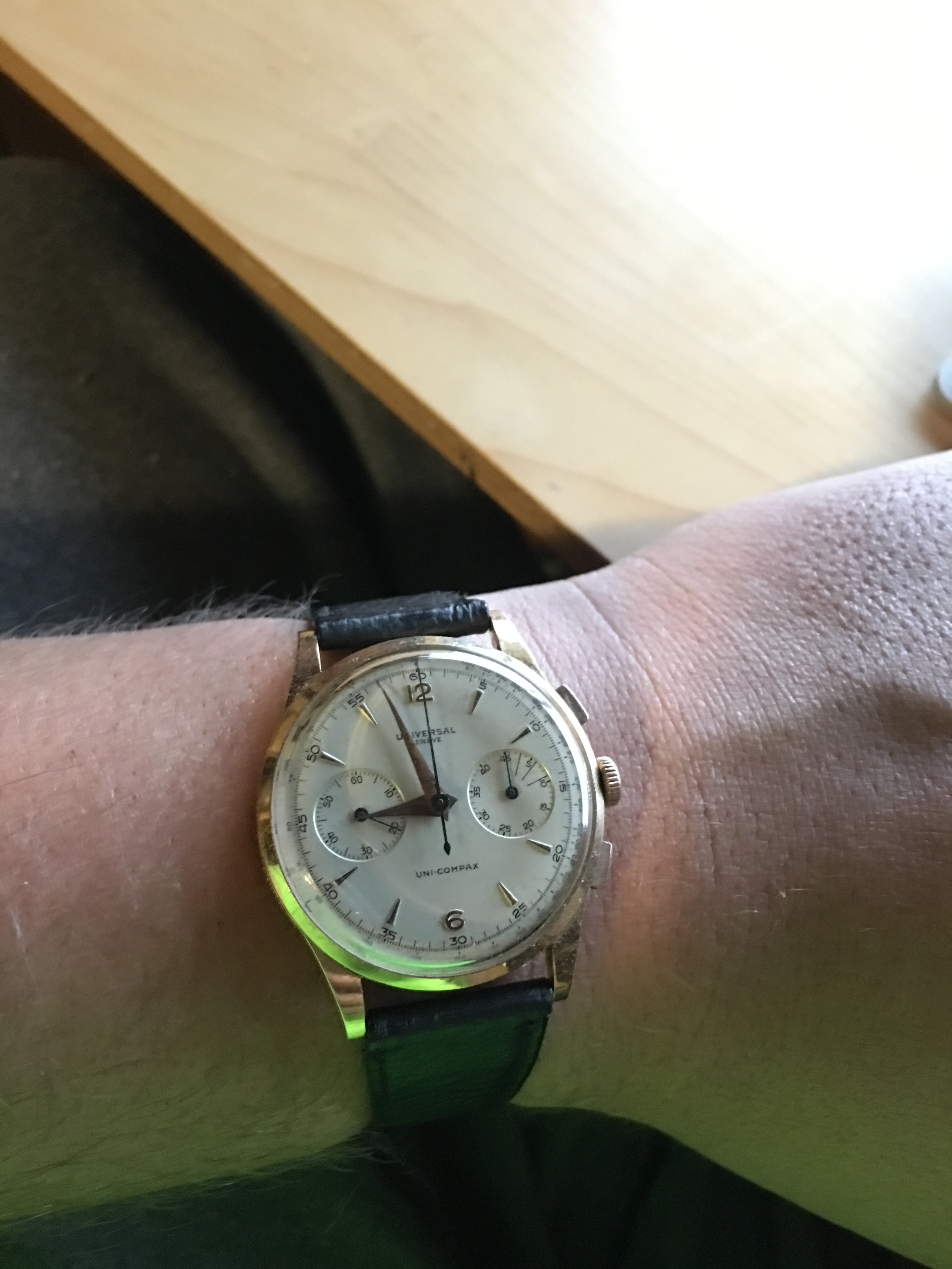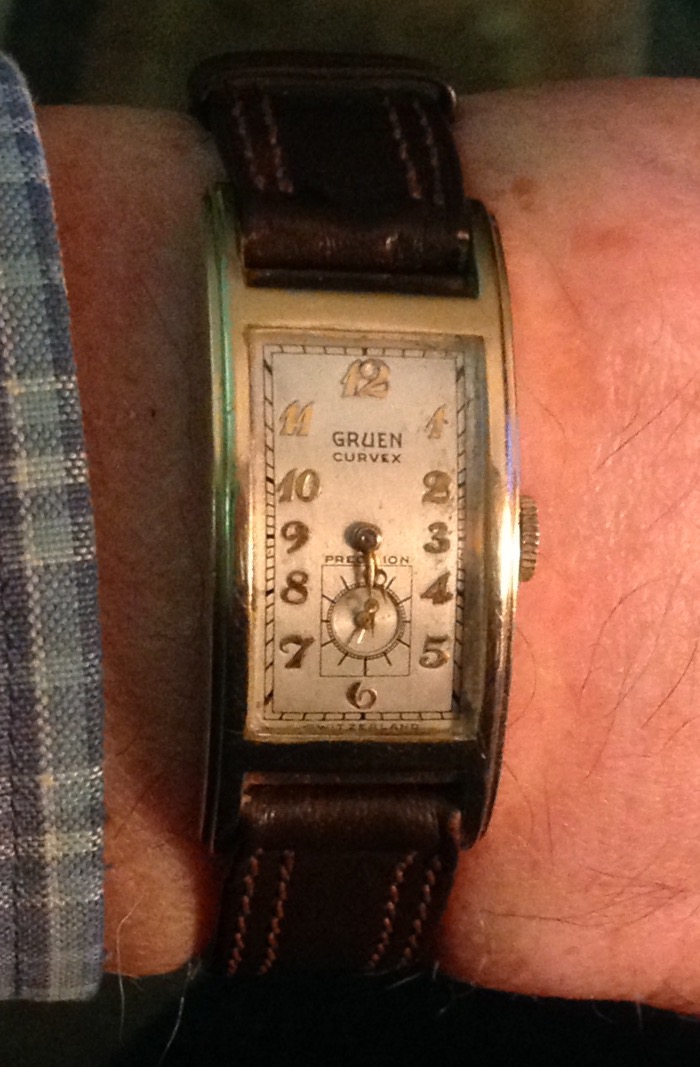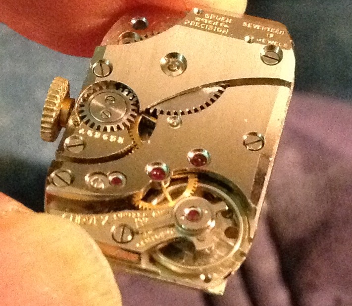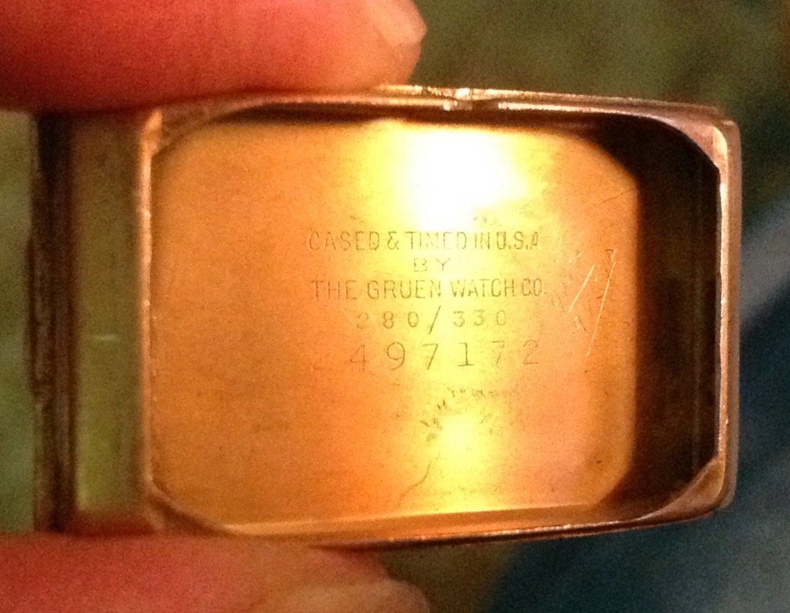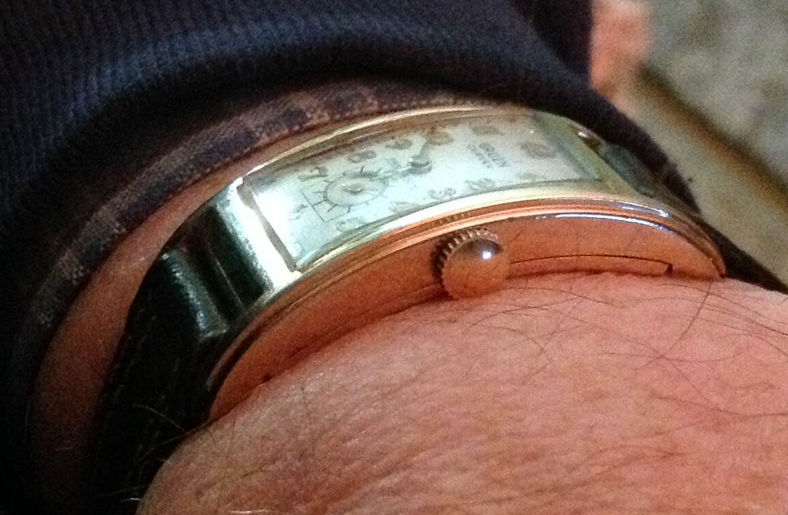Back on my wrist again after a too long stay in sick bay while it found the parts I needed, and found the time and inclination to finish the job. This one is a style 280, calibre 330 Gruen Curvex, gold filled case, 45 mm x 20 mm. The unusual movement layout was designed for use in the Curvex series, and was used only in that series. Notice the pronounced curve which allows the 45mm long case to hug the wrist. Better strap forthcoming.