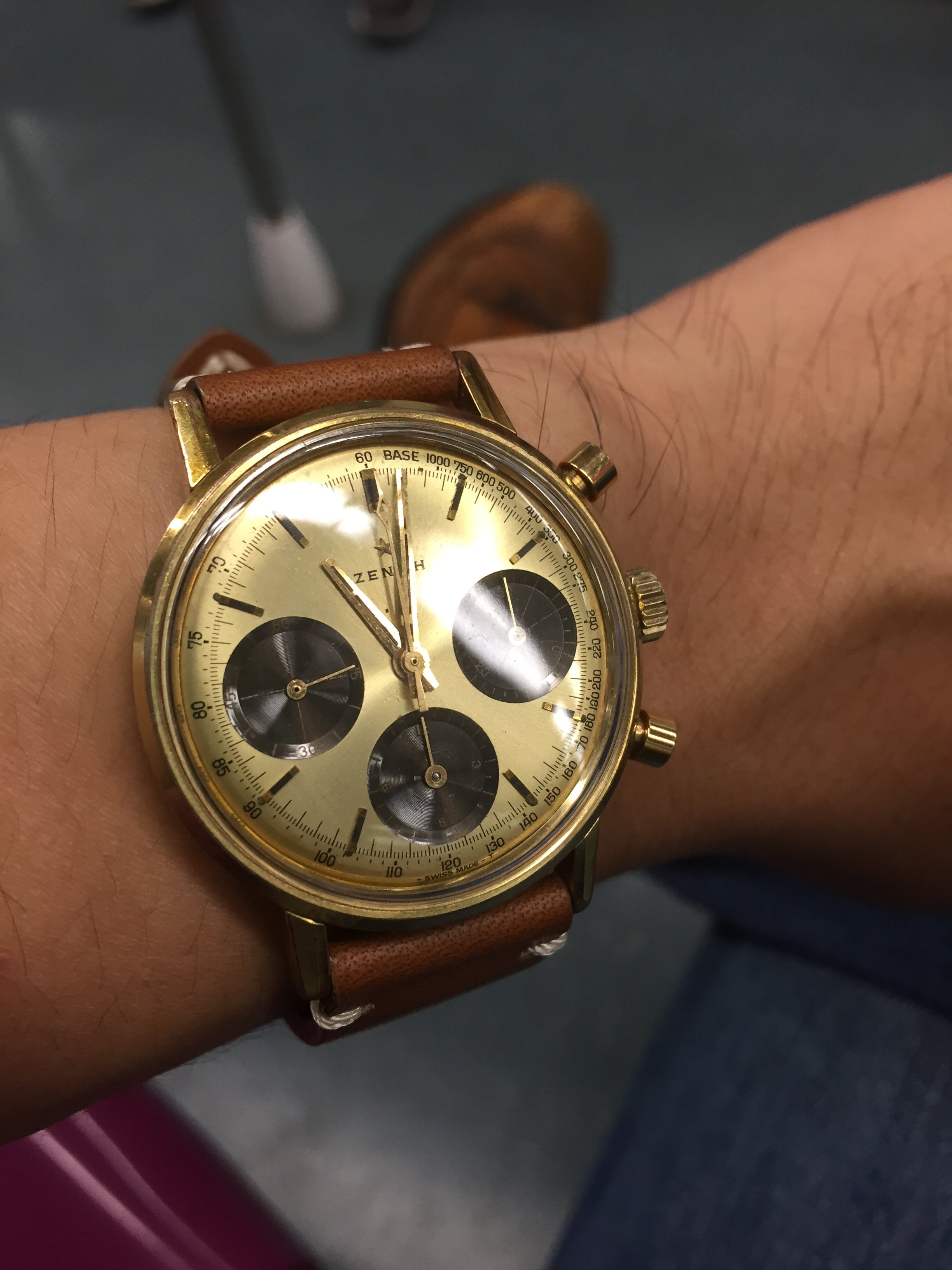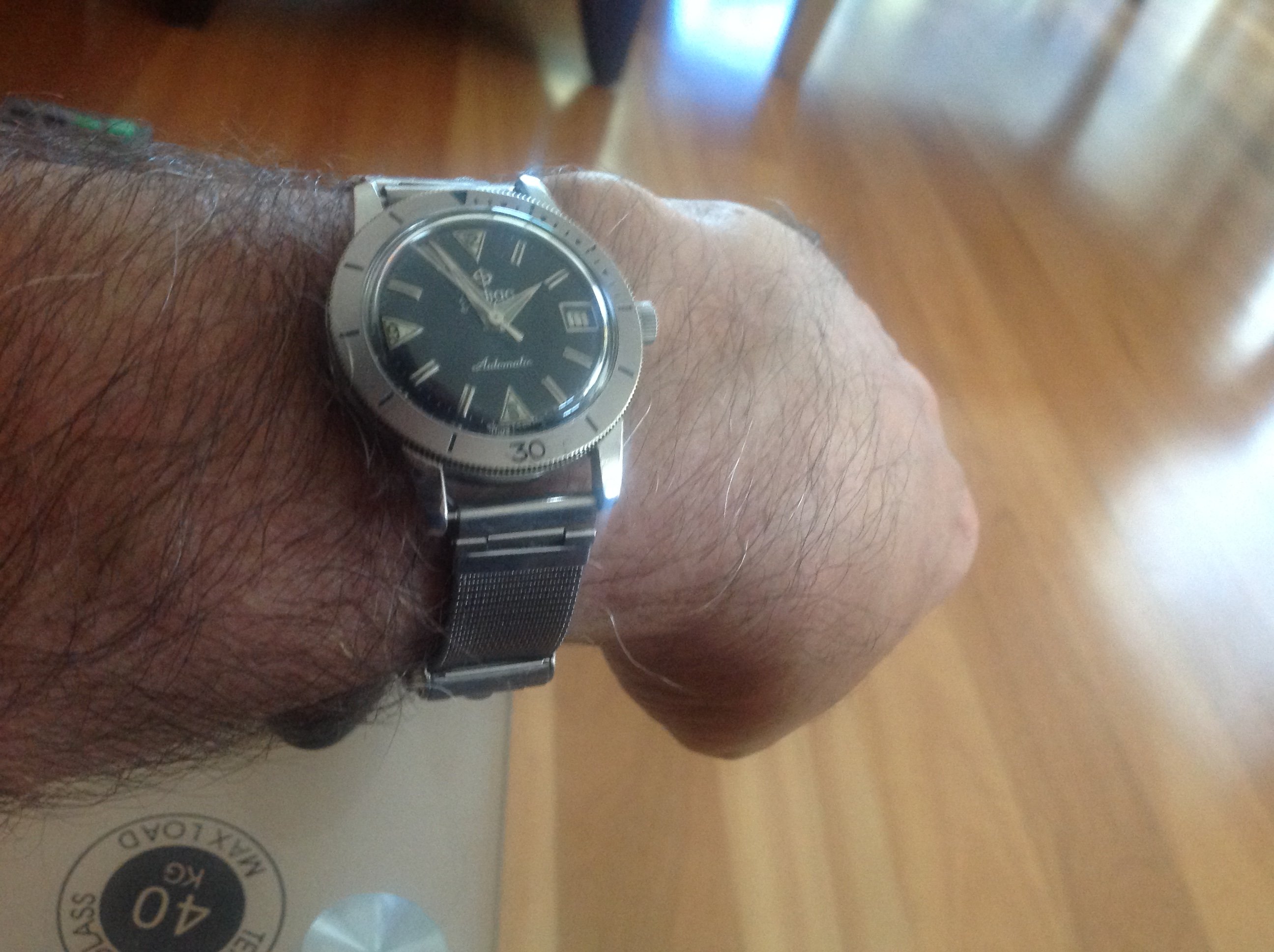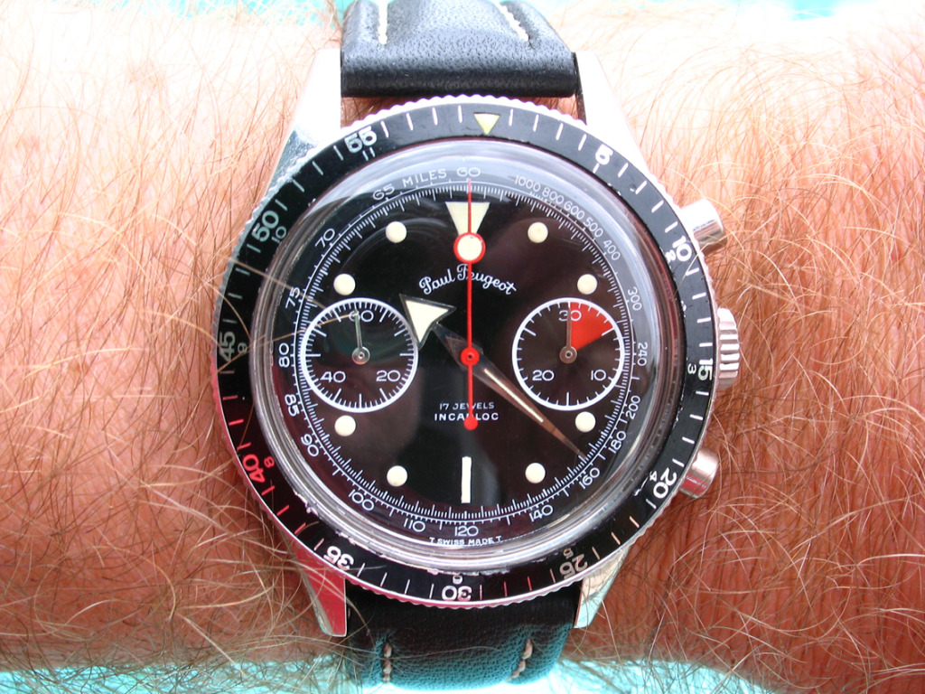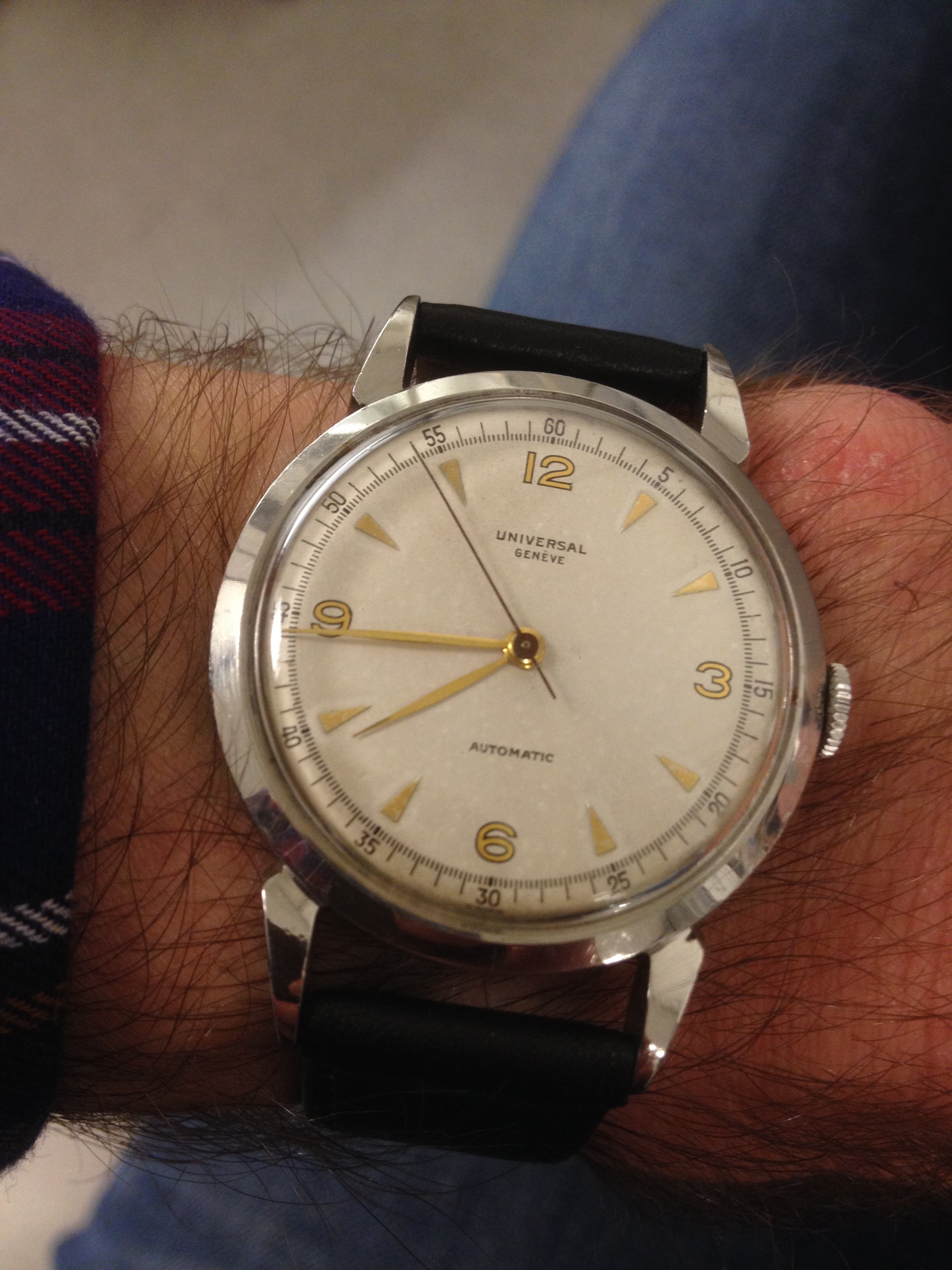 Back on my wrist again after a too long stay in sick bay while it found the parts I needed, and found the time and inclination to finish the job. This one is a style 280, calibre 330 Gruen Curvex, gold filled case, 45 mm x 20 mm. The unusual movement layout was designed for use in the Curvex series, and was used only in that series. Notice the pronounced curve which allows the 45mm long case to hug the wrist. Better strap forthcoming.
