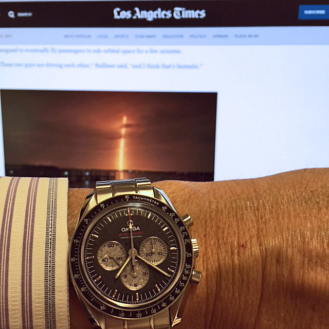 Yes it's Speedy Tuesday, but today I wear this watch to commemorate what happened last evening, which was truly monumental for space flight. Returning a large rocket booster from an orbital launch, back to the ground for future re-use would have been considered pure fantasy just a few years ago. As I watched the launch and booster return coverage last night I have to confess that I became rather misty-eyed at the sight of all those bright, 20- to 30- year olds sitting in the control room at SpaceX's headquarters here in Los Angeles. I suddenly felt tremendous hope for the future of our species, which is such a contrast to how I often feel when I witness the utter stupidity acted out in the contemporary political arena. Congratulations to Elon Musk and all his brilliant kids at SpaceX.