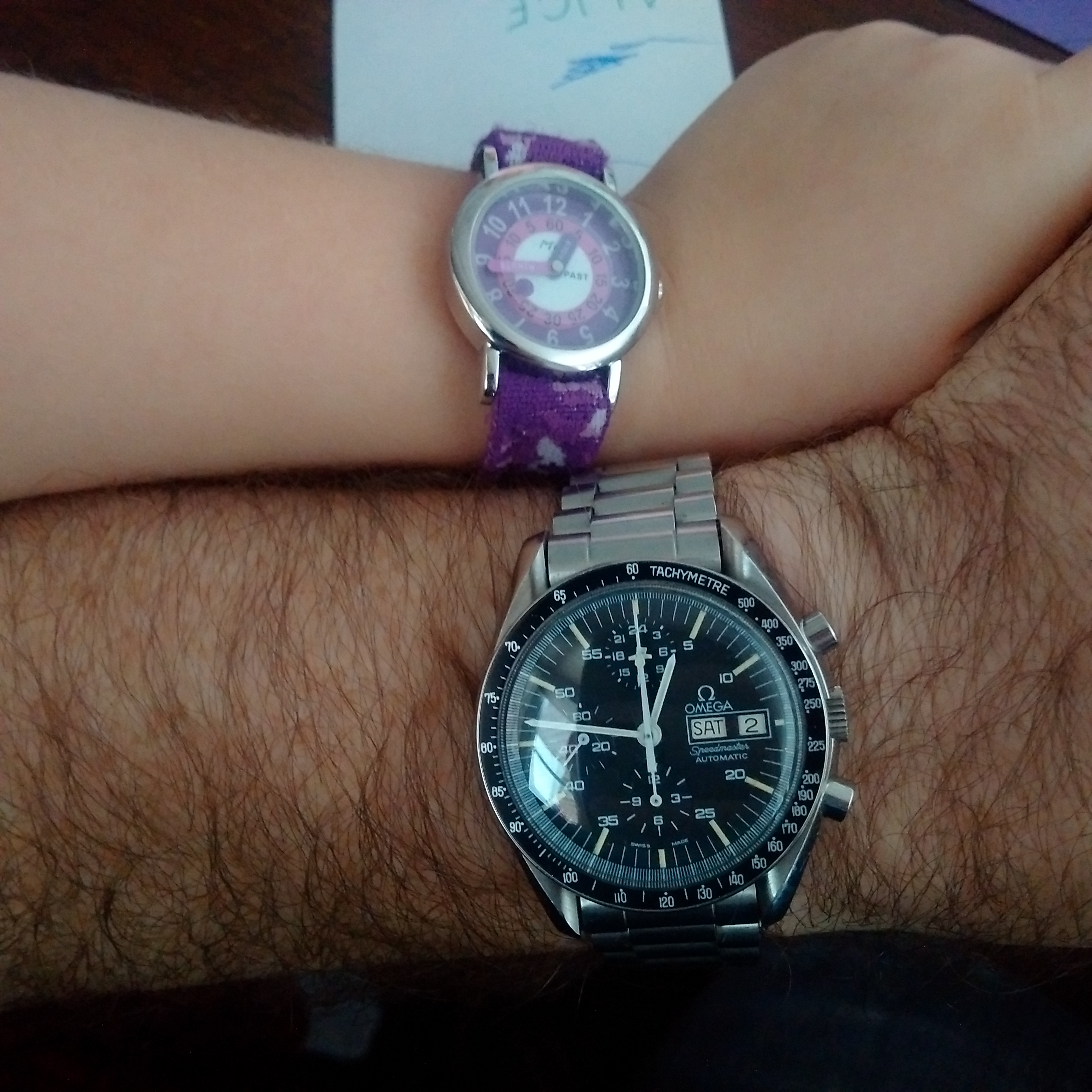 My daughter graduated from digital Spiderman watch to analog (quartz) Time Learner. See how the minute hand matches the minute track? Notice the floating disc seconds indicator?