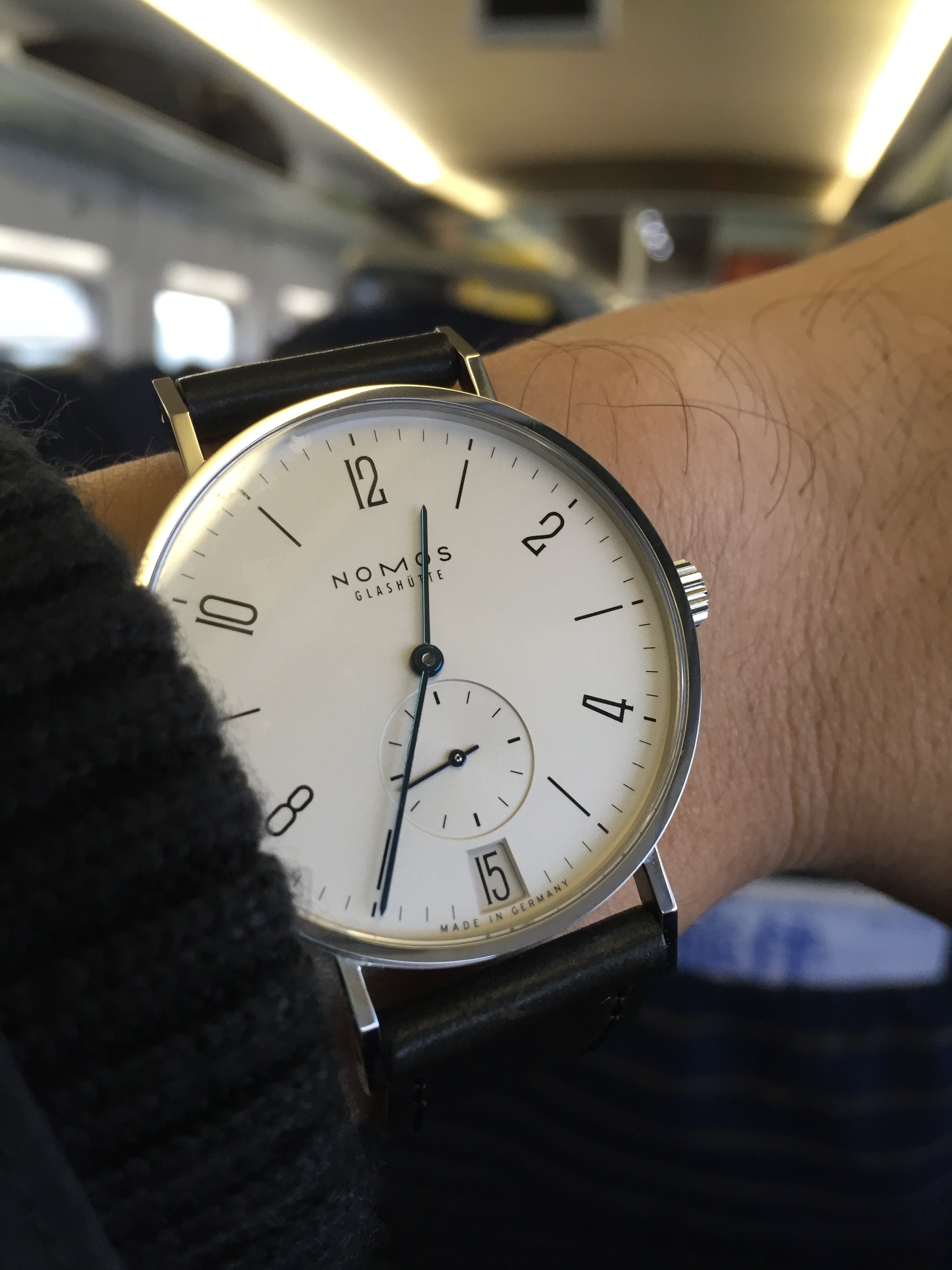 The movement is an A. Schild AS1701 modified for 24h and enhanced by the ingenius zero-stop mechanism: the seconds hand stops at 0 if the crown is pulled.