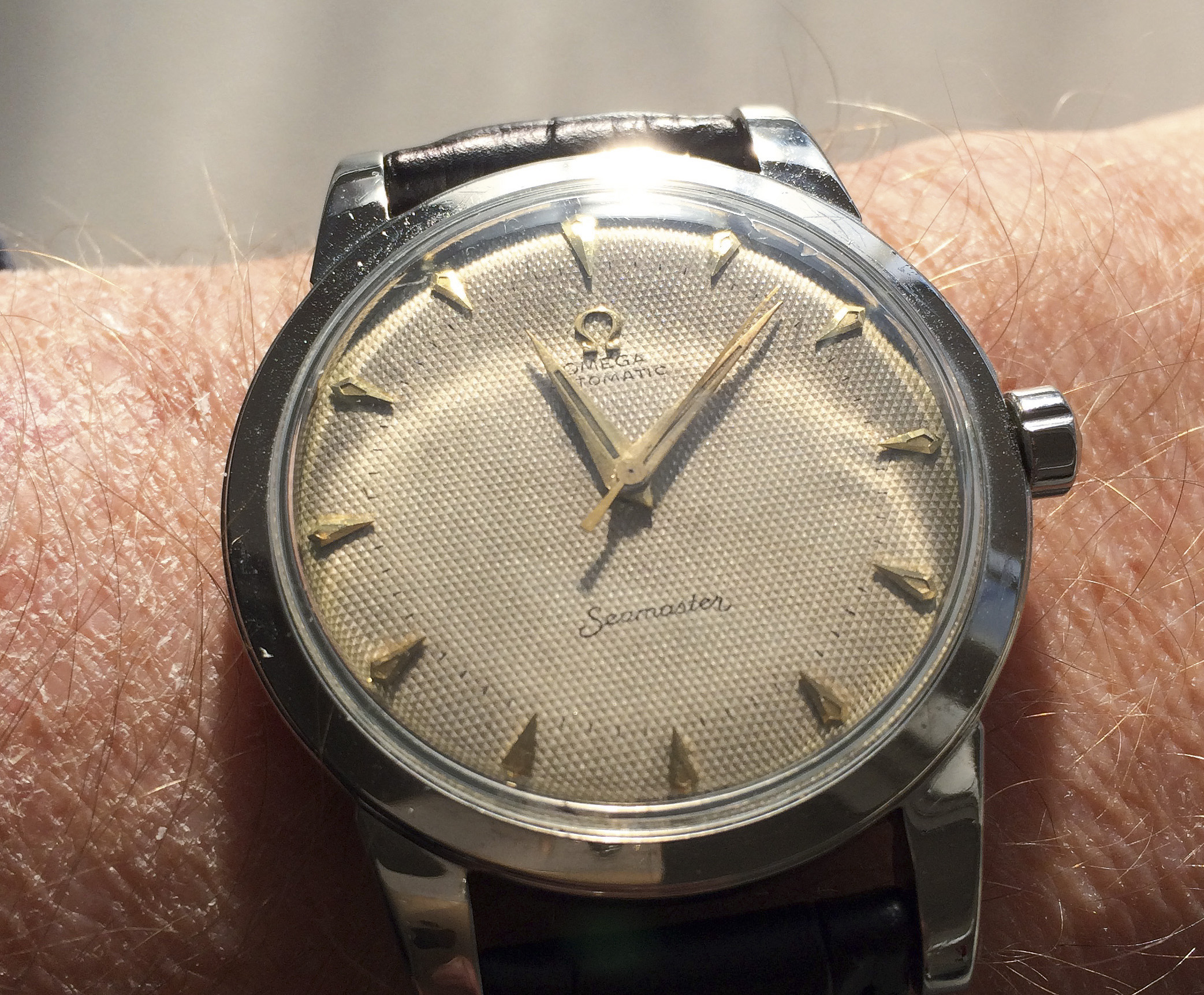 A small chink of light at just after 11am in this gloomy London day is just enough to hit this early 50’s ‘Jumbo’ textured Seamster…………..I guess this might have been quite a statement on the wrist in its day..........