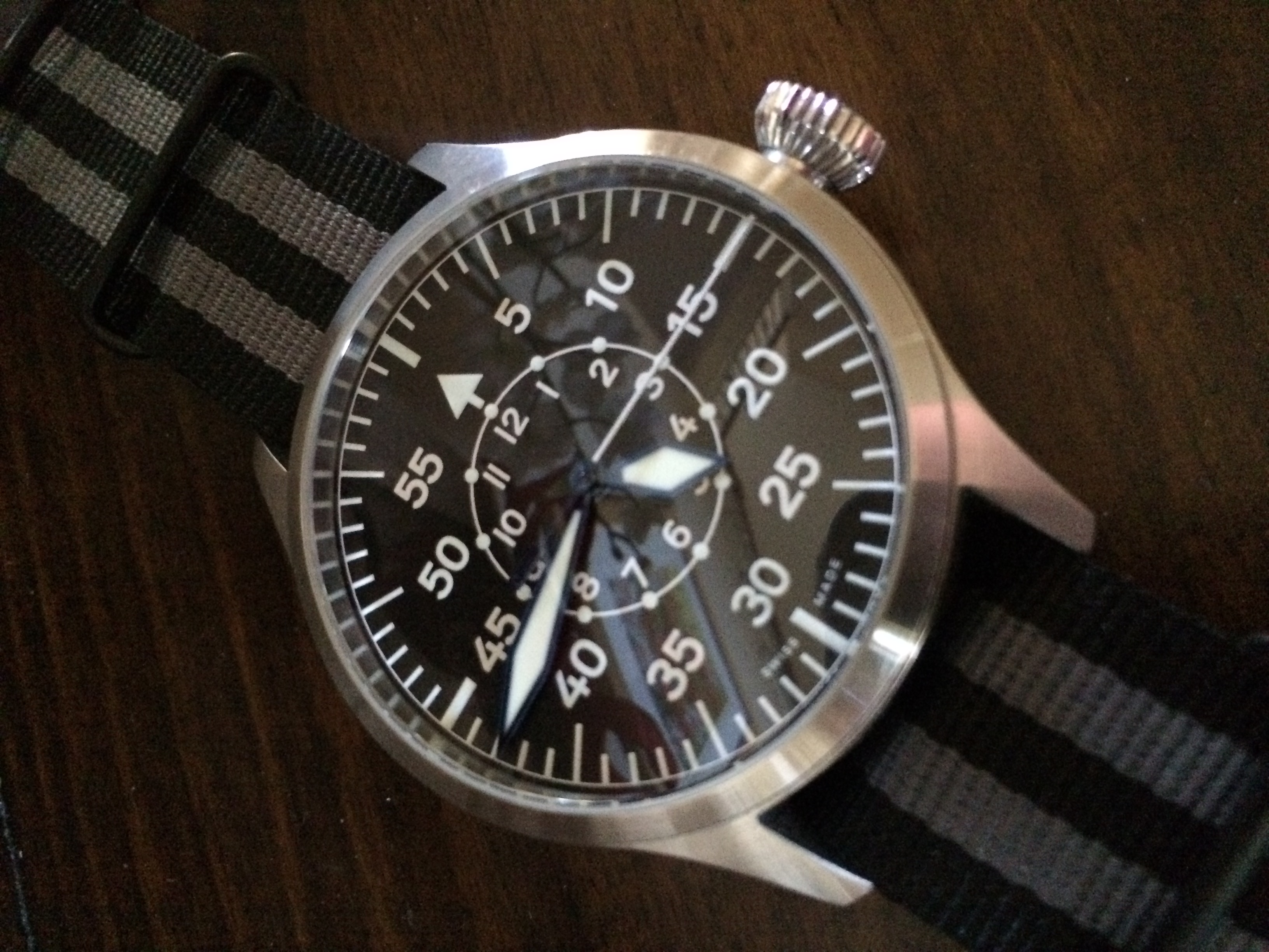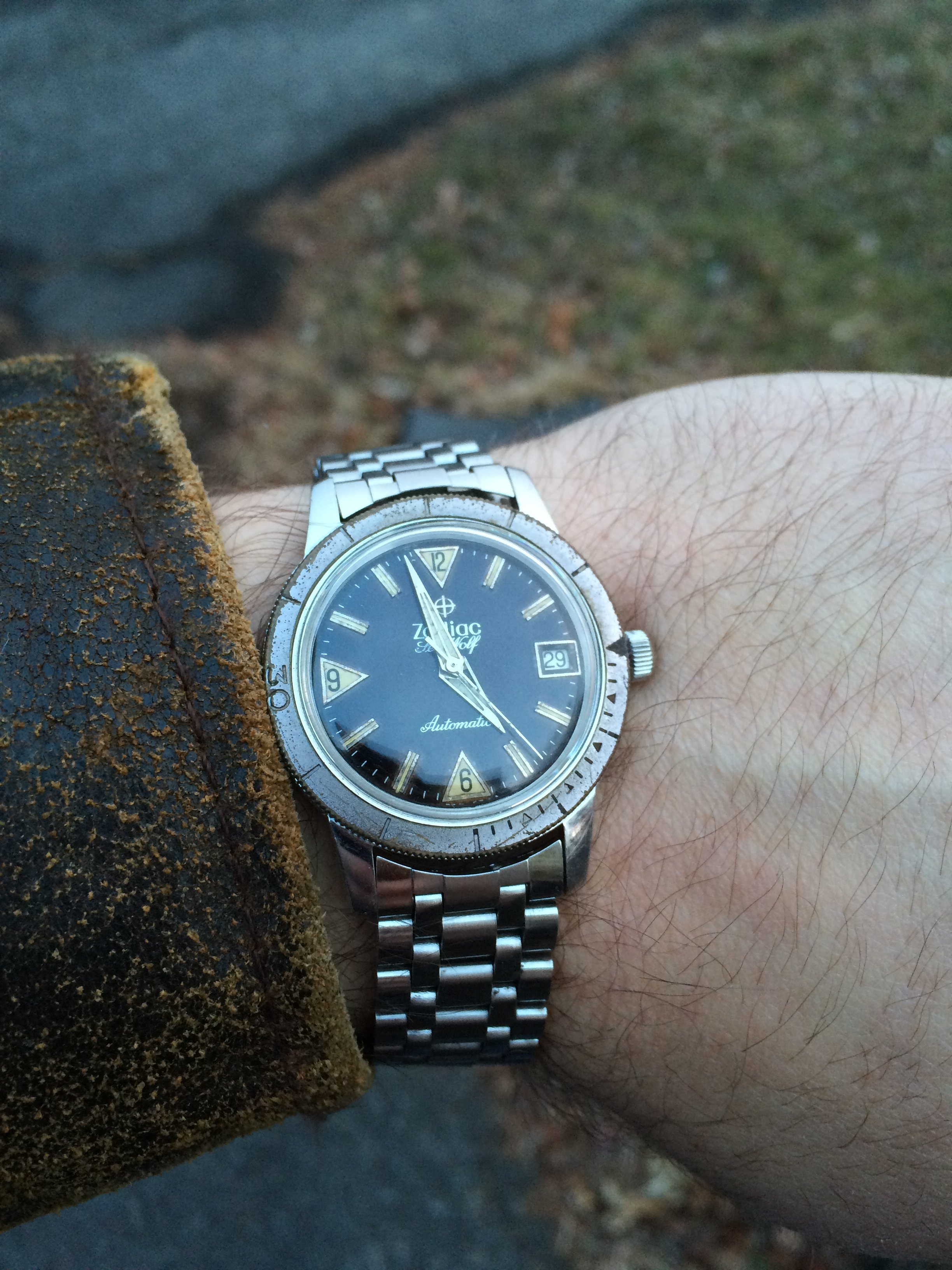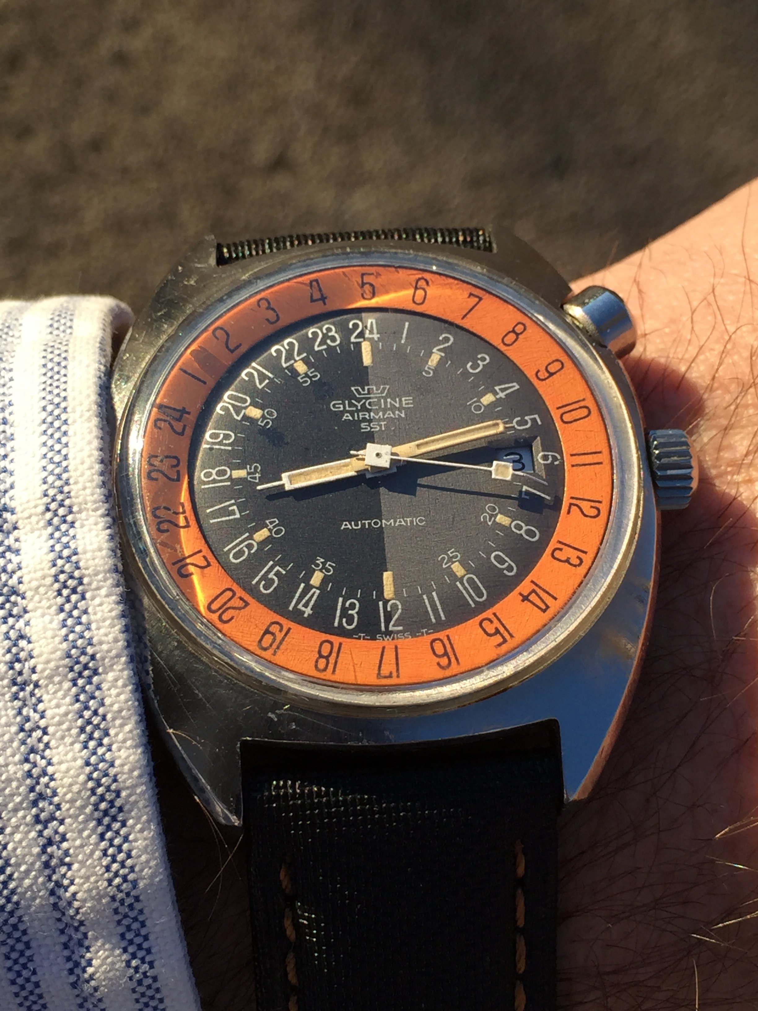 A small chink of light at just after 11am in this gloomy London day is just enough to hit this early 50’s ‘Jumbo’ textured Seamster…………..I guess this might have been quite a statement on the wrist in its day..........