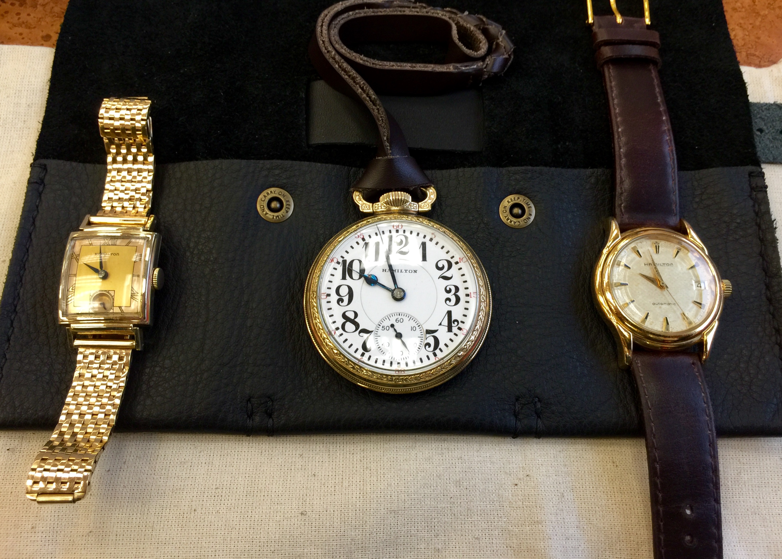 From left to right...Hamilton "Ross" inherited from my father when he passed away 20 years ago...Hamilton 992 purchased about 20 years ago from my uncle [who is a watchmaker/clockmaker]...Hamilton automatic inherited from my father-in-law when he passed away 8 years ago.