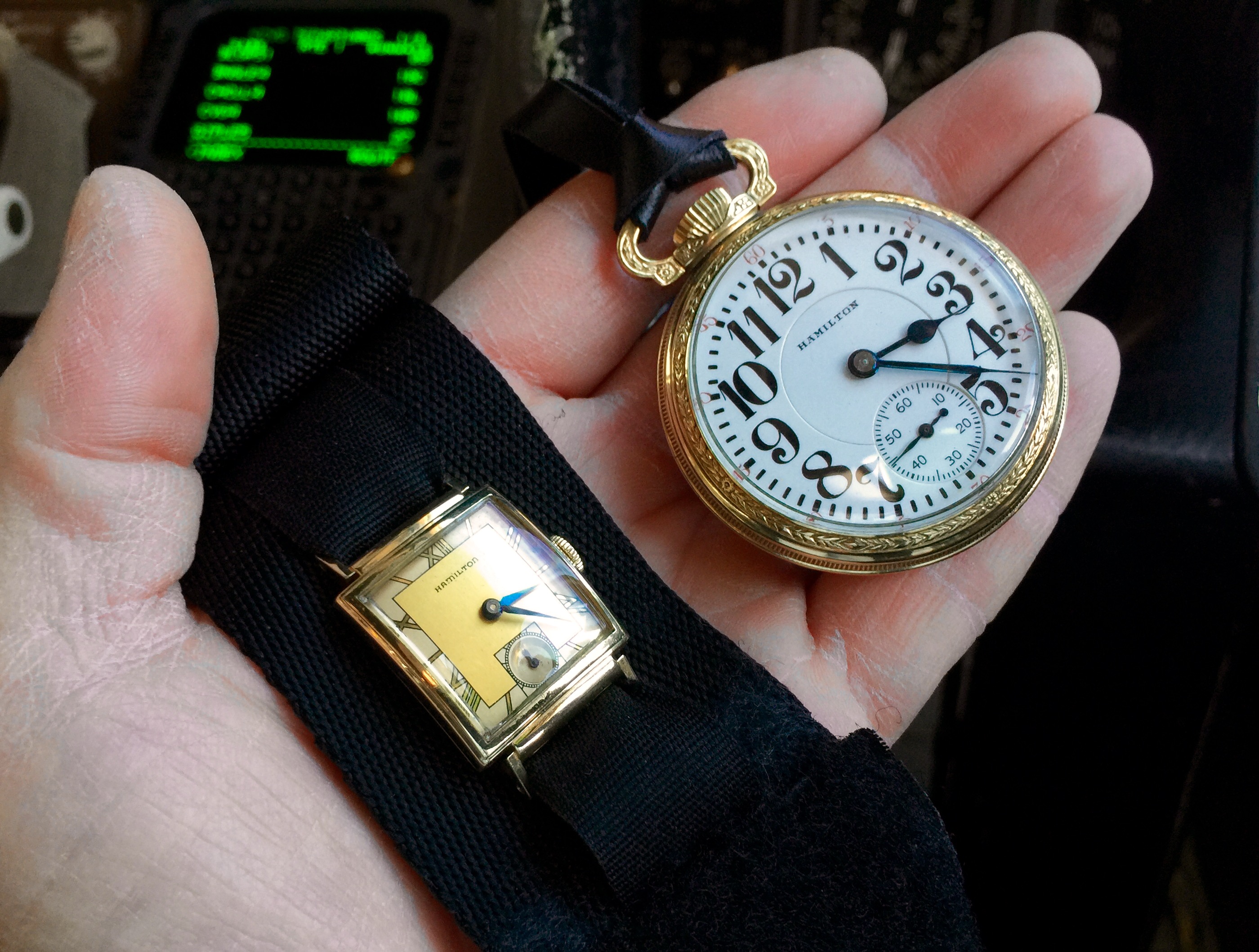 Back at the office today hauling vintage Hamiltons...my father's Hamilton Ross on the almighty Rothco Commando protective band and my Hamilton 992 purchased from my uncle...good times...馃憤