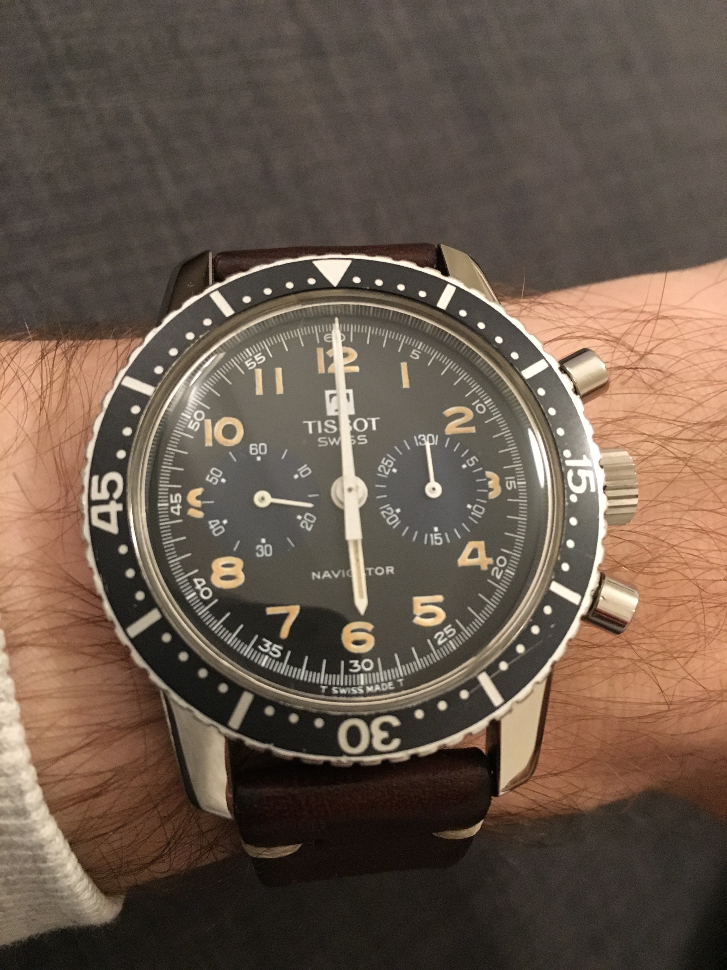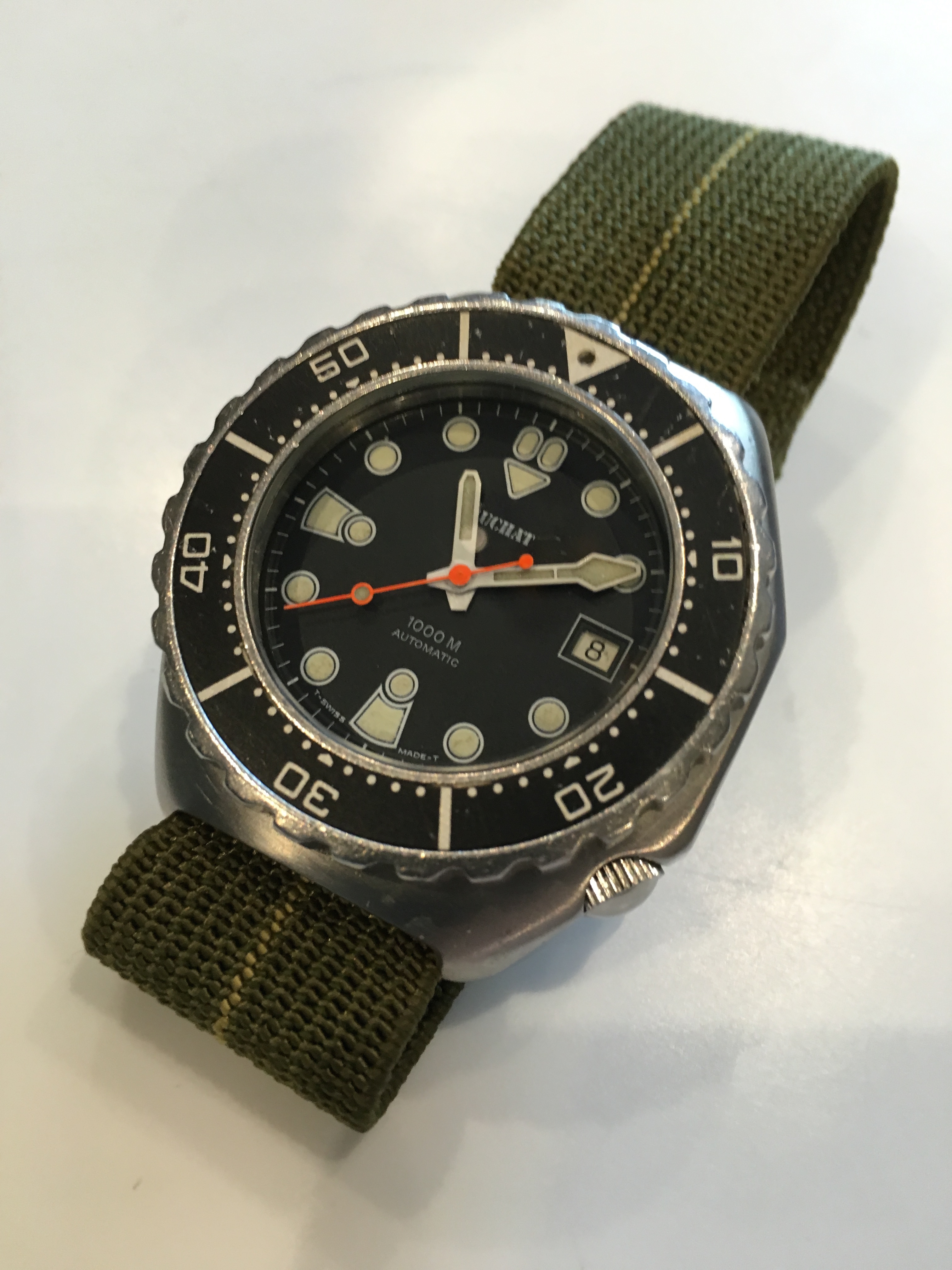 It took me a little over a year to find a surplus Marine National elastic-strap for this issued Beuchat 1000m. Feels complete now. Forgive the light glare.