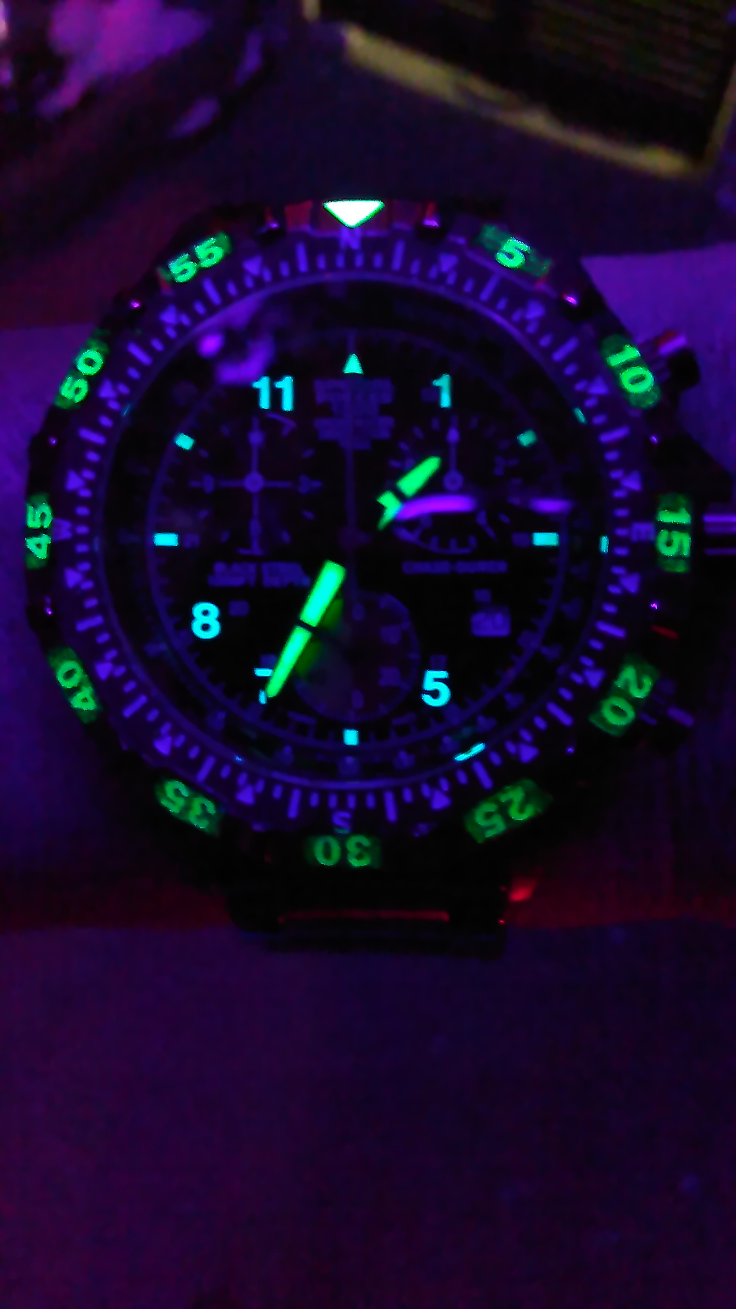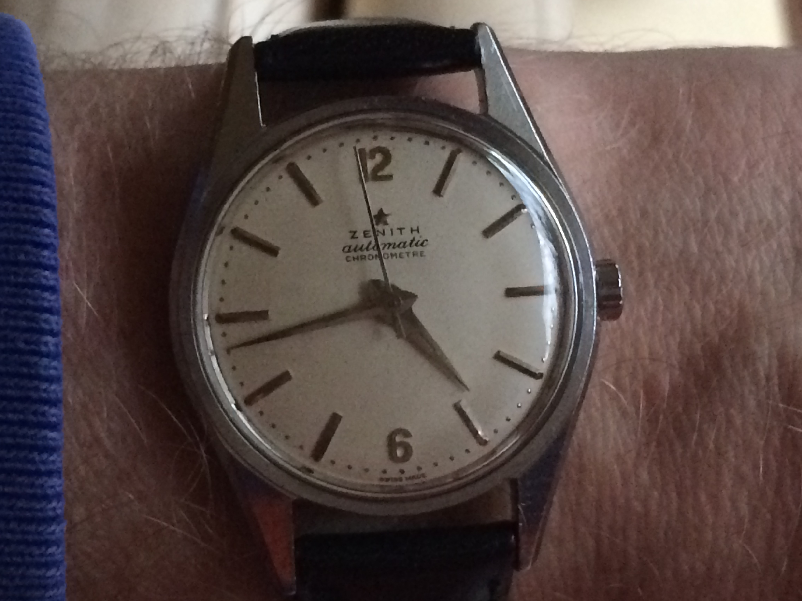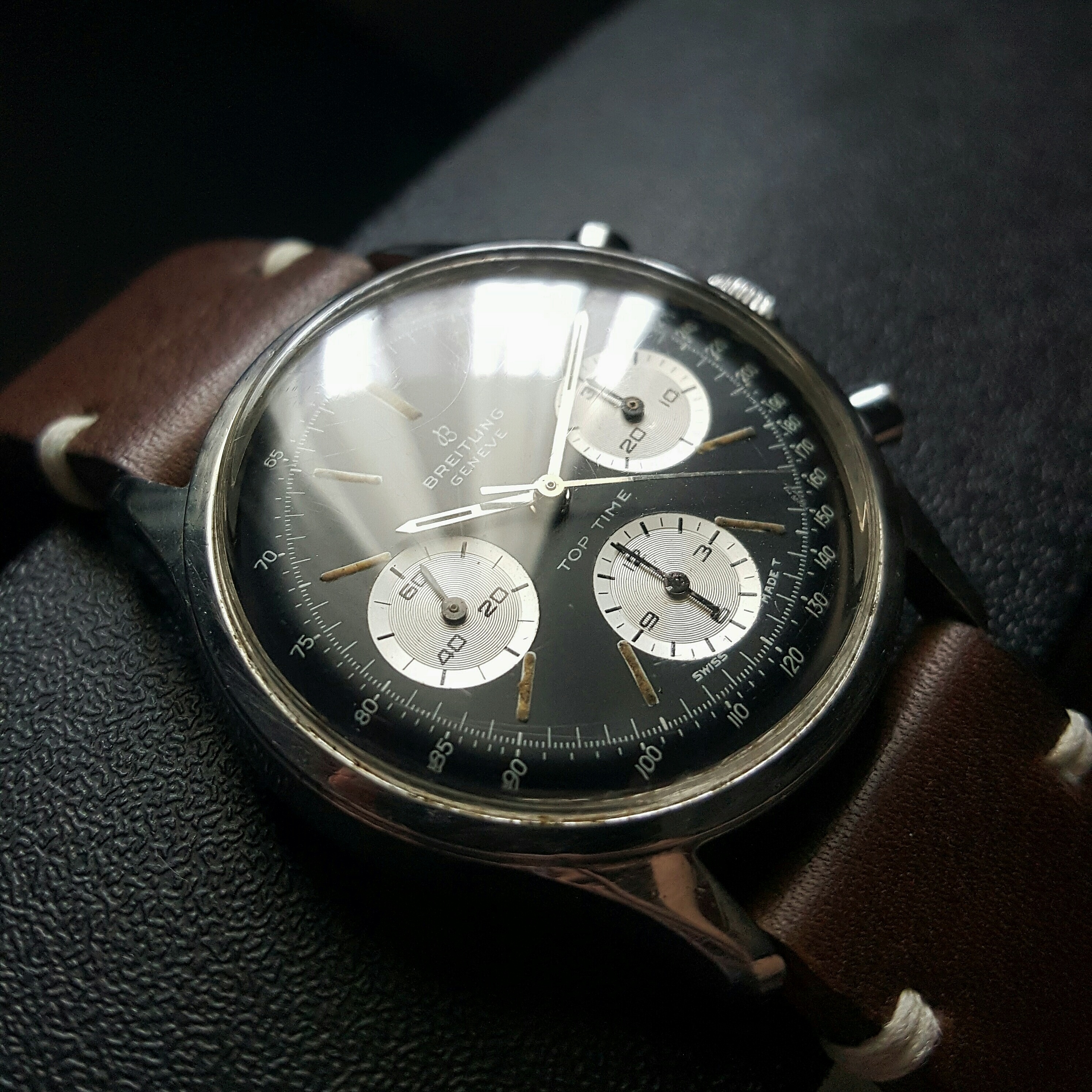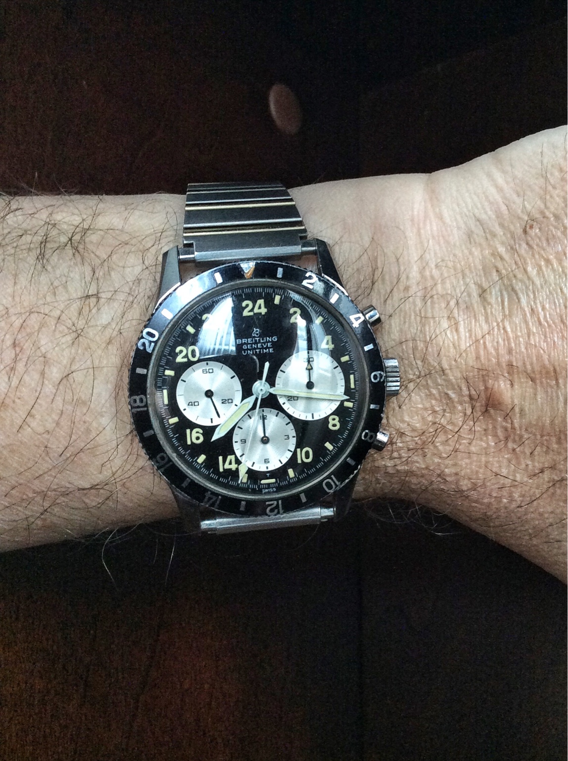 A coin dealer friend has had this Breitling 1765 sitting in his safe for the last five years. He purchased it as part of a lot with mostly junk watches and jewelry and so was convinced that it was a fake. I am certain it is not. Apart from minor rust around the pusher at 4, and the fact that the chrono sub minute dial does not move, it is in very good shape. I'll be bringing the watch to a jeweler who deals in Breitling for servicing and authentication. I want to keep this watch in the worst way, but the value will be out of my range. I am enjoying it on my wrist while I can, even with a cheap Speidel bracelet.