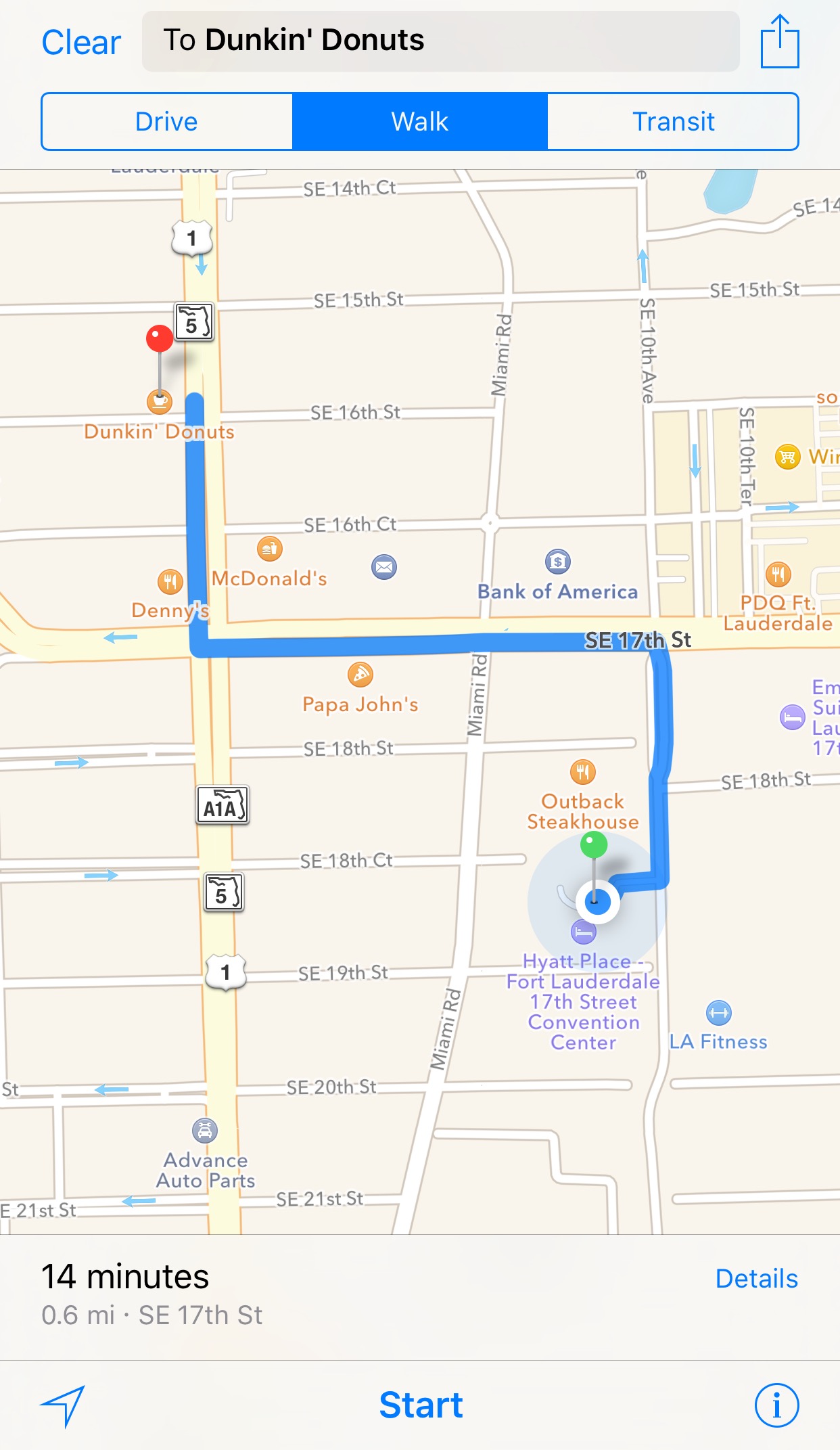 Well...I don't know the distances but it took me 60 minutes to walk from the layover motel to Hooters...then 60 minutes back to the layover motel. So I hit my DD Finder and DD is 13 minutes from the layover motel (see screen shot below)...therefore, the total walking time from Hooters to DD is about 75 minutes one way. I don't have my '07 Ford Police Interceptor or my '10 Schwinn Sprint fixed gear bike with me so I'm unable to determine those numbers. 馃槈