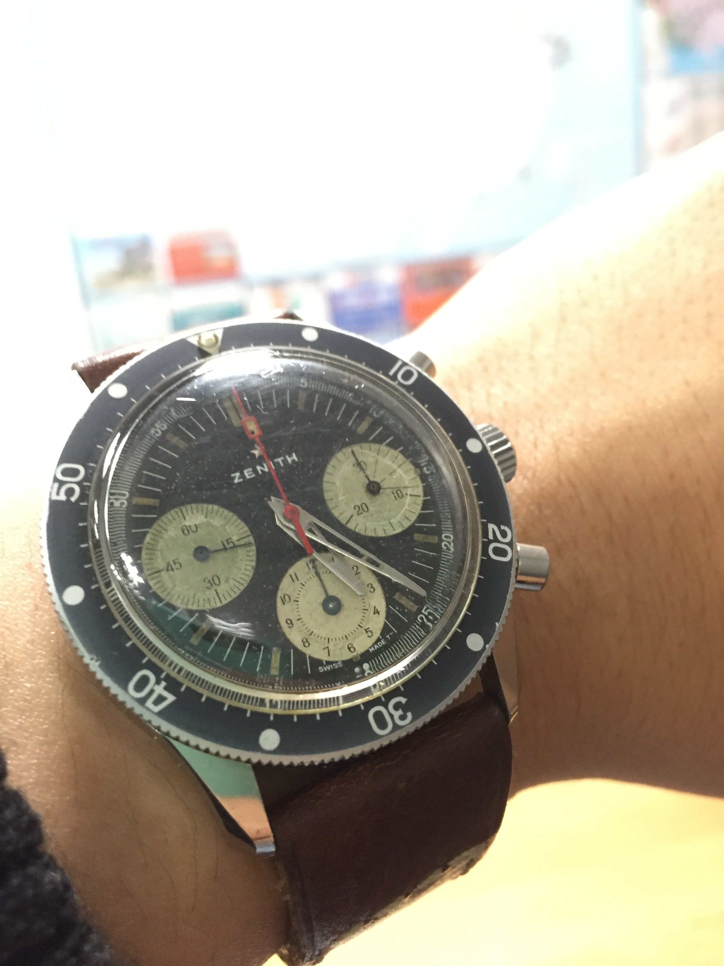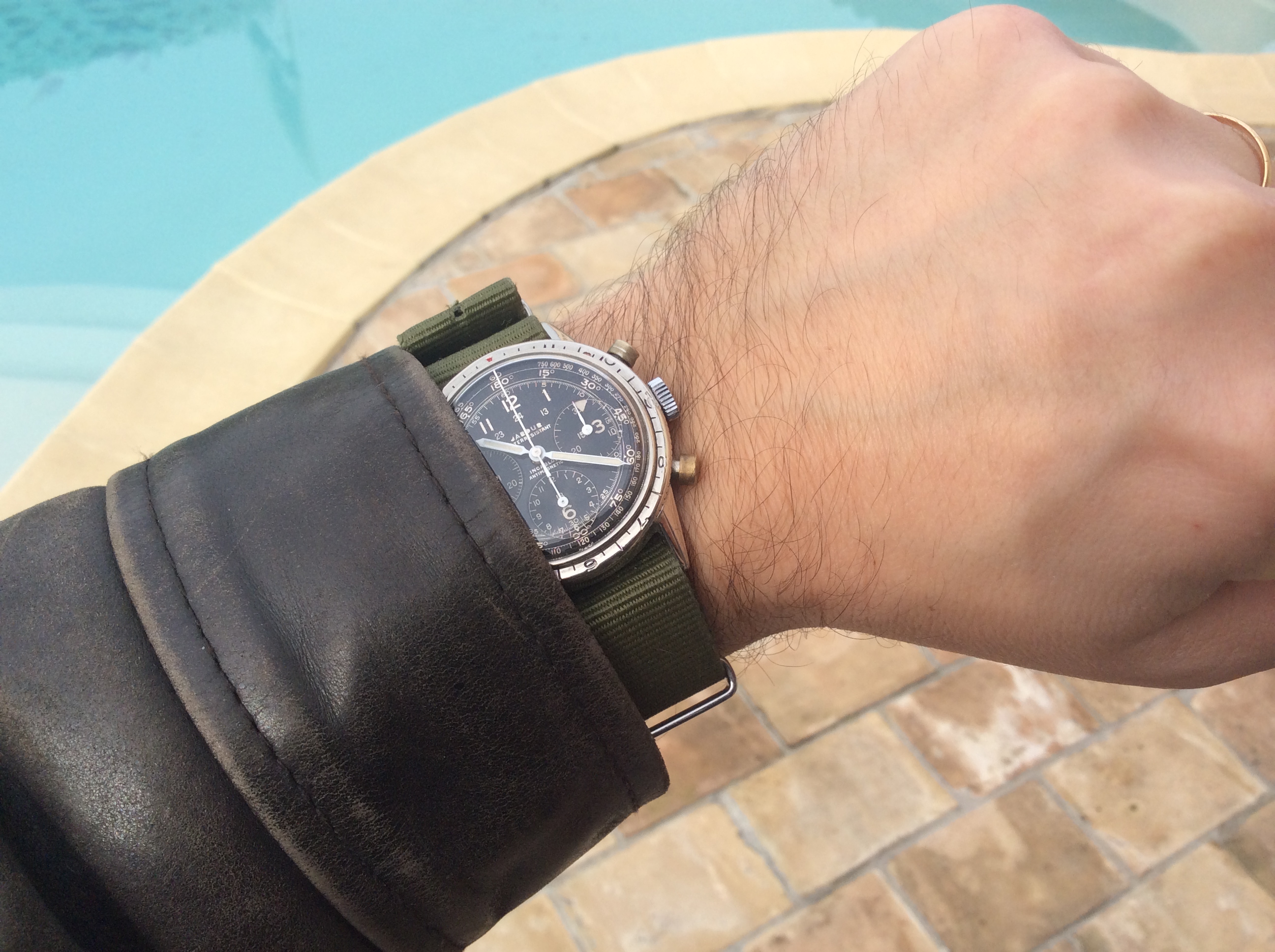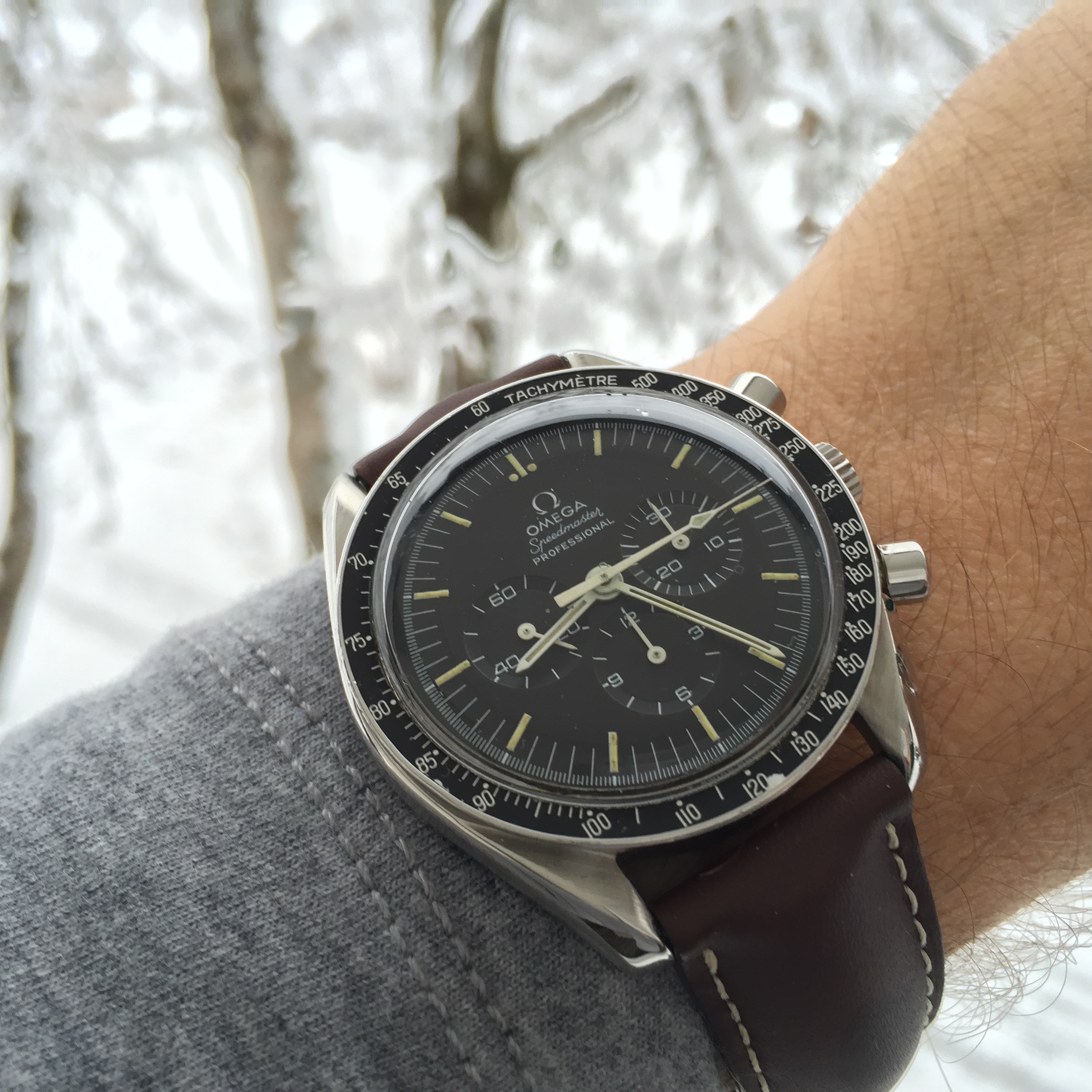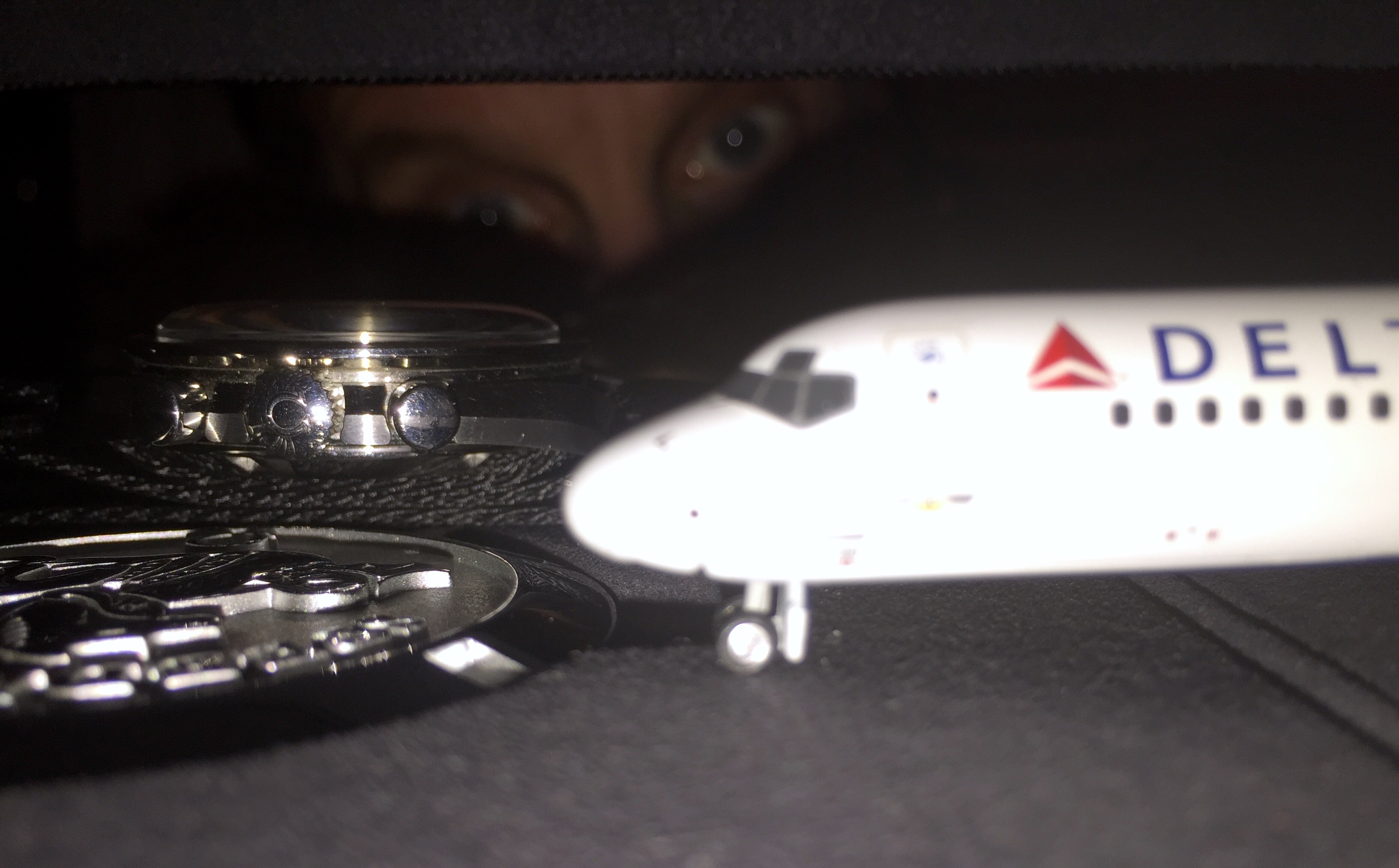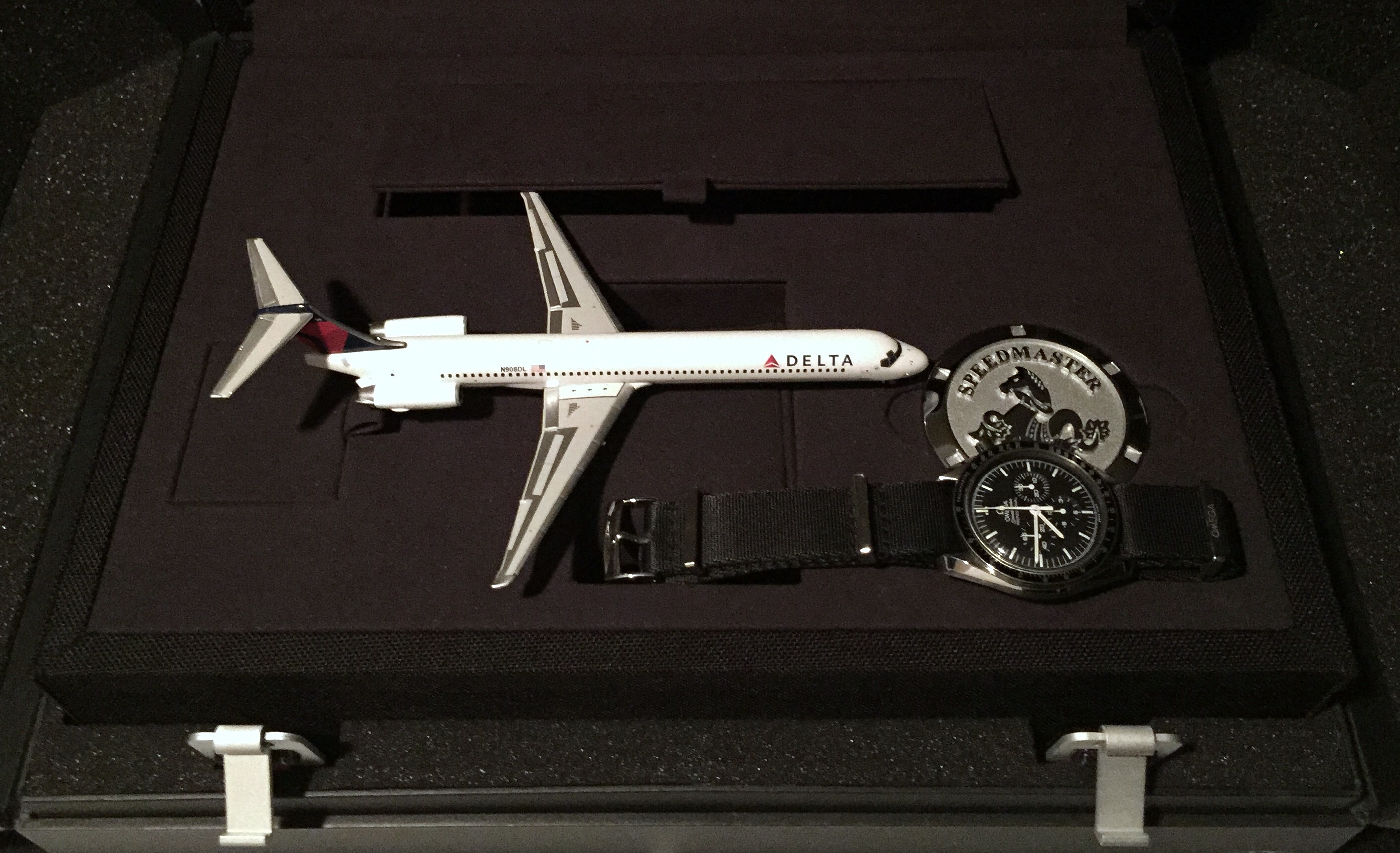 Switched to the Omega black polyamide NATO band on Speedy Gonzales for the evening...AND just for kicks to prove that an MD-88 (Mad Dog) aircraft will fit inside the ridiculously humongous Omega Speedy Gonzales Moonwatch presentation box with the LID FULLY CLOSED...took a pic from INSIDE the presentation box with the LID FULLY CLOSED...by placing the phone camera (utilizing the timer and flash) in the presentation box's large accessory bin. 馃榿