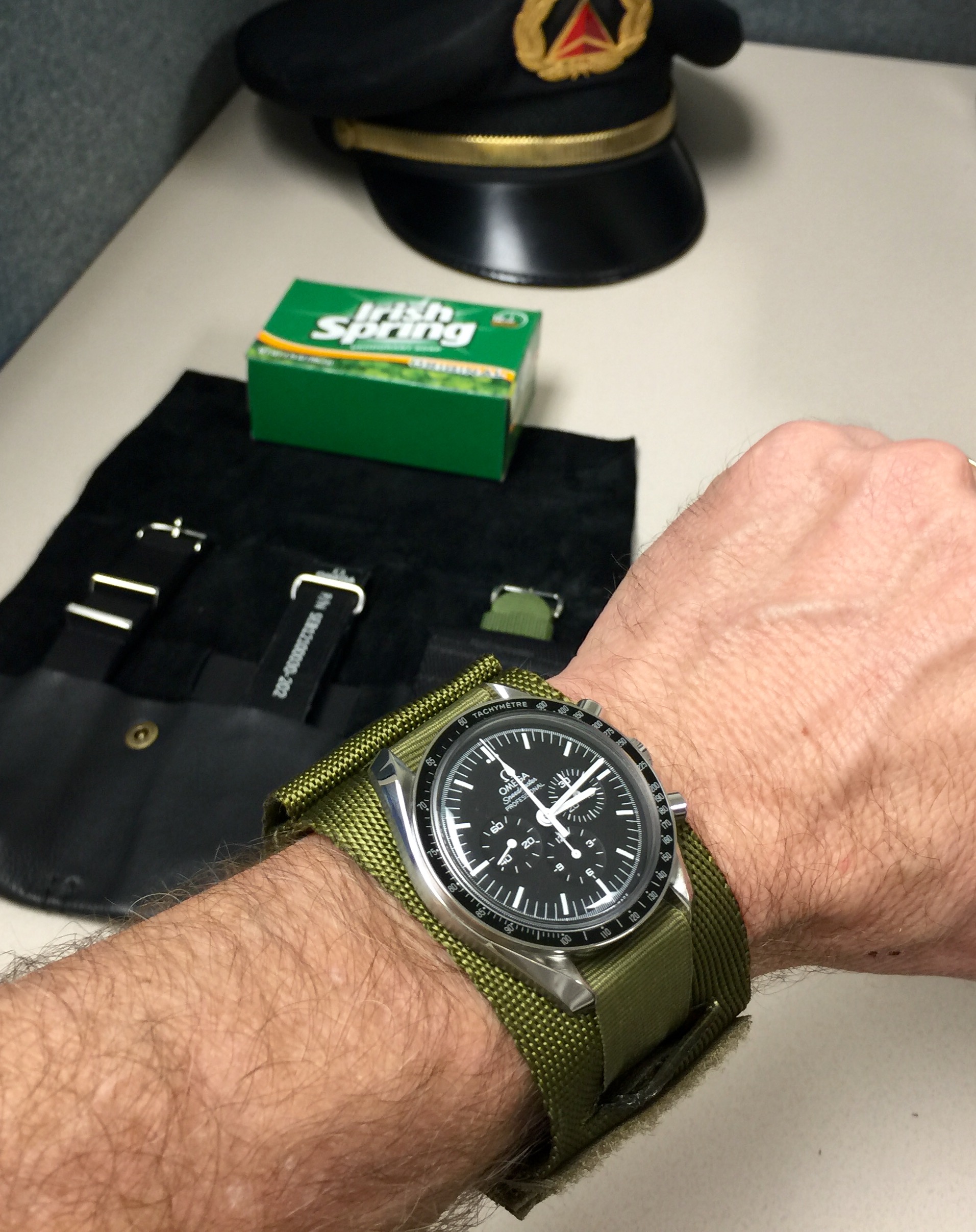 Was called in to work at the donut factory...so a strap change to the Rothco protective band in olive drap [green] was in order...being Saint Patty's Day and all. Box o' Irish Spring deodorant soap serves as my Saint Patty's Day [green] backup just in case some jack hole gives me grief about the Rothco not being the appropriate green. 😁