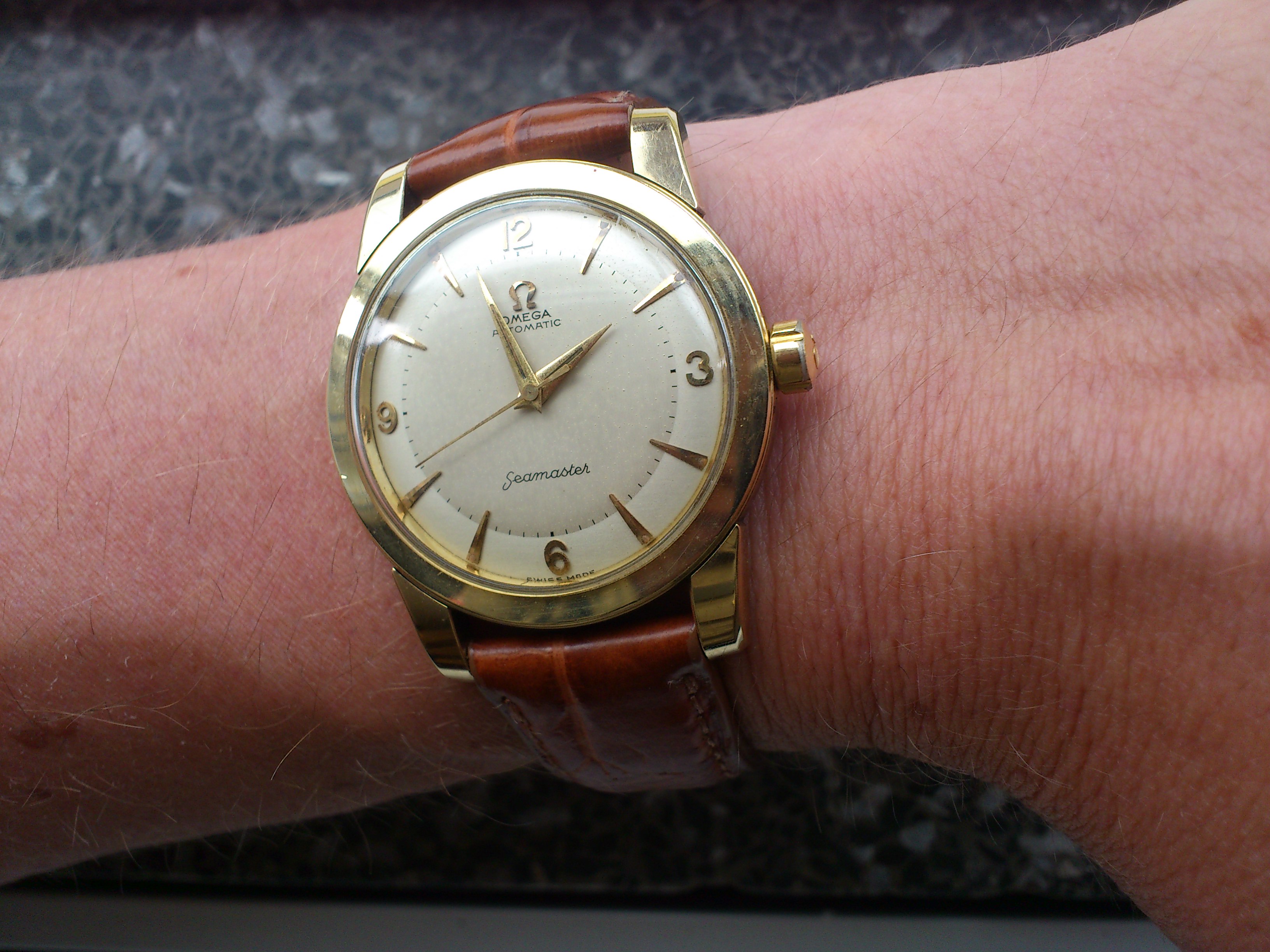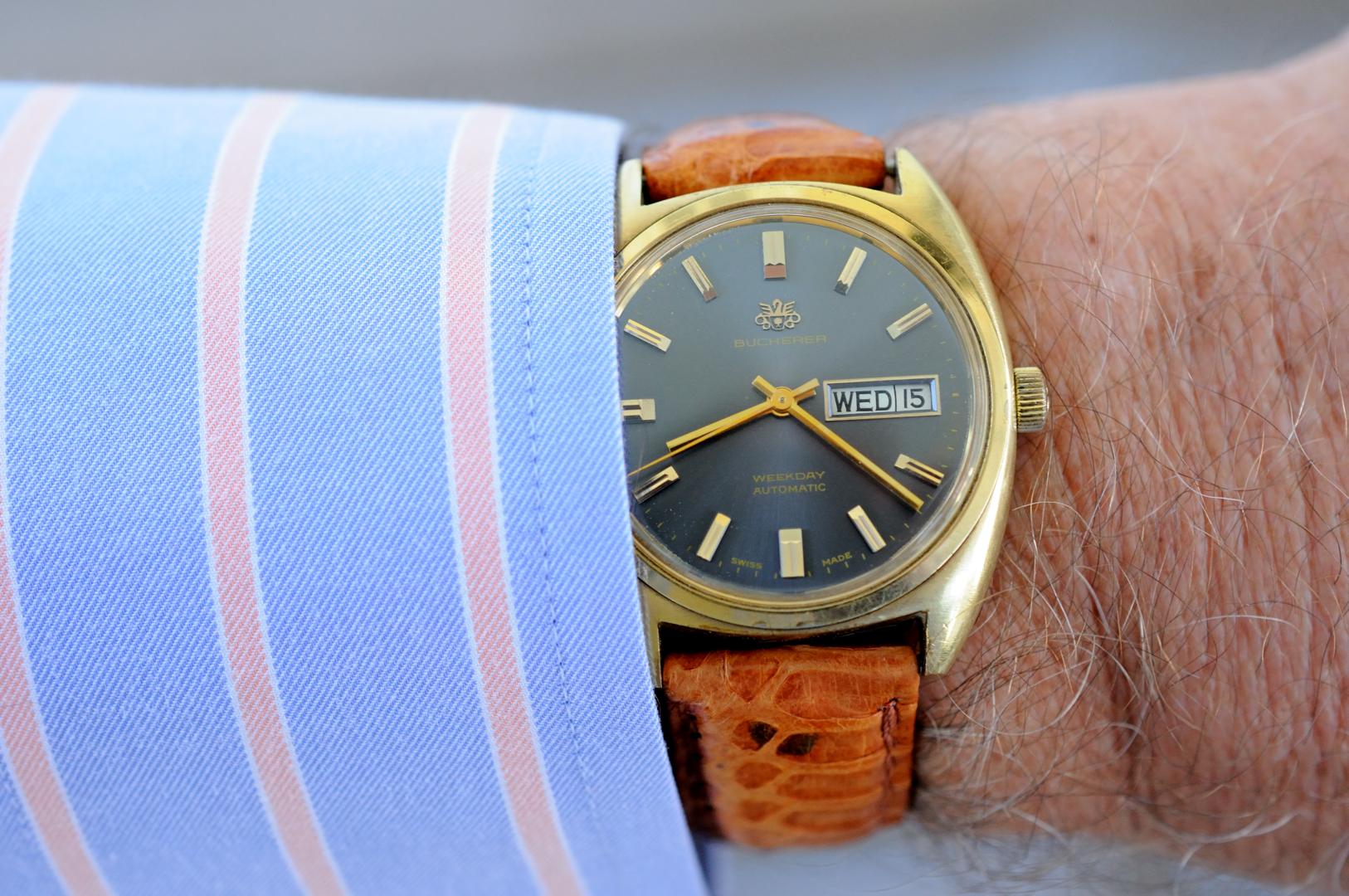 Here's a Bucherer Weekday gold capped and powered by an ETA 2788. The band is python and I put the original buckle on it. Not unattractive for an old beater...