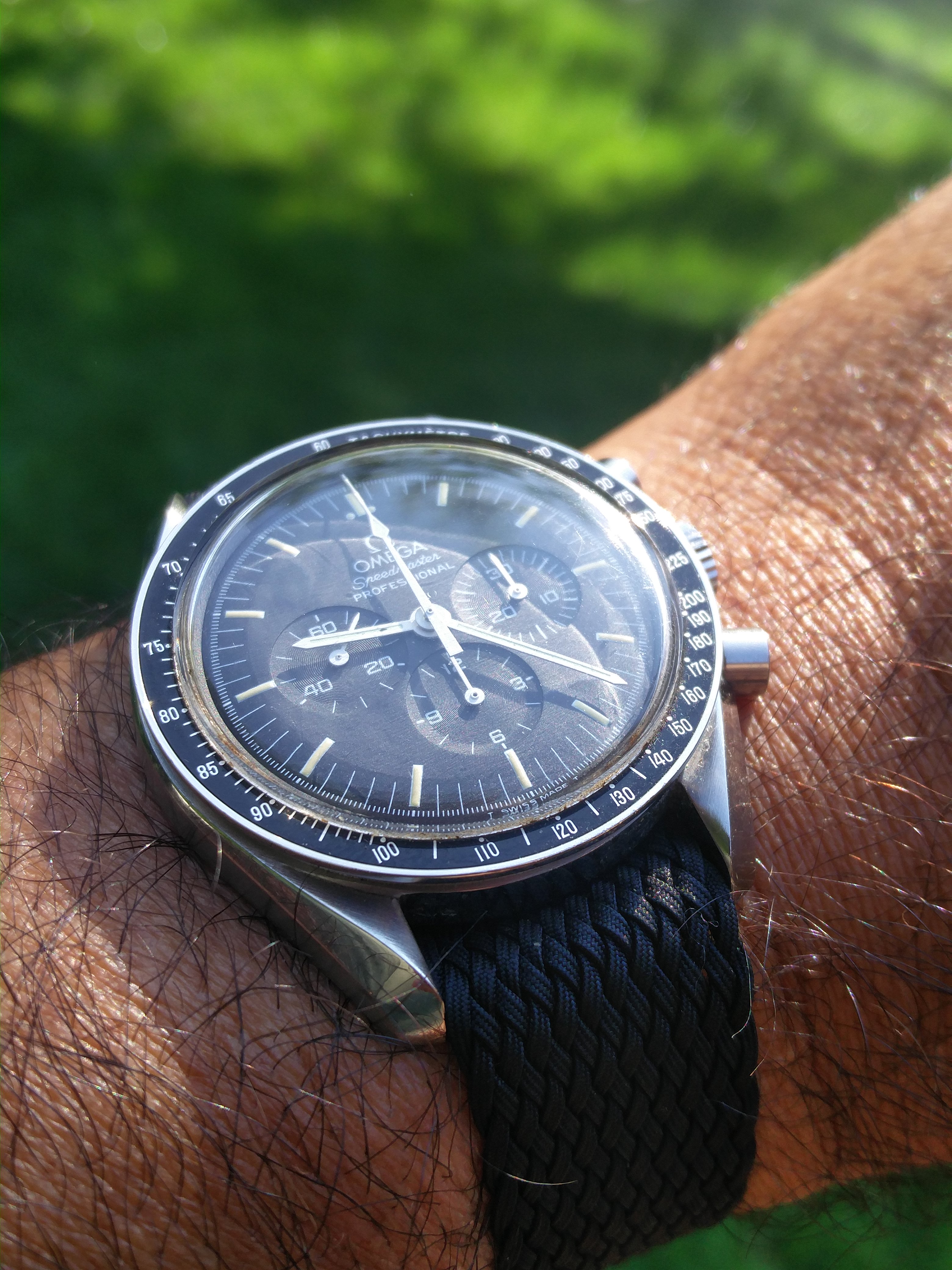 It's going to be a hot one today. Trying the 3572.50 on this mesh polyester strap. Very comfortable, but not yet sold seeing a modern speedy on anything but a steel bracelet.