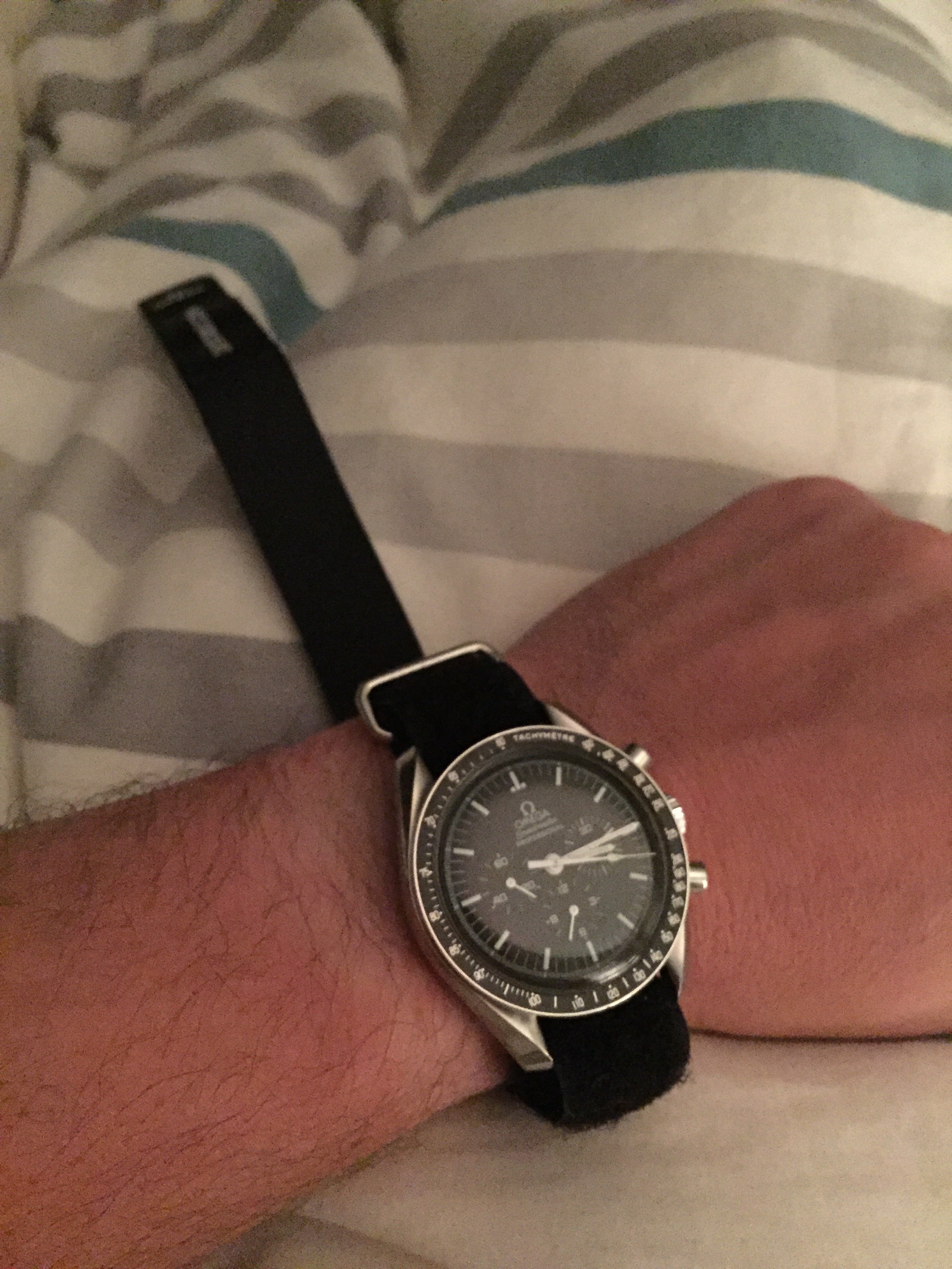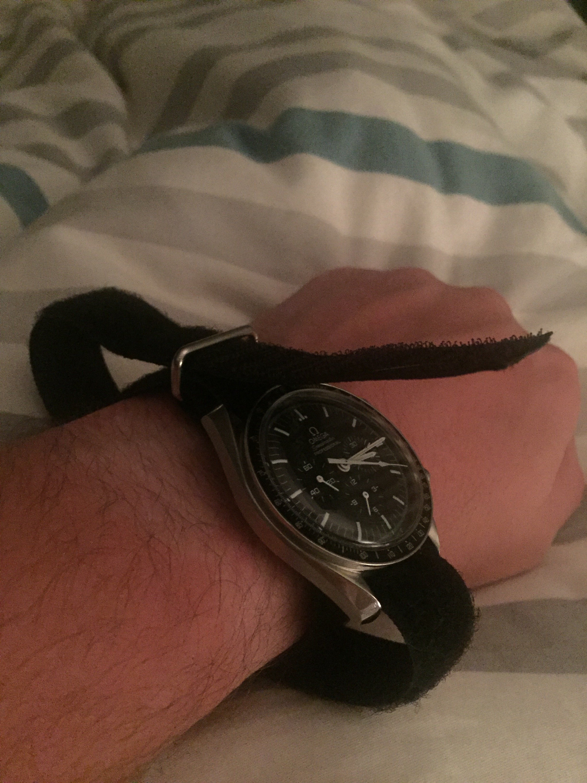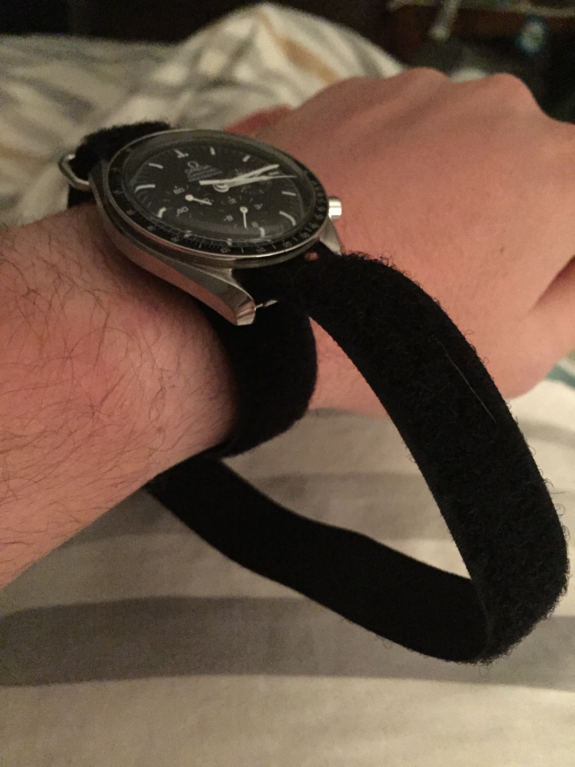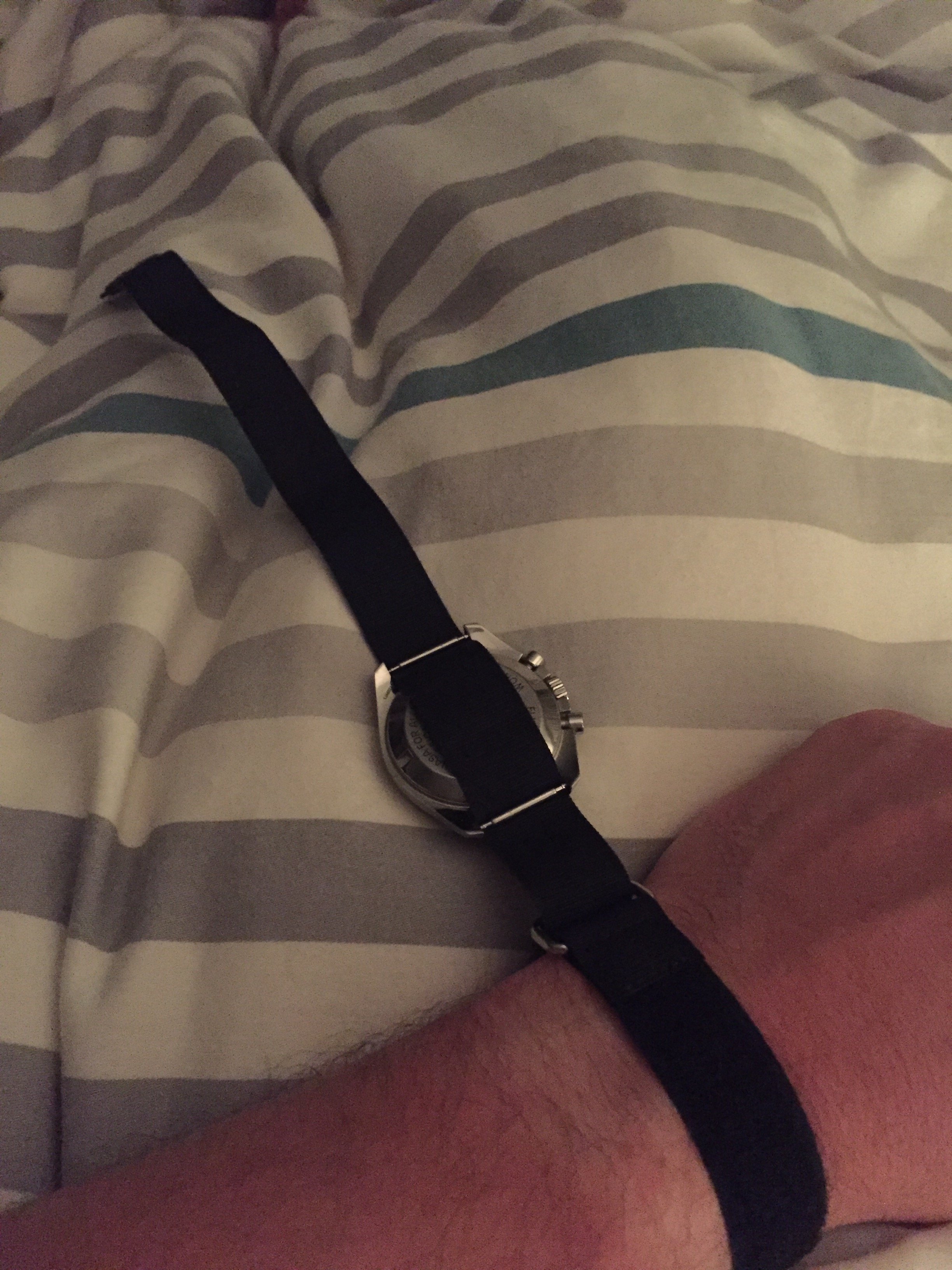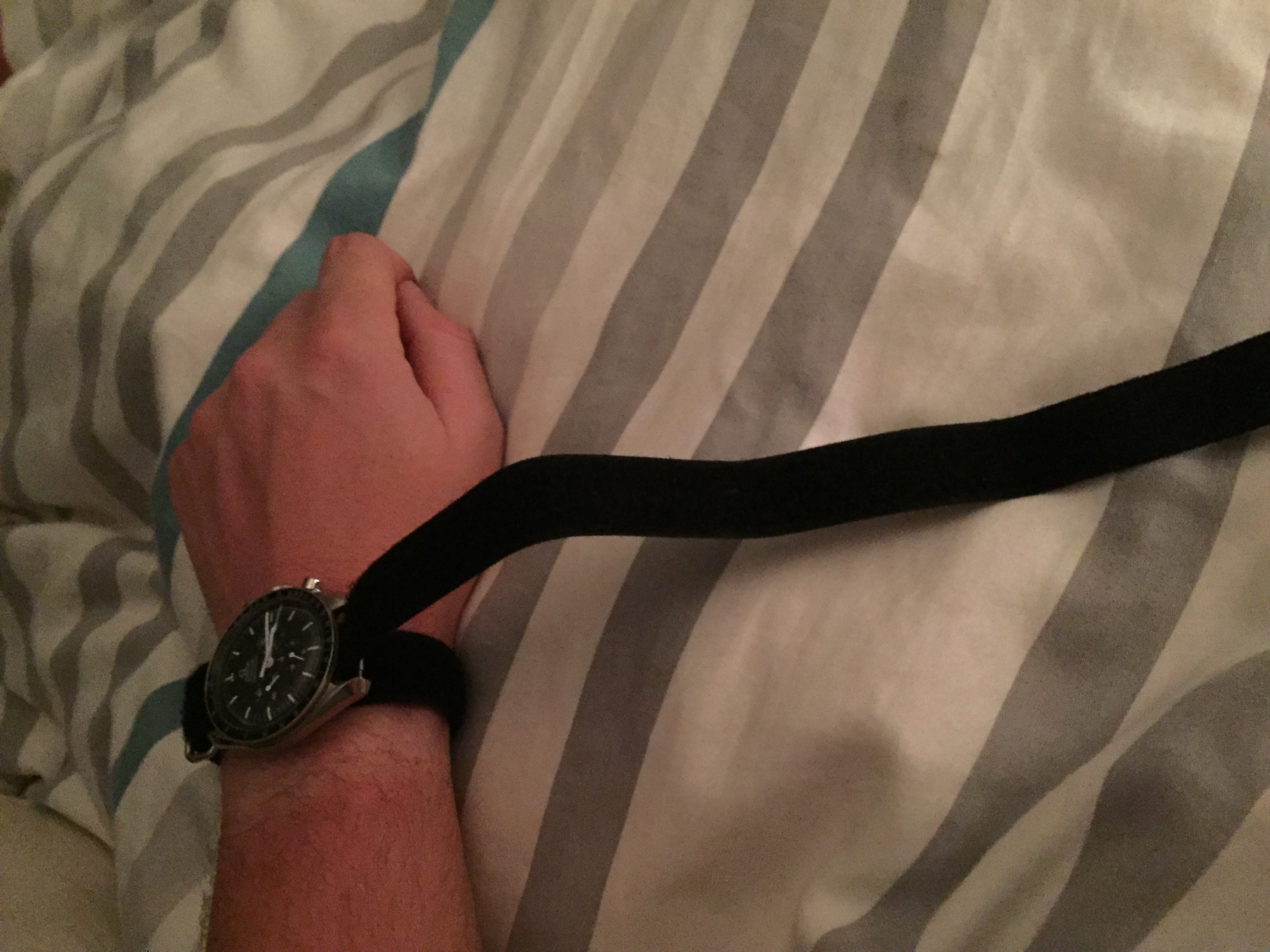 A little nasa strap action for our friend @maddog! its a tough strap to figure out so naturally I took some ambien a shot of makers, got into bed and got to work. Excuse the nipple shot.