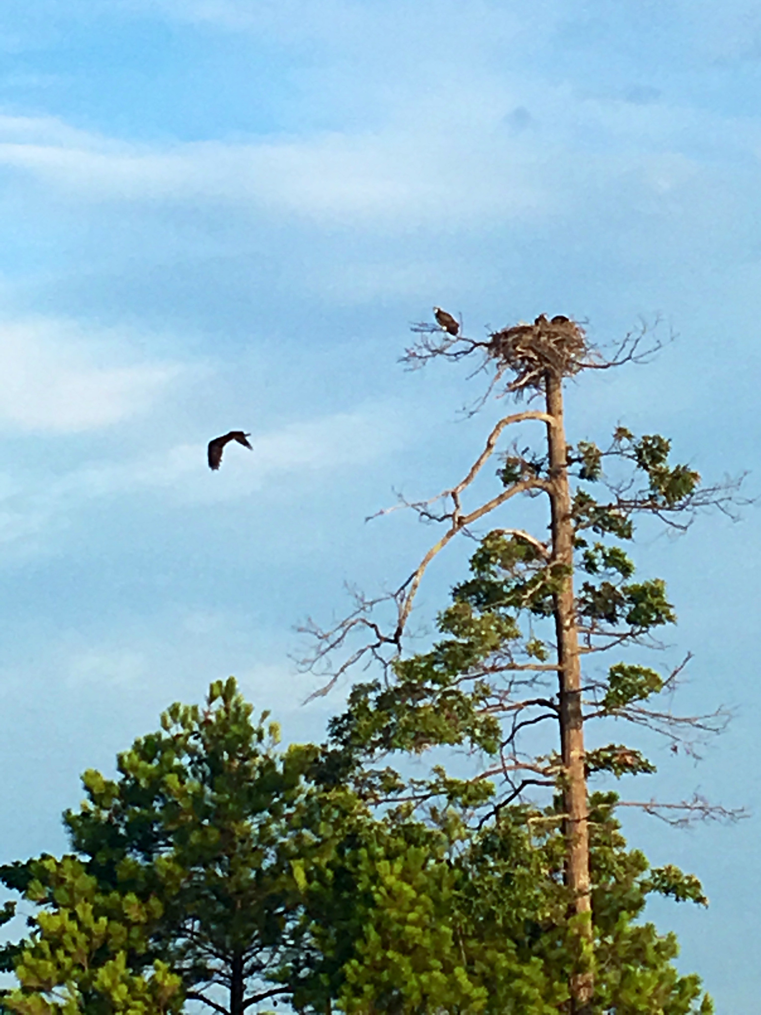 We've seen them nesting there for several years now - two chicks this year one flying and the other not quite yet. This weekend, we had the luck to see Mom execute a successful dive to snatch a fish from the water not far from their island. Amazing predators to see in action!
