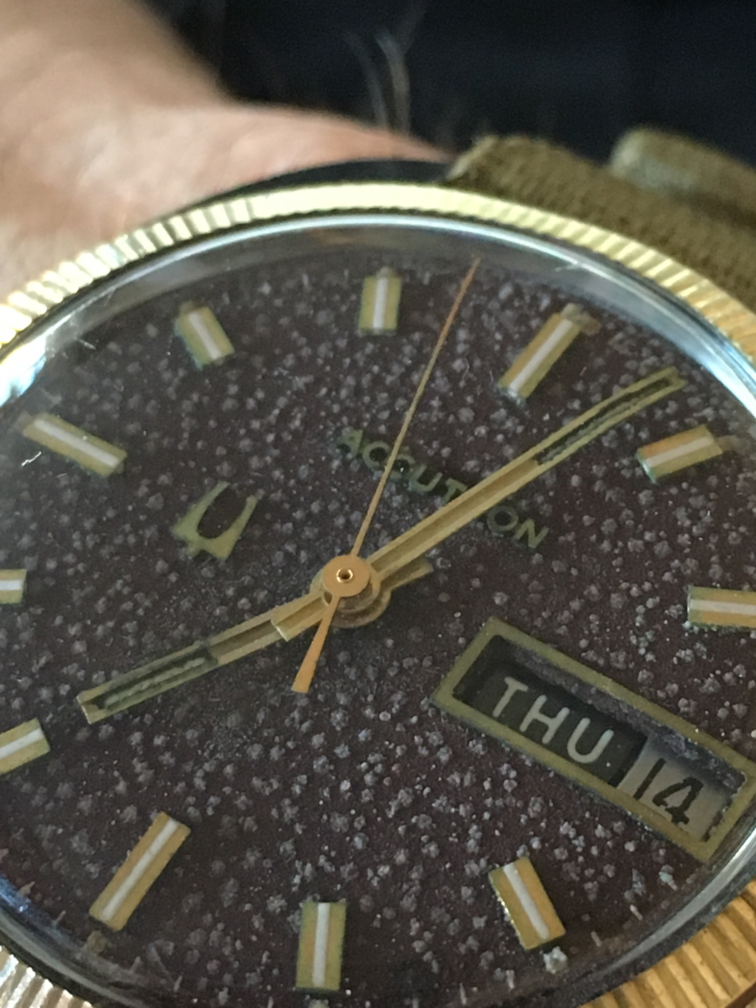 Posts 390 Likes 439 GBTRIUMPH ·Jul 14, 2016 Omega1 Good evening .. What's growing in my accutron .... Crystals? Fungus? Martian blob babies?