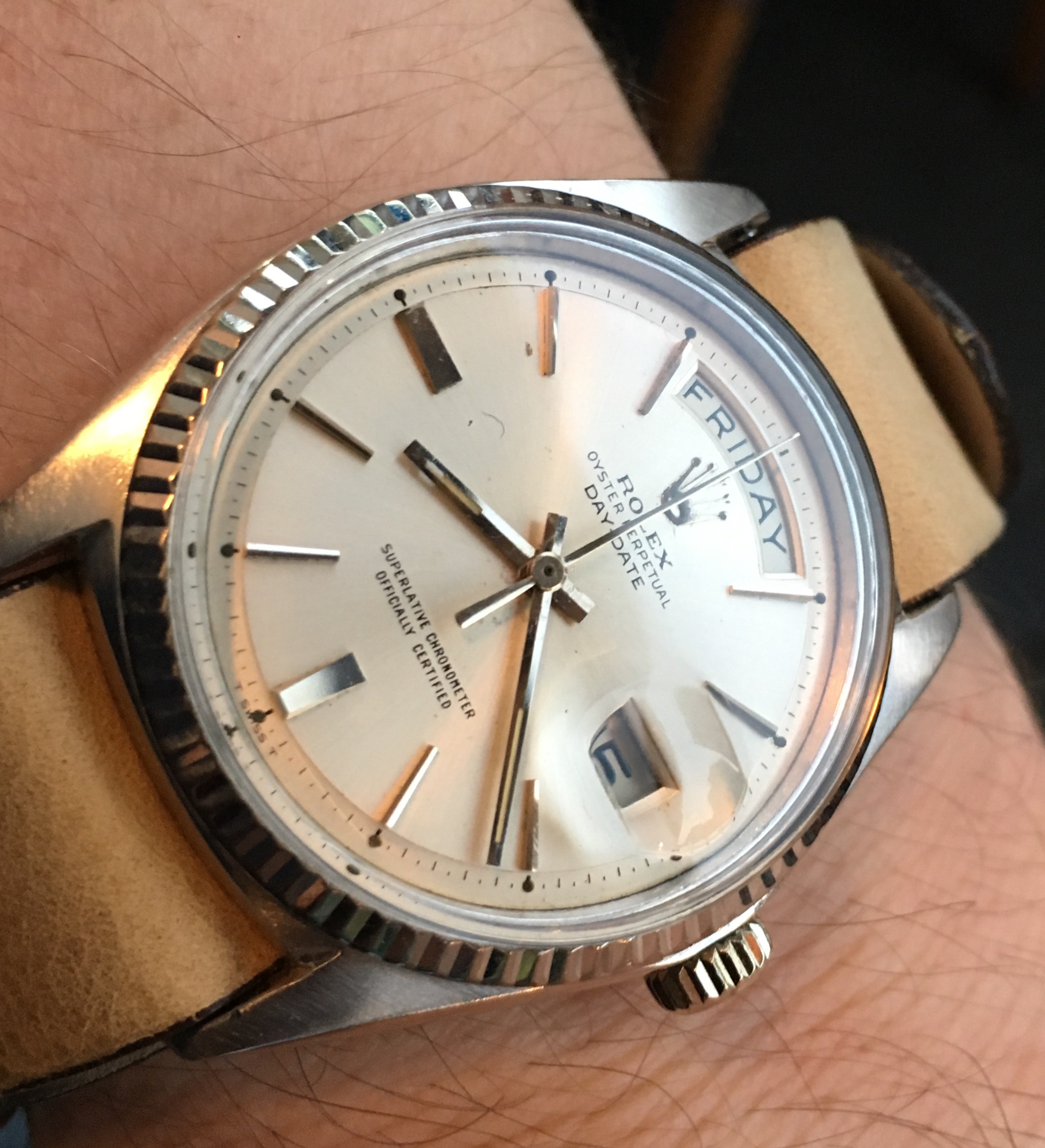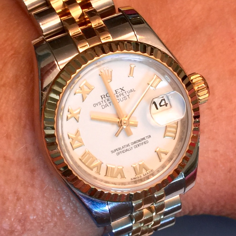 For today, my beloved wife (MacGyverette) is wearing her Rolex which just came back from servicing due to a broken rotor axel...