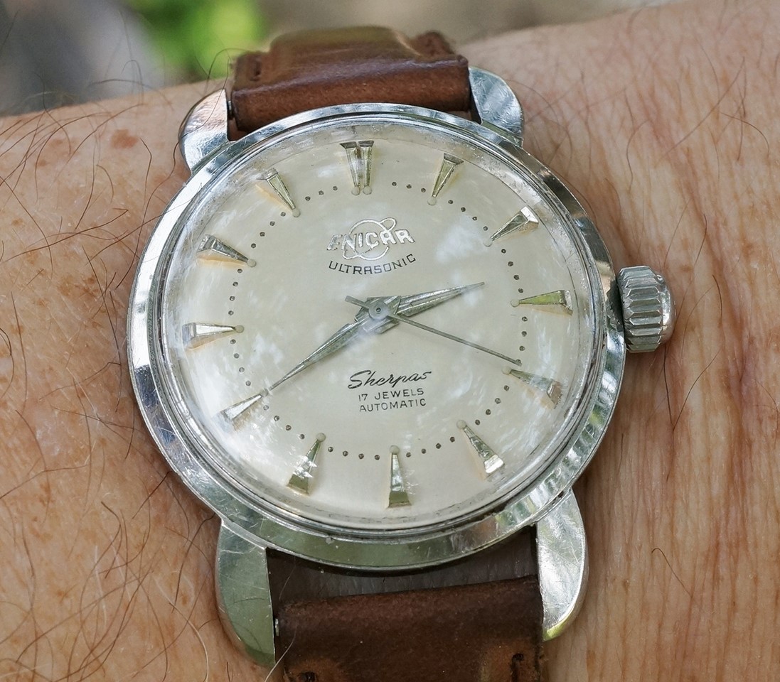 Posts 8,505 Likes 60,746 TexOmega 路Jul 16, 2016 Circa late 1956, 1st generation SeaPearl ("Sherpas" on dial, written not scripted "SeaPearl" on back, Turtle lugs). Wears big on wrist with those cool Turtle lugs.