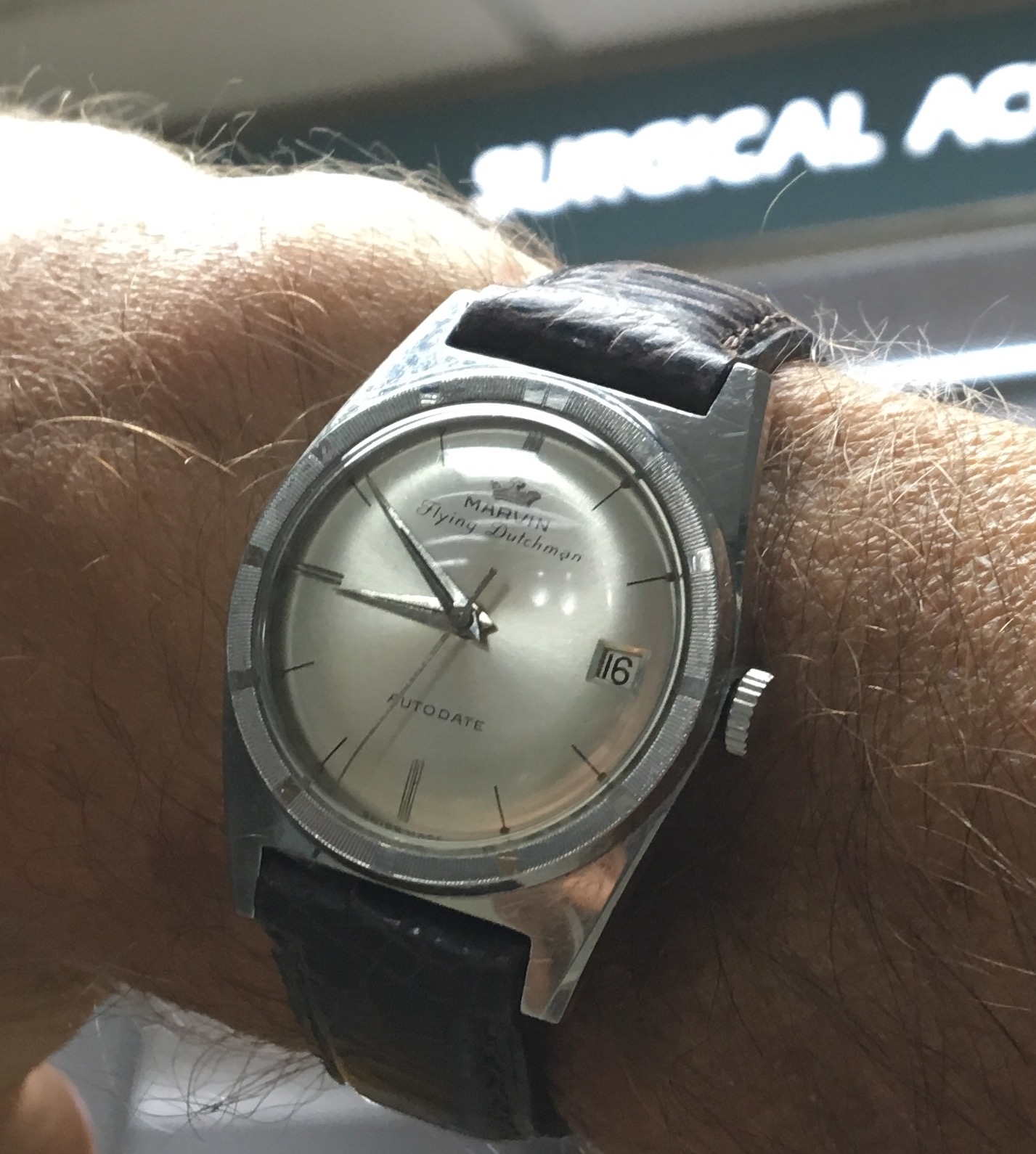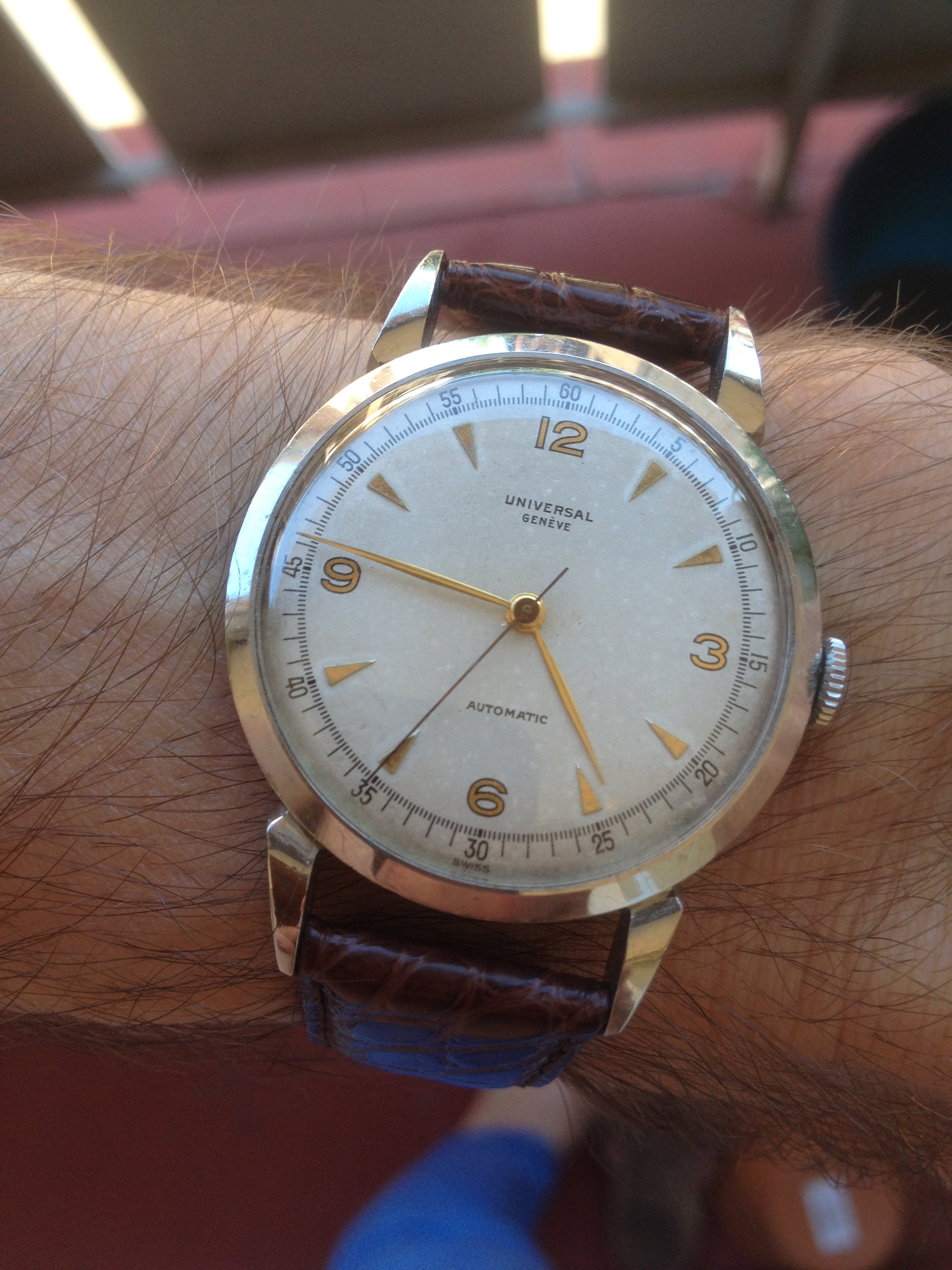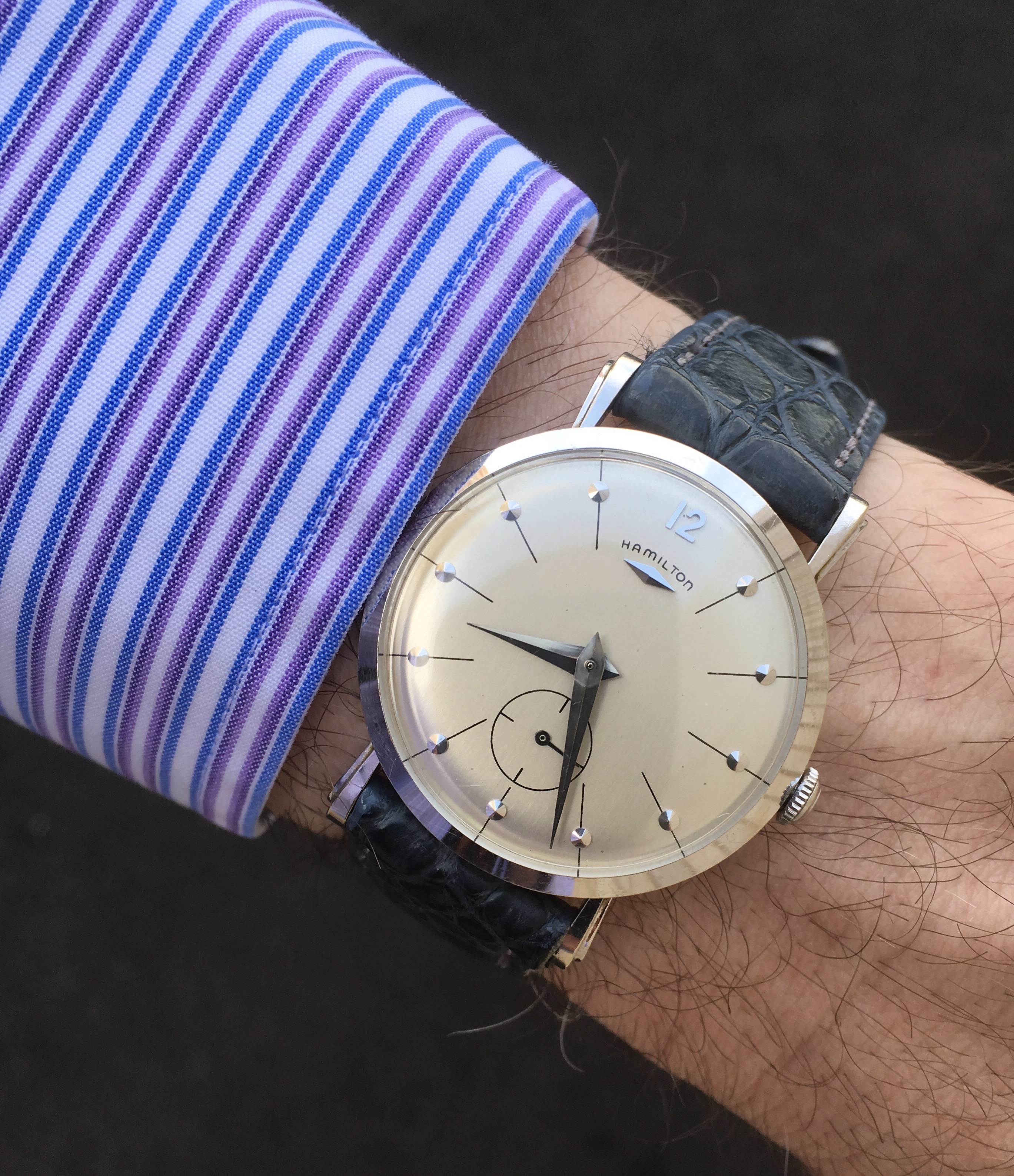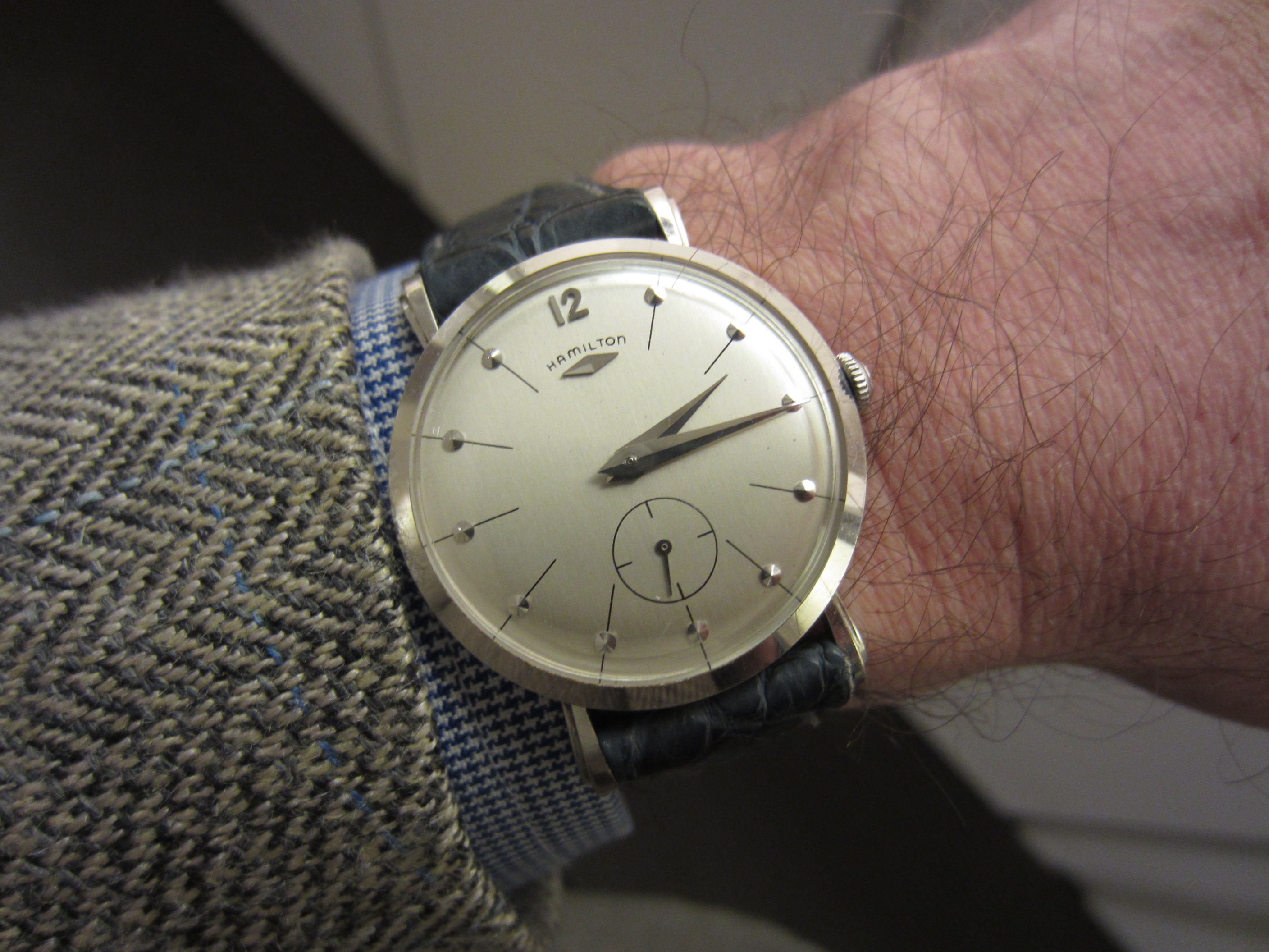 I don't wear this ca. 1960 Bradford B often enough. It reminds me of Patek in quality (really, esp. with its superb 22-jewel cal. 770). 33mm 14K white gold case (white gold not too common by then). It was not worn much, obviously. These are old pics, but it looks the same!