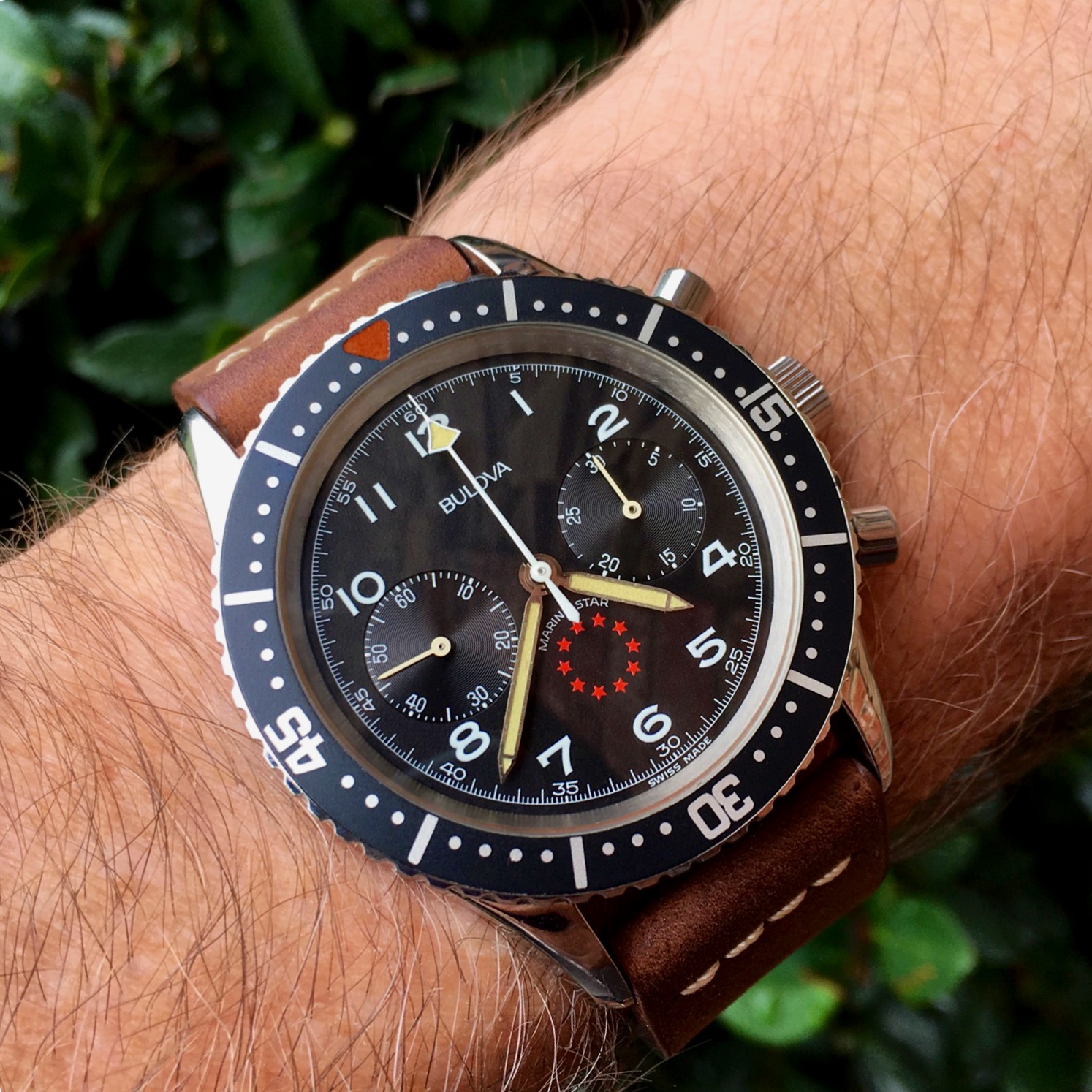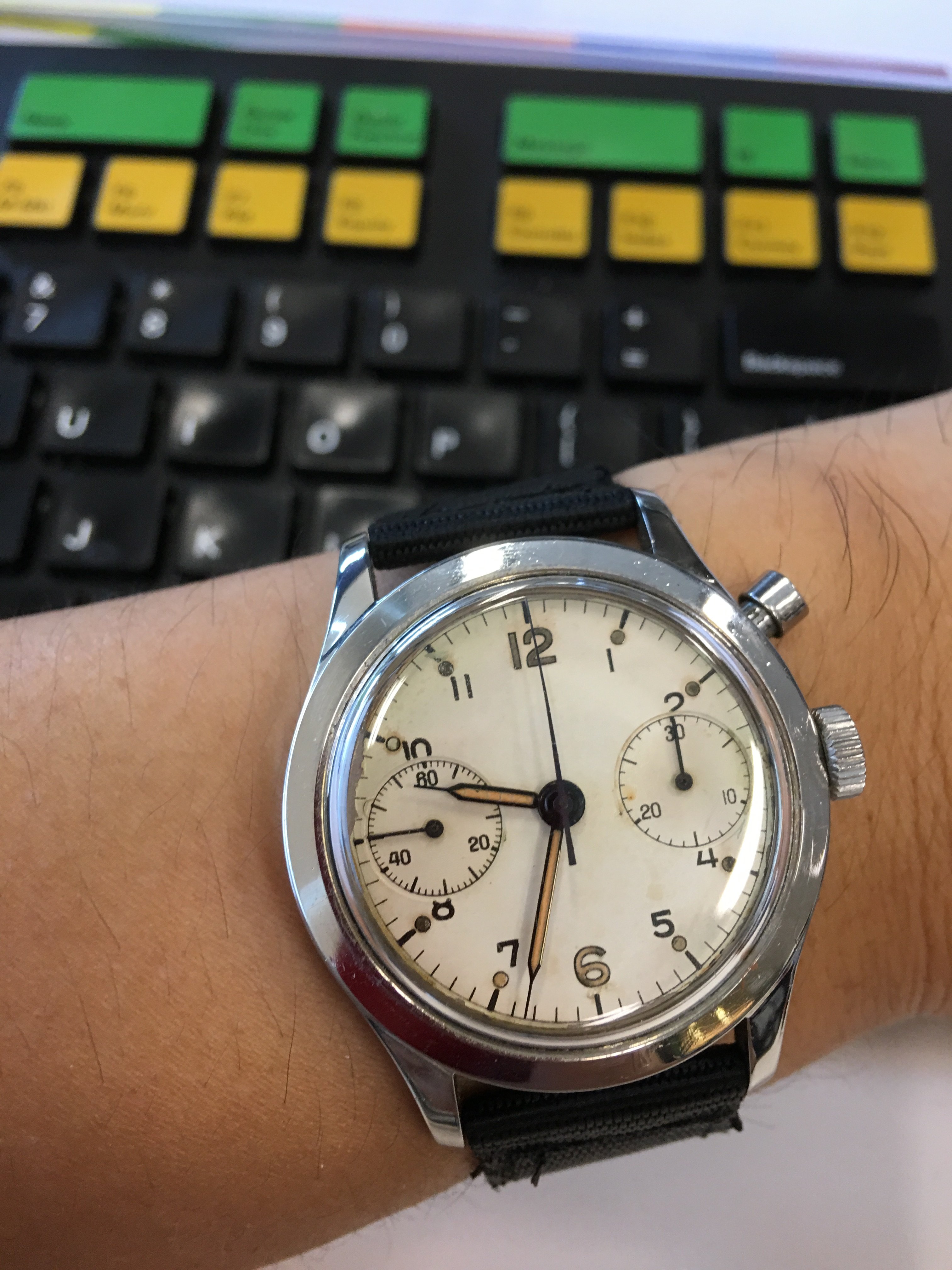 The color of dial and rehaut of this Zenith El Primero chronograph, ref. 01.0140.415, turned to an attractive petrol. Unfortunately the tachymeter bezel did not age likewise.