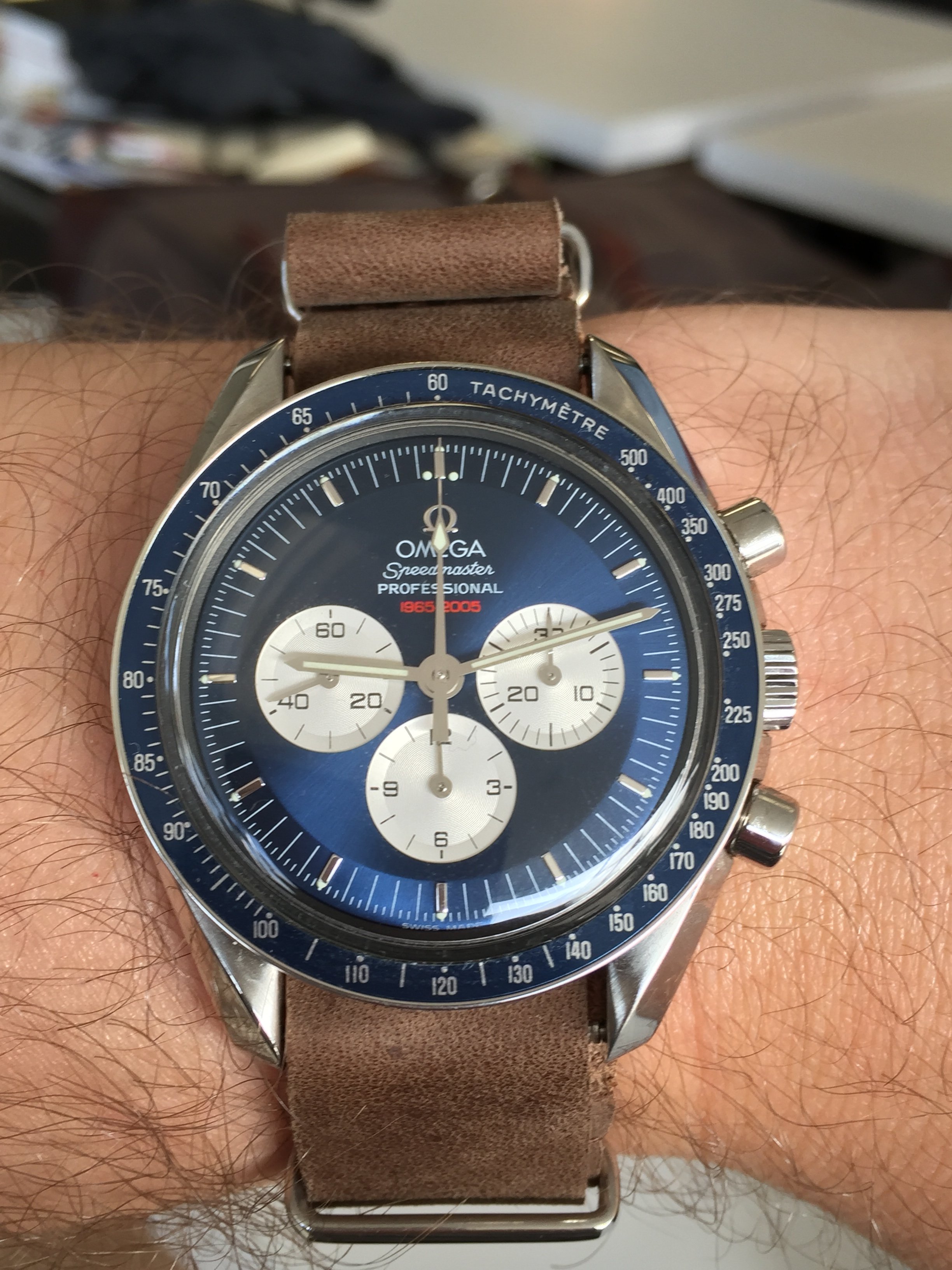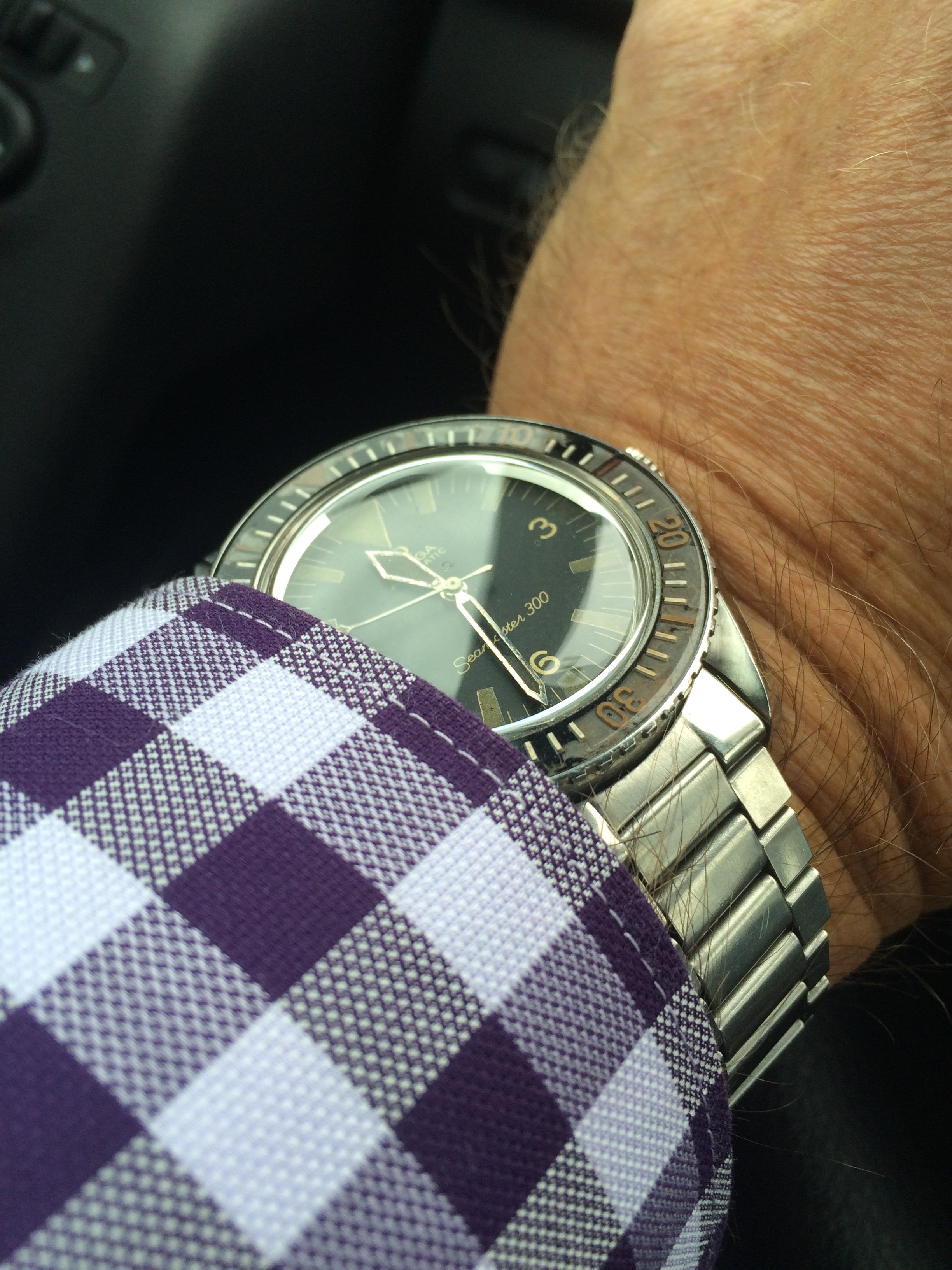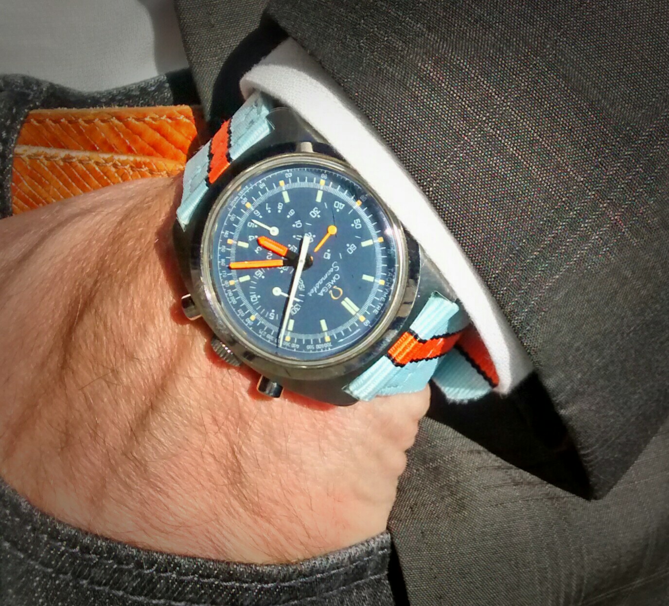 ··Not in LA anymore.Still honeymooning with this watch before we switch over to Team Omega this afternoon and Mrs.Jones and I fly off to Minneapolis for the Ryder Cup. When I bought the watch it had an improperly-sized, cheap-ish strap -- 21mm in 22mm lugs, so I found an OEM strap at a grey market dealer for a good price. Today is the first day wearing the new shoes 😀