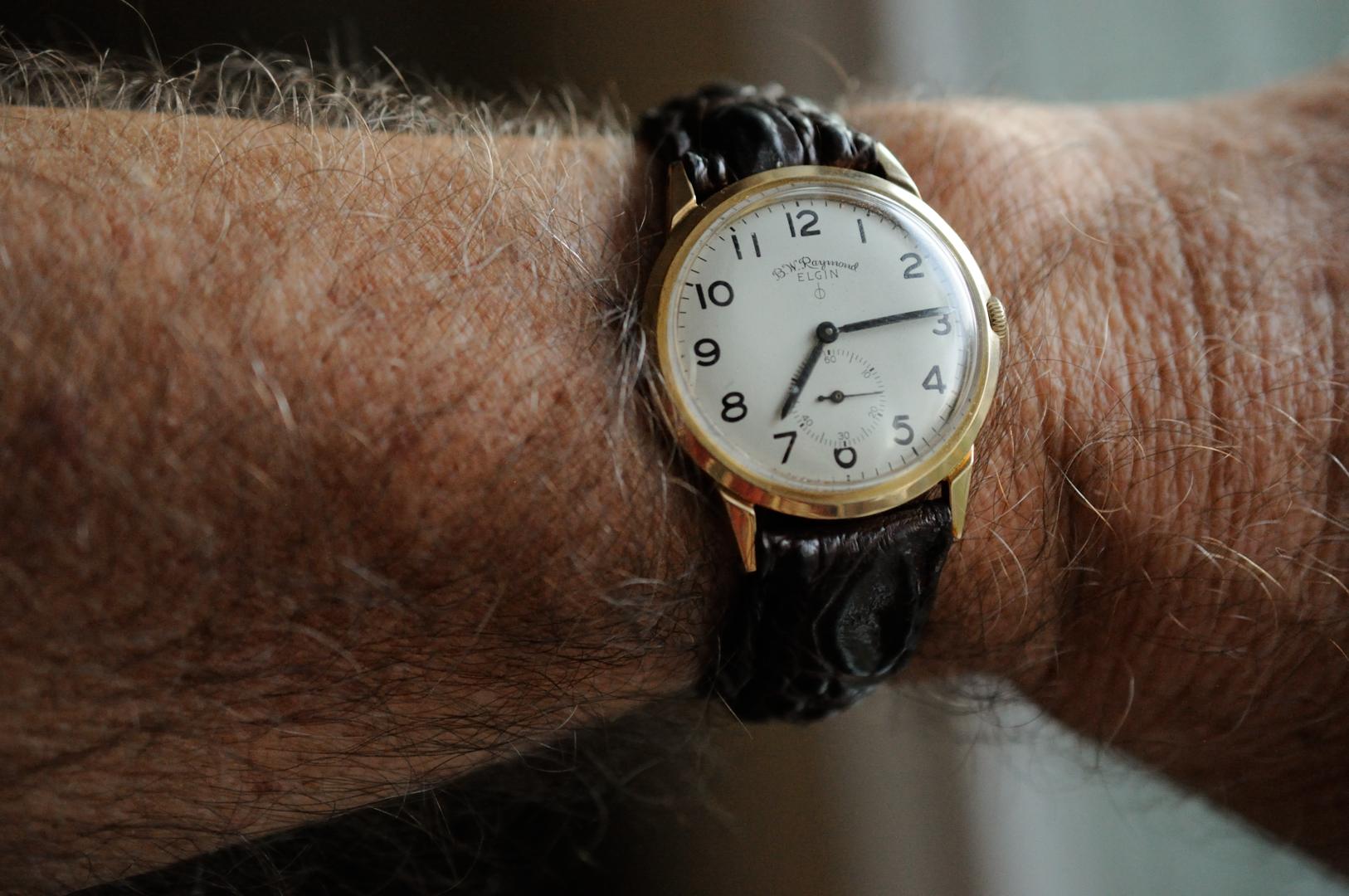 I'm killing time waiting for my wife to get ready to go out for dinner. I went through the ticking inventory for something dressy but casual and keeping with my Simple Saturday. I found this Elgin railroad watch. I hadn't worn it in a while because I didn't like the boring strap attached to it. I mounted it on this rather gnarly croc and I think it works okay.