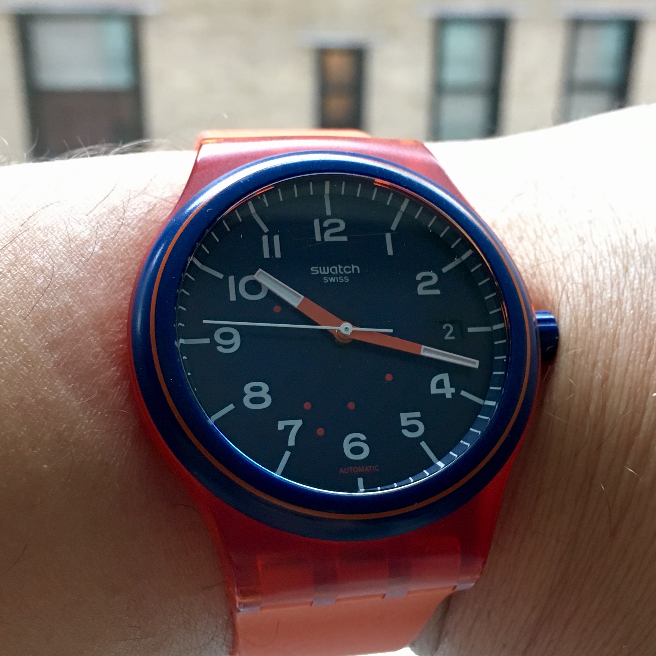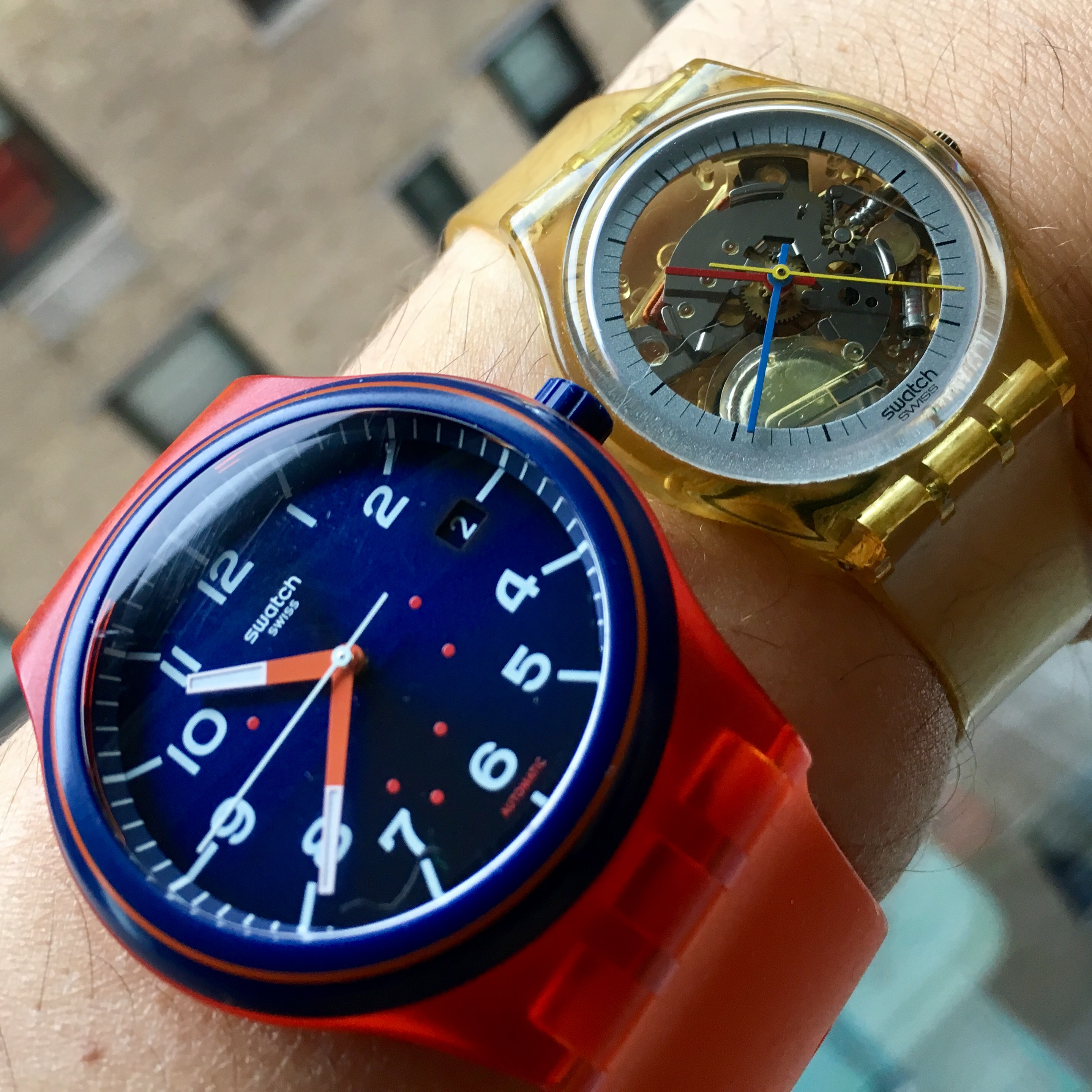 Here next to my "inviso-swatch" from 1983, a bit yellowed in its vintage state as one of the earliest swatch models. It's amazing how much larger they make these now (particularly with the Sistem51 being an auto, not quartz).