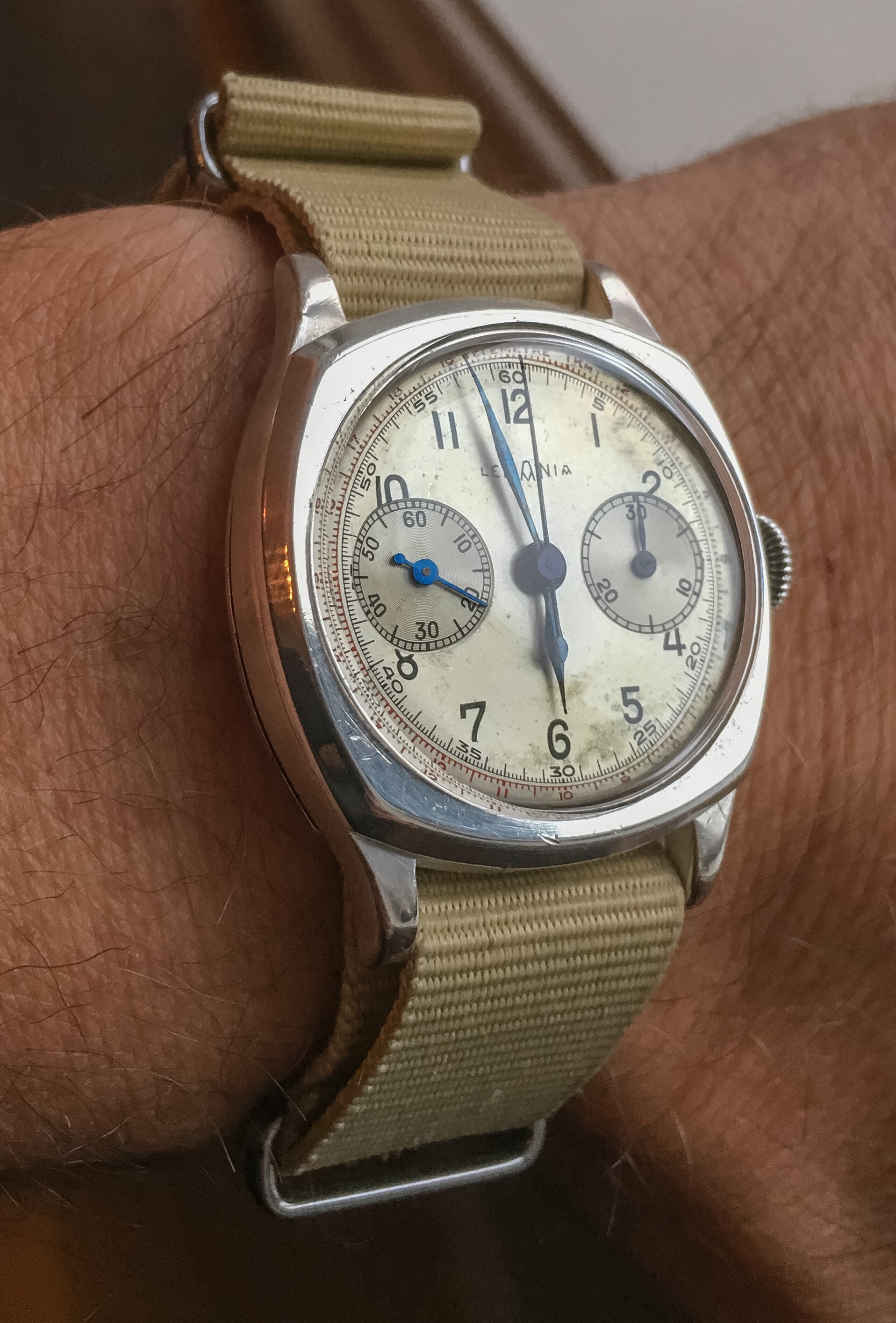 Posts 4,440 Likes 18,259 Northernman ·Oct 11, 2016·Lemaniac Poor lighting, but fresh arrival on the wrist. Lemania ch13 (aka Omega 28.9 Chrono). Early 1930s solid silver case chronograph. Fixed lugs makes for temporary NATO strap solution. 😀😀😀